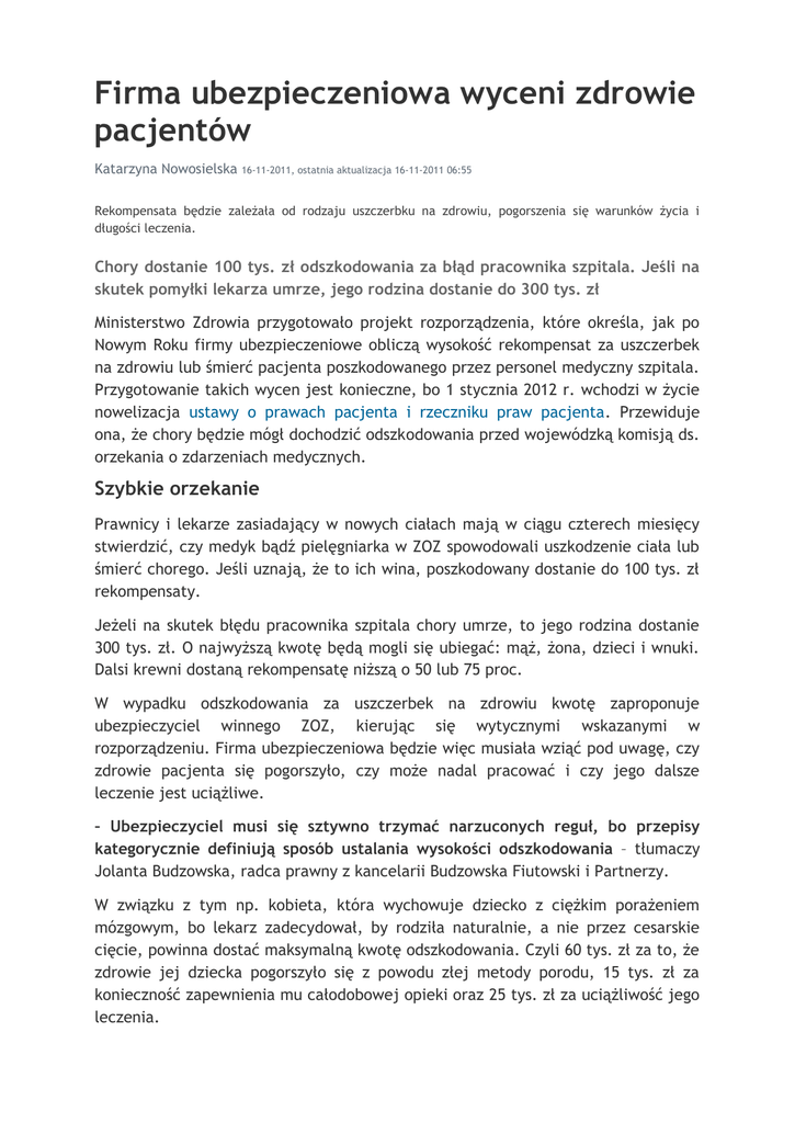 Firma ubezpieczeniowa wyceni zdrowie pacjentów Katarzyna Nowosielska 16-11-2011, ostatnia aktualizacja 16-11-2011 06:55 Rekompensata będzie zależała od rodzaju uszczerbku na zdrowiu, pogorszenia się warunków życia i długości leczenia. Chory dostanie 100 tys. zł odszkodowania za błąd pracownika szpitala. Jeśli na skutek pomyłki lekarza umrze, jego rodzina dostanie do 300 tys. zł Ministerstwo Zdrowia przygotowało projekt rozporządzenia, które określa, jak po Nowym Roku firmy ubezpieczeniowe obliczą wysokość rekompensat za uszczerbek na zdrowiu lub śmierć pacjenta poszkodowanego przez personel medyczny szpitala. Przygotowanie takich wycen jest konieczne, bo 1 stycznia 2012 r. wchodzi w życie nowelizacja ustawy o prawach pacjenta i rzeczniku praw pacjenta. Przewiduje ona, że chory będzie mógł dochodzić odszkodowania przed wojewódzką komisją ds. orzekania o zdarzeniach medycznych. Szybkie orzekanie Prawnicy i lekarze zasiadający w nowych ciałach mają w ciągu czterech miesięcy stwierdzić, czy medyk bądź pielęgniarka w ZOZ spowodowali uszkodzenie ciała lub śmierć chorego. Jeśli uznają, że to ich wina, poszkodowany dostanie do 100 tys. zł rekompensaty. Jeżeli na skutek błędu pracownika szpitala chory umrze, to jego rodzina dostanie 300 tys. zł. O najwyższą kwotę będą mogli się ubiegać: mąż, żona, dzieci i wnuki. Dalsi krewni dostaną rekompensatę niższą o 50 lub 75 proc. W wypadku odszkodowania za uszczerbek na zdrowiu kwotę zaproponuje ubezpieczyciel winnego ZOZ, kierując się wytycznymi wskazanymi w rozporządzeniu. Firma ubezpieczeniowa będzie więc musiała wziąć pod uwagę, czy zdrowie pacjenta się pogorszyło, czy może nadal pracować i czy jego dalsze leczenie jest uciążliwe. – Ubezpieczyciel musi się sztywno trzymać narzuconych reguł, bo przepisy kategorycznie definiują sposób ustalania wysokości odszkodowania – tłumaczy Jolanta Budzowska, radca prawny z kancelarii Budzowska Fiutowski i Partnerzy. W związku z tym np. kobieta, która wychowuje dziecko z ciężkim porażeniem mózgowym, bo lekarz zadecydował, by rodziła naturalnie, a nie przez cesarskie cięcie, powinna dostać maksymalną kwotę odszkodowania. Czyli 60 tys. zł za to, że zdrowie jej dziecka pogorszyło się z powodu złej metody porodu, 15 tys. zł za konieczność zapewnienia mu całodobowej opieki oraz 25 tys. zł za uciążliwość jego leczenia. Alternatywa dla sądów Aby rodzic dostał najwyższą kwotę, będzie musiał jednak udowodnić, że dziecko urodziło się chore z winy lekarza. Pacjenci chcą, że komisje mogły przyznawać większe odszkodowania. Proponujemy, aby w przypadku szkód, za które zainteresowani mieli przyznawane do tej pory w procesach cywilnych odszkodowania powyżej 100 tys. zł dawać teraz maksymalną kwotę - czyli 100 tys zł. Za mniejsze szkody trzeba przyznawać adekwatne odszkodowanie czyli np. jeśli sędzia miałby przyznać choremu 80 tyś. to niech tyle samo orzeknie wojewódzka komisja – mówi Adam Sandauer, prezes Stowarzyszenia Pacjentów Primum Non Nocere. Pacjent, który będzie chciał dostać wyższe odszkodowanie, nadal więc będzie musiał walczyć o nie przed sądem w procesie cywilnym. Sądy często przyznają odszkodowania sięgające nawet 0,5 – 1 mln zł, ale procesy są skomplikowane i toczą się latami. Komisje wojewódzkie będą więc alternatywą dla długoletnich procesów sądowych. Każdy jednak, kto zdecyduje się wnieść sprawę do wojewódzkiej komisji i skorzystać z odszkodowania, straci możliwość dochodzenia roszczeń przed sądem. Źródło: „Rzeczpospolita” z dnia 16.11.2011 r. http://www.rp.pl/artykul/752058.html