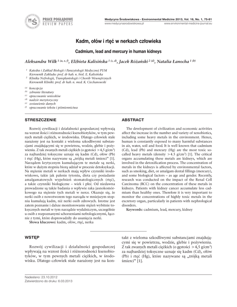 Medycyna Środowiskowa - Environmental Medicine 2013, Vol. 16, No. 1, 75-81 www.environmental-medicine-journal.eu www.medycynasrodowiskowa.pl Kadm, ołów i rtęć w nerkach człowieka Cadmium, lead and mercury in human kidneys Aleksandra Wilk 1 (a, e, f), Elżbieta Kalisińska 1 (c, d), Jacek Różański 2 (d), Natalia Łanocha 1 (b) 1 2 (a) (b) (c) (d) (e) (f) Katedra i Zakład Biologii i Parazytologii Medycznej PUM Kierownik Zakładu: prof. dr hab. n. biol. E. Kalisińska Klinika Nefrologii, Transplantologii i Chorób Wewnętrznych Kierownik Kliniki: prof. dr hab. n. med. K. Ciechanowski koncepcja zebranie literatury opracowanie wniosków nadzór merytoryczny zestawienie danych opracowanie tekstu i piśmiennictwa STRESZCZENIE ABSTRACT Rozwój cywilizacji i działalności gospodarczej wpływają na wzrost ilości i różnorodności ksenobiotyków, w tym pewnych metali ciężkich, w środowisku. Dlatego człowiek stale narażony jest na kontakt z wieloma szkodliwymi substancjami znajdującymi się w powietrzu, wodzie, glebie i pożywieniu. Z tak zwanych metali ciężkich (o gęstości ¤4,5 g/cm3) za najbardziej toksyczne uznaje się kadm (Cd), ołów (Pb) i rtęć (Hg), które nazywane są „trójką metali śmierci” [1]. Narządem krytycznym kumulującym te metale są nerki, które w dużym stopniu biorą udział w procesie detoksykacji. Na stężenie metali w nerkach mają wpływ czynniki środowiskowe, takie jak palenie tytoniu, dieta czy posiadanie amalgamatowych wypełnień stomatologicznych (rtęć), a także czynniki biologiczne – wiek i płeć. Od niedawna prowadzone są także badania o wpływie raka jasnokomórkowego na stężenie tych metali w nerce. Okazuje się, że nerki osób z nowotworem tego narządu w mniejszym stopniu kumulują kadm, niż nerki osób zdrowych. Istotne jest zatem poznanie i dalsze monitorowanie stężeń wybitnie toksycznych metali w tym narządzie wydalniczym, szczególnie u osób z rozpoznanymi schorzeniami nefrologicznymi, łącznie z tymi, które doprowadziły do usunięcia nerki. Słowa kluczowe: kadm, ołów, rtęć, nerka The development of civilization and economic activities affect the increase in the number and variety of xenobiotics, including some heavy metals in the environment. Hence, human is constantly exposed to many harmful substances in air, water, soil and food. It is well known that cadmium (Cd), lead (Pb) and mercury (Hg) are the most toxic socalled heavy metals (density ¤4.5 g/cm3) [1]. The critical organs accumulating these metals are kidneys, which are involved in the detoxification process. The concentration of metals in the kidneys is affected by environmental factors, such as smoking, diet, or amalgam dental fillings (mercury), and some biological factors – as age and gender. Recently, research was conducted on the impact of the Renal Cell Carcinoma (RCC) on the concentration of these metals in kidneys. Patients with kidney cancer accumulate less cadmium than healthy ones. Therefore it is very important to monitor the concentrations of highly toxic metals in the excretory organ, particularly in patients with nephrological disorders. Keywords: cadmium, lead, mercury, kidney WSTĘP takt z wieloma szkodliwymi substancjami znajdującymi się w powietrzu, wodzie, glebie i pożywieniu. Z tak zwanych metali ciężkich (o gęstości ¤4,5 g/cm3) za najbardziej toksyczne uznaje się kadm (Cd), ołów (Pb) i rtęć (Hg), które nazywane są „trójką metali śmierci” [1]. Rozwój cywilizacji i działalności gospodarczej wpływają na wzrost ilości i różnorodności ksenobiotyków, w tym pewnych metali ciężkich, w środowisku. Dlatego człowiek stale narażony jest na konNadesłano: 23.10.2012 Zatwierdzono do druku: 6.03.2013 76 Medycyna Środowiskowa - Environmental Medicine 2013, Vol. 16, No. 1 Aleksandra Wilk i wsp.: Kadm, ołów i rtęć w nerkach człowieka Metale wnikają do organizmu człowieka zarówno drogą pokarmową, skórną, jak i oddechową. Niekiedy wprowadzane są celowo, na przykład wraz z amalgamatami stomatologicznymi (rtęć) i dymem papierosowym (kadm) [2]. Poza przypadkami narażenia zawodowego, większość ludzi podlega długotrwałemu oddziaływaniu niewielkich stężeń metali ciężkich (w tym Cd, Pb i Hg), w dużym stopniu mających antropogeniczne pochodzenie. W przypadku ołowiu, do istotnych jego źródeł antropogenicznych zalicza się rozwój wielu gałęzi przemysłu, między innymi wydobywczego, przeróbki rud ołowiu i innych metali kolorowych oraz rozwój motoryzacji. W naszym kraju w 2007 roku do środowiska wyemitowano prawie 553 tony ołowiu. Najwięcej tego metalu pochodzi z procesów spalania w przemyśle, co stanowi połowę całej ilości. Inne ważniejsze źródła to spalanie w sektorach komunalnym i mieszkaniowym, procesy produkcyjne oraz transport drogowy [3]. Pierwiastki te utrzymują się w organizmie człowieka przez pewien czas, podlegając kumulacji w określonych narządach, m.in. w nerkach. Narząd ten jest bardzo wrażliwy na ich działanie, a część korowa wykazuje selektywne zdolności kumulacji metali ciężkich. Zarówno strukturalnie, funkcjonalnie, jak również pod względem stężenia metali toksycznych część korowa nerki różni się od rdzeniowej [4]. Publikacje dotyczące koncentracji metali w nerkach pochodzących od osób żyjących dostarczają cennych informacji, uzyskiwanych podczas wywiadu z pacjentem na temat jego trybu i środowiska życia. Do badań nefrotoksykologicznych często wykorzystuje się bioptaty, jak również usunięte, patologicznie zmienione narządy. Możliwe jest wówczas dokonanie oceny związków między czynnikami biologicznymi, środowiskowymi (w tym narażeniem zawodowym) a wielkością stężeń metali w nerkach. W ostatnich latach wykazano związek między zawartością metali ciężkich w nerkach a występującym w tym narządzie nowotworem – rakiem nerkowokomórkowym (ang. Renal Cell Carcinoma) [5, 6]. W pracy