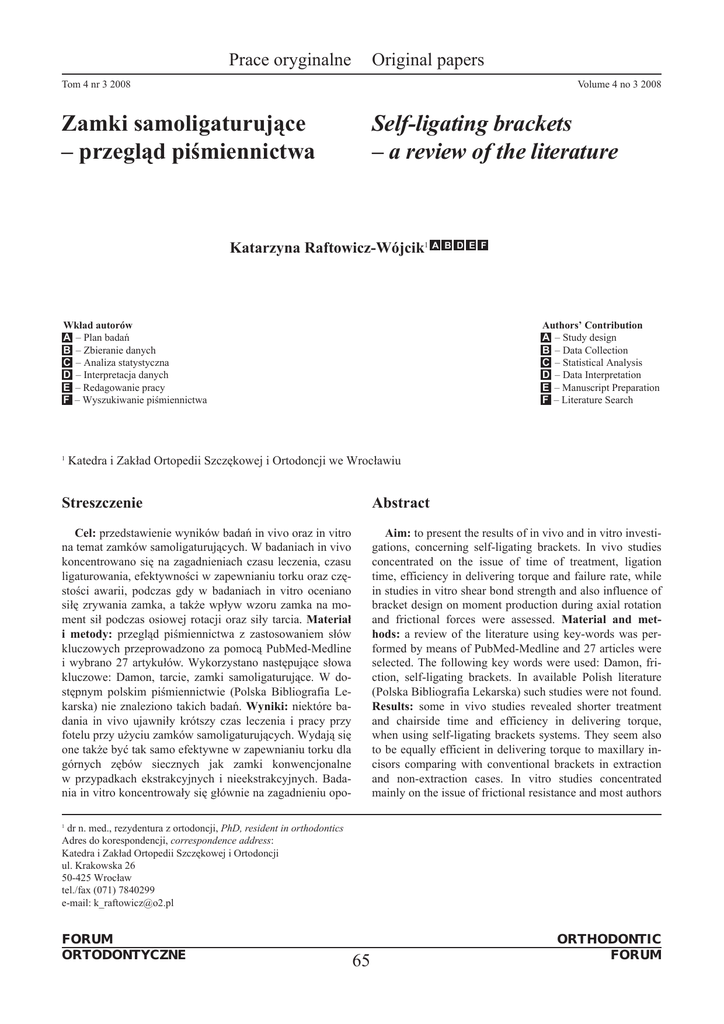 Prace oryginalne Original papers Tom 4 nr 3 2008 Volume 4 no 3 2008 Zamki samoligaturujące – przegląd piśmiennictwa Self-ligating brackets – a review of the literature Katarzyna Raftowicz-Wójcik1 A Wkład autorów A – Plan badań B – Zbieranie danych C – Analiza statystyczna D – Interpretacja danych E – Redagowanie pracy F – Wyszukiwanie piśmiennictwa 1 B D E F Authors’ Contribution A – Study design B – Data Collection C – Statistical Analysis D – Data Interpretation E – Manuscript Preparation F – Literature Search Katedra i Zakład Ortopedii Szczękowej i Ortodoncji we Wrocławiu Streszczenie Abstract Cel: przedstawienie wyników badań in vivo oraz in vitro na temat zamków samoligaturujących. W badaniach in vivo koncentrowano się na zagadnieniach czasu leczenia, czasu ligaturowania, efektywności w zapewnianiu torku oraz częstości awarii, podczas gdy w badaniach in vitro oceniano siłę zrywania zamka, a także wpływ wzoru zamka na moment sił podczas osiowej rotacji oraz siły tarcia. Materiał i metody: przegląd piśmiennictwa z zastosowaniem słów kluczowych przeprowadzono za pomocą PubMed-Medline i wybrano 27 artykułów. Wykorzystano następujące słowa kluczowe: Damon, tarcie, zamki samoligaturujące. W dostępnym polskim piśmiennictwie (Polska Bibliografia Lekarska) nie znaleziono takich badań. Wyniki: niektóre badania in vivo ujawniły krótszy czas leczenia i pracy przy fotelu przy użyciu zamków samoligaturujących. Wydają się one także być tak samo efektywne w zapewnianiu torku dla górnych zębów siecznych jak zamki konwencjonalne w przypadkach ekstrakcyjnych i nieekstrakcyjnych. Badania in vitro koncentrowały się głównie na zagadnieniu opo- Aim: to present the results of in vivo and in vitro investigations, concerning self-ligating brackets. In vivo studies concentrated on the issue of time of treatment, ligation time, efficiency in delivering torque and failure rate, while in studies in vitro shear bond strength and also influence of bracket design on moment production during axial rotation and frictional forces were assessed. Material and methods: a review of the literature using key-words was performed by means of PubMed-Medline and 27 articles were selected. The following key words were used: Damon, friction, self-ligating brackets. In available Polish literature (Polska Bibliografia Lekarska) such studies were not found. Results: some in vivo studies revealed shorter treatment and chairside time and efficiency in delivering torque, when using self-ligating brackets systems. They seem also to be equally efficient in delivering torque to maxillary incisors comparing with conventional brackets in extraction and non-extraction cases. In vitro studies concentrated mainly on the issue of frictional resistance and most authors dr n. med., rezydentura z ortodoncji, PhD, resident in orthodontics Adres do korespondencji, correspondence address: Katedra i Zakład Ortopedii Szczękowej i Ortodoncji ul. Krakowska 26 50-425 Wrocław tel./fax (071) 7840299 e-mail: [email protected] 1 FORUM ORTODONTYCZNE 65 ORTHODONTIC FORUM Prace oryginalne Original papers Tom 4 nr 3 2008 Volume 4 no 3 2008 ru tarcia i większość autorów stwierdziła, że zamki samoligaturujące wykazywały mniejsze tarcie w porównaniu z zamkami ligaturowanymi konwencjonalnie. Wnioski: na podstawie przedstawionego przeglądu piśmiennictwa można wywnioskować, że systemy zamków samoligaturujących wydają się być obiecującym rozwiązaniem, redukującym opór tarcia, co jest szczególnie istotne w początkowych fazach leczenia i w przypadkach ekstrakcyjnych, gdzie jest wykorzystywana mechanika ślizgowa. Jednakże ich implikacje kliniczne nie są całkowicie jasne, dlatego wymagane są dalsze badania. (Forum Ortod. 2008; 4: 65 71 ). Nadesłano: 4.04.2008 Przyjęto do druku: 17.06.2008 found, that self-ligating brackets exhibited lower friction in comparison to conventionally ligated brackets. Conclusion: on the basis of the presented literature review it may be concluded, that self-ligating brackets systems seem to be a promising solution, reducing a frictional resistance, which is specially important in the initial stages of treatment and in extraction cases, where the sliding mechanics is used. However their clinical implications are not totally clear, thus further studies are required. (Orthod. Forum 2008; 4: 65 - 71). Received: 4.04.2008 Accepted: 17.06.2008 Key words: Damon friction self-ligating brackets Słowa kluczowe: Damon tarcie zamki samoligaturujące Wstęp Introduction Pierwszy zamek samoligaturujący – Russell Lock – został opisany w 1935 roku. Od tego czasu ciągle pojawiały się nowe wzory, wprowadzone przez różnych producentów, od Ormco Edgelock w 1972, Forestadent Mobil-Lock i Orec Speed w 1980, `A` Company Activa w 1986, Adenta Time w 1994, Ormco Twin Lock w 1998, Ormco/`A` Co Damon 2 i GAC In-Ovation w 2000, GAC In-Ovation R i Adenta Evolution LT w 2002 roku (1, 2). Ostatnio dołączyły zamki SmartClip I Damon 3, które pojawiły się w 2004 roku (3). Zamki samoligaturujące mają wbudowaną metalową powierzchnię do slotu zamka, która jest określana jako klapka albo zasuwka. Dzielą się na aktywne – z klapką, która może być dociskana do łuku i pasywne z zasuwką (1, 2). Przykładami w grupie aktywnej jest zamek In-Ovation „R” oraz Time, a przykładami zamków pasywnych są Damon i SmartClip (4). Celem tej pracy było przedstawienie wyników badań in vivo oraz in vitro, dotyczących zamków samoligaturujących. W badaniach in vivo koncentrowano się na zagadnieniach czasu leczenia, czasu ligaturowania, efektywności w zapewnianiu torku oraz częstości awarii, podczas gdy w badaniach in vitro oceniano siłę zrywania zamka, a także wpływ wzoru zamka na moment sił podczas osiowej rotacji oraz siły tarcia. The first self-ligating bracket – the Russell Lock edgewise attachment – was described in 193
