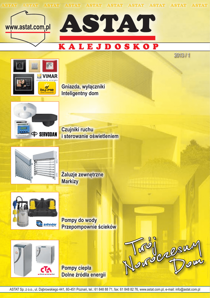 ASTA TA AT AST STAT AT AS STA TAT T AST STAT AT ASTA AS TAT T AST STAT AT ASTA AS TAT T AST STAT ASTA TAT T ASTAT K A L E J D O S K O P 2013 / 1 Gniazda, wyłączniki Inteligentny dom Czujniki ruchu i sterowanie oświetleniem Żaluzje zewnętrzne Markizy Pompy do wody Przepompownie ścieków Climate Cold Heat Pompy ciepła Dolne źródła energii j y ó n w T oczes m w o N Do ASTAT Sp. z o.o., ul. Dąbrowskiego 441, 60-451 Poznań, tel.: 61 848 88 71, fax: 61 848 82 76, www.astat.com.pl, e-mail: [email protected] ASTAT 2 ASTAT ASTAT ASTAT ASTAT ASTAT ASTAT ASTAT ASTAT ASTAT NOWOCZESNE ROZWIĄZANIA DLA DOMU TERMOSTAT Umożliwia kontrolę temperatury atury w danym pomieszczeniu (strona 10, 29). Nowoczesnoœæ ŻALUZJE ZEWNĘTRZNE ykor korzy zystannie światła świ a słonecznego słoneczneg słon negoo (strona neg (str strona t na 20). 20)). 20 Gwarantują maksymalne wykorzystanie MI ZEW ZEWN NĘTRZN RZNYM YMI STEROWANIE ŻALUZJAMI ZEWNĘTRZNYMI ener en erggii (strona (stron (st ronaa 10 1 i 22). Pozwalają na oszczędność energii GNIAZDA I ŁĄCZNIKI Bogaty wybór urządzeń i ramek ozdobnych umożliwia dobranie odpowiedniego produktu do własnych potrzeb (strona 6). PANEL DOTYKOWY Umożliwia pełną kontrolę systemu automatyki, a jednocześnie spełnia funkcję wideodomofonu (strona 10). PRZYCISKI PROGRAMOWALNE Mogą służyć do sterowania oświetleniem, żaluzjami lub mogą uruchamiać sceny (strona 10). STEROWANIE OŚWIETLENIEM Z dowolnego panelu lub przycisku możemy załączyć lub wyłączyć światło w dowolnym miejscu domu (strona 10, 23). WEWNĘTRZNA PRZEPOMPOWNIA ŚCIEKÓW Odprowadzi nieczystości do sieci kanalizacyjnej niezależnie od ukształtowania terenu (strona 38). PO POMPA CIEPŁA SOLANKA / WODA U Umożliwia wykorzystanie naturalnych źródeł ciepła do ogrzania i chłodzenia naszego domu (strona 42). ROZDZIELNICA NATYNKOWA Możemy w niej umieścić zabezpieczenia i elementy inteligentnego budynku (strona 34). ASTAT Sp. z o.o., ul. Dąbrowskiego 441, 60-451 Poznań, tel.: 61 848 88 71, fax: 61 848 82 76, www.astat.com.pl, e-mail: [email protected] ASTAT ASTAT ASTAT ASTAT ASTAT ASTAT ASTAT ASTAT ASTAT ASTAT 3 NOWOCZESNE ROZWIĄZANIA DLA DOMU zawita w Twoim domu! ZESTAW RADIOWY DO ZABUDOWY Zestaw można zamontować w suficie podwieszanym (strona 14). STEROWANIE DŹWIĘKIEM W SYSTEMIE BY-ME Może być w pełni zintegrowane z systemem automatyki (strona 10). CZUJNIK RUCHU I OBECNOŚCI 360º Dzięki niemu nie musimy już pamiętać o załączaniu i wyłączaniu światła (strona 24). PRZENOŚNY SYSTEM OŚWIETLENIA Umożliwia nam oświetlenie dowolnego miejsca działania (strona 27). REFLEKTOR LED Z CZUJNIKIEM RUCHU Dzięki czujnikowi ruchu zapali się w każdej chwili, gdy zaistnieje taka potrzeba (strona 28). PANEL ZEWNĘTRZNY WIDEODOMOFONU Bezpośredni kontakt wizualny (strona 17). NAPĘDY DO BRAM: GARAŻOWEJ I PRZESUWNEJ Umożliwiają otwarcie i zamknięcie bramy bez wychodzenia z samochodu (strona 30). Niniejszy magazyn ma charakter informacyjny i nie stanowi oferty handlowej w rozumieniu Art.66 § 1 Kodeksu Cywilnego. Podane ceny są cenami netto w PLN ASTAT Sp. z o.o., ul. Dąbrowskiego 441, 60-451 Poznań, tel.: 61 848 88 71, fax: 61 848 82 76, www.astat.com.pl, e-mail: [email protected] ASTAT 4 ASTAT ASTAT ASTAT ASTAT ASTAT ASTAT ASTAT ASTAT ASTAT OFERTA PRODUKTÓW DZIAŁU NOWOCZESNY DOM, OSOBY KONTAKTOWE Osprzęt elektroinstalacyjny firmy VIMAR Inteligentny dom - system by-Me firmy VIMAR Gniazda, łączniki, przyciski i in. w nowoczesnym, a jednocześnie ponadczasowym designie. Nowoczesne rozwiązanie pozwalające na integrację: sterowania oświetleniem, żaluzjami / roletami, systemu audio, wideodomofonów, systemu alarmowego i innych. Sterowanie w systemie EnOcean. Strona 10 Strona 6 Tel. 61 840 47 17, 660 515 913, 668 380 011 [email protected] Tel. 61 840 47 17, 668 380 011, 660 515 913 [email protected], [email protected] Zestawy radiowe do kuchni i łazienki firmy EIS SOUND Systemy domofonowe i wideodomofonowe firmy ELVOX Idealne rozwiązanie do kuchni,, łazienki łazienki,i, sklepu, które można niezależnie montować wać w sufi suficie podwieszanym. Rozwiązania domofonowe i wideodomofonowe dla budynków wielorodzinnych. Gotowe zestawy dla domów jednorodzinnych. Strona 16 Strona 14 Tel. 61 840 47 17, 660 515 913 [email protected] Tel. 61 840 47 17, 668 380 011, 660 515 913 [email protected], [email protected] Żaluzje zewnętrzne, stacje pogodowe Czujniki ruchu i obecności, sterowanie oświetleniem firmy SERVODAN Rolety i żaluzje zewnętrzne oraz ich systemy sterowania gwarantują komfort użytkowania, a także oszczędność energii. Szeroki wybór czujników ruchu i obecności do stosowania wewnątrz oraz na zewnątrz budynków. Nowoczesne sterowanie oświetleniem. Strona 20 Strona 23 St Tel. 61 840 47 17, 660 515 913 [email protected] Tel. 61 849 80 17 [email protected] Lampy podwieszane i oprawy firmy SERVODAN Przenośne systemy oświetlenia i obudowy firmy PELI Nowoczesne oświetlenie do stosowania w halach magazynowych, produkcyjnych, biurach, salach konferencyjnych. Przenośne systemy oświetlenia pola akcji, obudowy odporne na uderzenia. Strona 25 Strona 26 Tel. 61 849 80 17 [email protected] Tel. 61 849 80 17 [email protected] Świetlówki i reflektory LED Czujniki czadu i dymu Reflektory z czujnikiem ruchu i bez oraz świetlówki LED. Czujniki czadu i dymu z powodzeniem mogą nas ustrzec przed niebezpieczeństwem zatrucia czadem. Strona 28 Tel. 61 849 80 17 [email protected] Strona 28 Tel. 61 849 80 17 [email protected] ASTAT Sp. z o.o., ul. Dąbrowskiego 441, 60-451 Poznań, tel.: 61 848 88 71, fax: 61 848 82 76, www.astat.com.pl, e-mail: [email protected] ASTAT ASTAT ASTAT ASTAT ASTAT ASTAT ASTAT ASTAT ASTAT ASTAT 5 OFERTA PRODUKTÓW DZIAŁU NOWOCZESNY DOM, OSOBY KONTAKTOWE Przekaźniki instalacyjne, styczniki i czujniki ruchu firmy FINDER Napędy do bram i szlabany firmy GIBIDI Wyłączniki zmierzchowe, przekaźniki, styczniki, ki, 