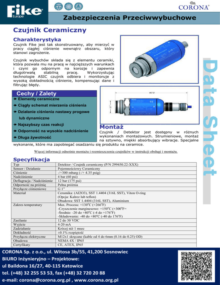 Zabezpieczenia Przeciwwybuchowe Czujnik Ceramiczny Charakterystyka Czujnik Fike jest tak skonstruowany, aby mierzyć w pracy ciągłej ciśnienie wewnątrz obszaru, który stanowi zagrożenie. Czujnik wybuchów składa się z elementu ceramiki, która pozwala mu na pracę w najcięższych warunkach i czyni go odpornym na korozje i zapewnia długotrwałą stabilną pracę. Wykorzystując technologie ASIC czujnik odbiera i monitoruje z wysoką dokładnością ciśnienie, kompensując dane i filtrując błędy. Cechy / Zalety Elementy ceramiczne Ciągły schemat mierzenia ciśnienia Działanie ciśnienia nastawy progowe lub dynamiczne Najszybszy czas reakcji Odporność na wysokie nadciśnienie Montaż Czujnik / Detektor jest dostępny w różnych wykonaniach montażowych. Strumieniowe, montaż Długa żywotność na sztywno, miękki absorbujący wibracje. Specjalne wykonanie, które ma zapobiegać osadzaniu się produktu na ceramice. Więcej informacji odnośnie montażu i rozmieszczenia czujników w instrukcji obsługi i montażu. Specyfikacja Typ Sensor / Działanie Ciśnienie Nadciśnienie Deflagracja / Nadciśnienie Odporność na próżnię Przyłącze ciśnieniowe Materiał Zakres temperatury Zasilanie Wyjście Zadziałanie Dokładność Przyłącza elektryczne Obudowa Certyfikaty Detektor / Czujnik ceramiczny (P/N 299450.22-XXX) Pojemnościowy Ceramiczny -/+300 mbarg (-/+ 4.35 psig) 4 bar (60 psi) 12 bar (175 psi) Pełna próżnia G 1” Ceramika: (AI2O3), SST 1.4404 (316L SST), Viton O-ring (Opcja: Kalrez lub teflon) Obudowa: SST 1.4404 (316L SST), Aluminium Max. Procesu: +130oC (+266oF) -Czyszczenie marginesowe: +150oC (+300oF= -Średnie: -20 do +80oC (-4 do +176oF) -Składowanie: -40 do +80oC (-40 do 176oF) 12 do 30 VDC 4-20 mA Krócej niż 1 msec ±0.1% rozpiętość M12x1 skręcane (kable od 4 do 6mm (0.16 do 0.25) OD) NEMA 4X / IP65 CE, ATEX, IP65