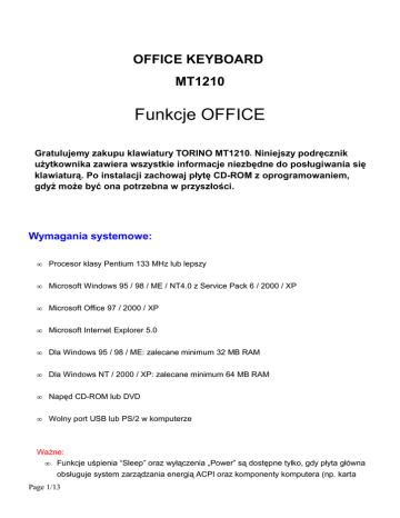 TOP OFFICE KEYBOARD MT1210 Funkcje OFFICE Gratulujemy zakupu klawiatury TORINO MT1210. Niniejszy podręcznik użytkownika zawiera wszystkie informacje niezbędne do posługiwania się klawiaturą. Po instalacji zachowaj płytę CD-ROM z oprogramowaniem, gdyż może być ona potrzebna w przyszłości. Wymagania systemowe: • Procesor klasy Pentium 133 MHz lub lepszy • Microsoft Windows 95 / 98 / ME / NT4.0 z Service Pack 6 / 2000 / XP • Microsoft Office 97 / 2000 / XP • Microsoft Internet Explorer 5.0 • Dla Windows 95 / 98 / ME: zalecane minimum 32 MB RAM • Dla Windows NT / 2000 / XP: zalecane minimum 64 MB RAM • Napęd CD-ROM lub DVD • Wolny port USB lub PS/2 w komputerze Ważne: • Funkcje uśpienia “Sleep” oraz wyłączenia „Power” są dostępne tylko, gdy płyta główna obsługuje system zarządzania energią ACPI oraz komponenty komputera (np. karta Page 1/13 graficzna, karta dźwiękowa itd.) są również zgodne z ACPI. Instalacja oprogramowania jest bardzo prosta: 1. Podłącz klawiaturę do komputera. Przed instalacją oprogramowania wszystkie inne programy obsługujące klawiatury muszą zostać usunięte (z wyjątkiem systemowych). 2. Włóż płytę CD do napędu i uruchom program instalacyjny z folderu OFFICE WIRED KEYBOARD. 3. Przeprowadź instalację zgodnie z informacjami na ekranie. 4. Oprogramowanie zostanie automatycznie zainstalowane w folderze: “C:\Program Files\Netropa”. 5. Aby zakończyć instalację, program będzie musiał zrestartować komputer. Jest to konieczne do uruchomienia wszystkich funkcji klawiatury. 6. Na belce systemowej (obok zegara) pojawi się ikona. Kliknięcie jej prawym przyciskiem myszy i wybranie opcji „Configure buton” otworzy okno programu, w którym będziesz mógł zmienić funkcje 12 przycisków multimedialnych. 7. Zainstalowany program w minimalnym stopniu korzysta z zasobów systemu operacyjnego i zajmuje niewiele miejsca na twardym dysku. Opis funkcji: Dostęp do funkcji OFFICE klawiszy funkcyjnych można uzyskać przez naciśnięcie przycisku Office Lock “F”. F Przycisk Office Lock Przełącza tryb klawiszy funkcyjnych z normalnego zgaszona) w tryb rozszerzony OFFICE (dioda zapalona). Pomoc Otwieranie okna systemu pomocy dla aktywnego okna aplikacji (jeżeli dostępne) Nowy Tworzenie nowego dokumentu Page 2/13 (dioda Otwórz Otwieranie nowego dokumentu Zapisz Zapis dokumentu Zamień Wyszukiwanie i zamiana określonego tekstu i formatowania Sprawdź pisownię Uruchomienie narzędzia sprawdzania pisowni (jeżeli dostępne) Cofnij Cofnięcie poprzedniej czynności Ponów Ponawianie (po cofnięciu) poprzedniej czynności Odpowiedz Odpowiedź na list e-mail (do znajdującego się w polu „Od”) Odpowiedz wszystkim Odpowiedź na listy e-mail (do znajdujących się w polu „Od”) Prześlij dalej Przekazanie listu e-mail do innych adresatów Wyślij Wysłanie listów e-mail Drukuj Drukowanie dokumentów w aktywnym oknie Funkcje przycisków Aplikacji OFFICE Word Otwiera edytor tekstu Microsoft Word Przycisk może być również skonfigurowany do otwierania innej aplikacji Excel Otwiera arkusz kalkulacyjny Microsoft Excel Przycisk może być również skonfigurowany do otwierania innej aplikacji Page 3/13 Power Point Otwiera program prezentacyjny Microsoft PowerPoint Przycisk może być również skonfigurowany do otwierania innej aplikacji Kalendarz Otwiera kalendarz Microsoft Outlook Przycisk może być również skonfigurowany do otwierania innej aplikacji Funkcje przycisków INTERNETU Stop Wstrzymuje ładowanie lub odświeżanie strony WWW Uruchamia standardową przeglądarkę WWW lub wczytuje stronę domową E-mail Uruchamia standardowy program poczty elektronicznej Ulubione Otwiera panel Ulubione w przeglądarce internetowej Odśwież Aktualizuje zawartość aktualnie oglądanej strony WWW Szukaj Otwiera panel wyszukiwania w przeglądarce internetowej 5-5. Funkcje przycisków MULTIMEDIÓW Graj/Pauza Odtwarza lub zatrzymuje na chwilę odtwarzanie mediów, uruchamia odtwarzacz mediów Stop Wyłącza odtwarzanie mediów • Pokrętło głośności Zwiększa i zmniejsza głośność. Page 4/13 Poprzednia ścieżka Przełącza odtwarzanie mediów do poprzedniej ścieżki Następna ścieżka Przełącza odtwarzanie mediów do następnej ścieżki Wysuń/Zamknij Wysuwa szufladę napędu CD/DVD 5-6. Funkcje przycisków APLIKACJI Zasilanie Uśpienie Wymusza zamknięcie systemu i wyłączenie zasilania komputera. Działa tylko wtedy, gdy komputer jest wyposażony w system zarządzania energią i system ten został uruchomiony. Informacji na ten temat należy szukać u producenta komputera. Wprowadza system i komputer w stan uśpienia. Działa tylko wtedy, gdy komputer jest wyposażony w system zarządzania energią i system ten został uruchomiony. Informacji na ten temat należy szukać u producenta komputera. Otwiera okno wylogowywania z sieci. Wylogowanie Otwiera systemowe okno Mój komputer. Mój komputer Kalkulator Otwiera kalkulator Windows Ważne: Przycisk “Wylogowanie”: • Windows 95/98/ME/XP: Niektóre aplikacje do zamknięcia, wymagają zwolnienia zasobów systemowych. Może to prowadzić do opóźnienia reakcji systemu na naciśnięcie przycisku „Wylogowanie”. Jeżeli okno wylogowania się nie pojawi lub otworzy się jedynie menu Start, naciśnij klawisz ESC a następnie ponownie przycisk „Wylogowanie”. Page 5/13 • Windows NT: Funkcja wylogowania nie jest dostępna w tym systemie • Windows 2000: Funkcja wylogowania musi być uaktywniona. Należy włączyć ją w oknie: “Settings |Taskbar | Advanced | Display Logoff” (polska wersja: Ustawienia | Pasek zadań | Zaawansowane | Wyświetl polecenie Wyloguj) Funkcje przycisków SCHOWKA Wytnij Wycinanie zaznaczonego obiektu Wklej Wstawianie wyciętego lub skopiowanego wcześniej obiektu Kopiuj Kopiowanie zaznaczonego obiektu Zaznacz Zaznaczenie obiektu Page 6/13 Wstecz Cofnięcie do poprzednio oglądanego obiektu w programie (działa 