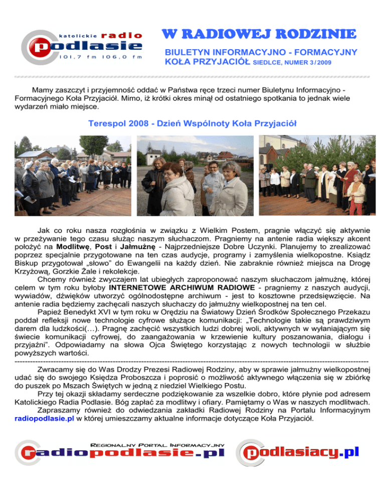 W RADIOWEJ RODZINIE BIULETYN INFORMACYJNO - FORMACYJNY KOŁA PRZYJACIÓŁ SIEDLCE, NUMER 3 / 2009 Mamy zaszczyt i przyjemność oddać w Państwa ręce trzeci numer Biuletynu Informacyjno Formacyjnego Koła Przyjaciół. Mimo, iŜ krótki okres minął od ostatniego spotkania to jednak wiele wydarzeń miało miejsce. Terespol 2008 - Dzień Wspólnoty Koła Przyjaciół Jak co roku nasza rozgłośnia w związku z Wielkim Postem, pragnie włączyć się aktywnie w przeŜywanie tego czasu słuŜąc naszym słuchaczom. Pragniemy na antenie radia większy akcent połoŜyć na Modlitwę, Post i JałmuŜnę - Najprzedniejsze Dobre Uczynki. Planujemy to zrealizować poprzez specjalnie przygotowane na ten czas audycje, programy i zamyślenia wielkopostne. Ksiądz Biskup przygotował „słowo” do Ewangelii na kaŜdy dzień. Nie zabraknie równieŜ miejsca na Drogę KrzyŜową, Gorzkie śale i rekolekcje. Chcemy równieŜ zwyczajem lat ubiegłych zaproponować naszym słuchaczom jałmuŜnę, której celem w tym roku byłoby INTERNETOWE ARCHIWUM RADIOWE - pragniemy z naszych audycji, wywiadów, dźwięków utworzyć ogólnodostępne archiwum - jest to kosztowne przedsięwzięcie. Na antenie radia będziemy zachęcali naszych słuchaczy do jałmuŜny wielkopostnej na ten cel. PapieŜ Benedykt XVI w tym roku w Orędziu na Światowy Dzień Środków Społecznego Przekazu poddał refleksji nowe technologie cyfrowe słuŜące komunikacji: „Technologie takie są prawdziwym darem dla ludzkości(…). Pragnę zachęcić wszystkich ludzi dobrej woli, aktywnych w wyłaniającym się świecie komunikacji cyfrowej, do zaangaŜowania w krzewienie kultury poszanowania, dialogu i przyjaźni”. Odpowiadamy na słowa Ojca Świętego korzystając z nowych technologii w słuŜbie powyŜszych wartości. ----------------------------------------------------------------------------------------------------------------------------------------Zwracamy się do Was Drodzy Prezesi Radiowej Rodziny, aby w sprawie jałmuŜny wielkopostnej udać się do swojego Księdza Proboszcza i poprosić o moŜliwość aktywnego włączenia się w zbiórkę do puszek po Mszach Świętych w jedną z niedziel Wielkiego Postu. Przy tej okazji składamy serdeczne podziękowanie za wszelkie dobro, które płynie pod adresem Katolickiego Radia Podlasie. Bóg zapłać za modlitwy i ofiary. Pamiętamy o Was w naszych modlitwach. Zapraszamy równieŜ do odwiedzania zakładki Radiowej Rodziny na Portalu Informacyjnym radiopodlasie.pl w której umieszczamy aktualne informacje dotyczące Koła Przyjaciół. BIULETYN RADIOWEJ RODZINY NUMER 3 / 2009 ------------------------------------------------------------------------------------------------------------------------------------Świętowali w Łomazach. 22 lutego, tak jak w kaŜdą czwartą niedzielę miesiąca, odbyło się spotkanie Koła Przyjaciół Katolickiego Radia Podlasie w Łomazach. Jednak tym razem nie było ono zwyczajne, gdyŜ świętowaliśmy 80 rocznicę urodzin jednej z naszych członkiń. Uroczystość rozpoczęliśmy Eucharystią o godz. 11.30, w której wzięliśmy czynny udział. Mszę świętą sprawował ksiądz wikariusz Piotr Woźniak wraz z księdzem posługującym na Ukrainie. Odwiedził on naszą parafię w towarzystwie siostry zakonnej, która pochodzi z pobliskiej miejscowości, Ortela Królewskiego. Po NaboŜeństwie udaliśmy się na salkę parafialną, gdzie złoŜyliśmy jubilatce najserdeczniejsze Ŝyczenia, po czym zjedliśmy obiad. ZwaŜywszy na to, iŜ były to zapusty towarzyszyły nam tańce i śpiew. Panowała miła, radosna atmosfera. Zgodnie ze słowami Św. Teresy: jak post to post, a jak zabawa to zabawa. Ulan - przepiękne wspomnienie po spotkaniu opłatkowym. Świąteczny wystrój sali wykonany przez Beatę wprowadzał w nastrój spotkania. W spotkaniu uczestniczył ksiądz Proboszcz oraz ksiądz Henryk, emeryt, ksiądz Adam, nasz opiekun i ksiądz Krzysztof, wikariusz… …oraz Legion Maryi. Spotkanie przebiegało w rodzinnej atmosferze przy śpiewie pastorałek i kolęd. Chcesz podzielić się wydarzeniem, świadectwem? Napisz do nas list, maila, adres: Katolickie Radio Podlasie z dopiskiem ”Radiowa Rodzina”, ul. Bpa I. Świrskiego 56, 08 - 110 Siedlce, [email protected] 2 BIULETYN RADIOWEJ RODZINY NUMER 3 / 2009 ------------------------------------------------------------------------------------------------------------------------------------Sprawozdanie z działalności Koła Przyjaciół w Chotyłowie - parafia Piszczac za rok 2008. Kołem, liczącym 34 stałych członków, opiekuje się ksiądz Robert Sierociuk. Odbywające się raz w miesiącu spotkania słuŜyły nam do analizowania i pogłębiania wiedzy chrześcijańskiej oraz wspólnej modlitwy. W pierwszym półroczu skupialiśmy się na rozwaŜaniach III części materiałów nt. „Chrzest w Ŝyciu i misji Kościoła”. Uczestniczyły w tym inne zainteresowane osoby spoza Koła. Od momentu inauguracji roku świętego Pawła tematem spotkań było poznawanie Ŝycia i działalności Apostoła Narodów zachęcające w konsekwencji do czytania i osobistego rozwaŜania Listów Świętego Pawła. W zakresie tej tematyki zorganizowaliśmy wyjazd do Kodnia, jednego z wyznaczonych w tym celu miejsc. Członkowie koła uczestniczyli czynnie w jednej z odbywających się w naszej parafii uroczystości ku czci Matki BoŜej Fatimskiej, prowadząc modlitwę róŜańcową. Z okazji rocznic związanych z osobą Jana Pawła II ( rocznica śmierci, wybór papieŜa) z udziałem księŜy i miejscowego społeczeństwa modliliśmy się przy krzyŜu w Chotyłowie. W związku z dziesięcioleciem istnienia naszego koła, w lipcu zorganizowaliśmy spotkanie w plenerze, gdzie honorowymi uczestnikami byli ksiądz Dariusz Denisiuk i ksiądz Robert Sierociuk. W części oficjalnej dotychczasowa prezes Maria Lach, przekazała tę funkcję. Przedstawiła zebranym obszerne relacje z minionej działalności, co dostar