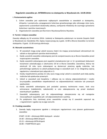 Regulamin zawodów pn. MTBMXtreme na skateparku w Wyszkowie dn. 10.09.2016r I. Postanowienia ogólne 1. Celem zawodów jest wyłonienie najlepszych zawodników w zawodach w skateparku, dirtparku i pumptrucku, propagowanie kolarstwa grawitacyjnego jako zdrowego stylu życia, zapewnienie uczestnikom doskonałej zabawy, zachęcenie młodzieży do czynnego uprawiania kolarstwa i sportów rowerowych. 2. Organizatorem zawodów jest Burmistrz Wyszkowa/Gmina Wyszków. II. Termin i miejsce zawodów Zawody odbędą się 10 września 2016r. (sobota) w Skateparku położonym na terenie Zespołu Szkół w Wyszkowie (ul. Geodetów 45). Zapisy rozpoczynają się o godz. 12:00 w Biurze Zawodów na terenie skateparku. O godz. 13:30 startują eliminacje. III. Warunki uczestnictwa 1. W zawodach mogą wziąć udział wszyscy chętni nie mający przeciwskazań zdrowotnych do udziału w dyscyplinach sportów ekstremalnych. 2. Każdy uczestnik zawodów zobowiązany jest do zarejestrowania się w Biurze Zawodów przed rozpoczęciem zawodów. 3. Każdy zawodnik zobowiązany jest wypełnić oświadczenie (zał. nr 1) i przedstawić dokument tożsamości zaświadczający o ukończeniu 18 lat w Biurze Zawodów. Zawodnicy, którzy nie ukończyli 18 roku życia zobowiązani są dostarczyć pisemną zgodę rodziców, lub pełnoletniego opiekuna na udział podopiecznego w zawodach (zał. nr 2). Integralną częścią regulaminu i oświadczeń jest załącznik nr 3. 4. Osoby niepełnoletnie poniżej 15 roku życia mogą wziąć udział w zawodach pod stałą opieką rodziców lub opiekunów prawnych. 5. Udział w zawodach jest bezpłatny i odbywa się na własną odpowiedzialność i ryzyko (w przypadku zawodników niepełnoletnich na odpowiedzialność rodziców lub prawnych opiekunów). 6. Każdy zawodnik zobowiązany jest posiadać sprawny technicznie rower, kask oraz ochraniacze (nałokietniki, nakolanniki) w celu zabezpieczenia się przed skutkami ewentualnych upadków. 7. Zawodnik zobowiązany jest do odpowiedniego ubezpieczenia się od następstw nieszczęśliwych wypadków jak i od odpowiedzialności cywilnej. 8. Po podpisaniu listy startowej przez zawodnika uznaje się iż ̇ zawodnik zapoznał się z regulaminem i zgadza się na jego warunki. IV. Przebieg zawodów 1. Zawody będą rozgrywane zgodnie z niniejszym regulaminem oraz planem godzinowym zawodów: START: 13:30 – eliminacje BMX skatepark - amator 14:30 – eliminacje BMX dirtpark 15:15 – eliminacje MTB dirtpark 16:00 – PUMPTRUCK open 16:45 – eliminacje BMX skatepark - pro 17:30 – finały BMX skatepark - amator 18:00 – finały BMX dirtpark 18:30 – finały MTB dirtpark 19:00 – BEST TRICK dirtpark 19:30 – finały BMX skatepark- pro 20:00 - BEST TRICK skatepark 20:30 – ogłoszenie wyników 2. Zawody oceniać będzie wykwalifikowany skład sędziowski, składający się z minimum 3 sędziów mtb/bmx. 3. Podczas eliminacji BMX skatepark każdy zawodnik będzie mieć dwa 1-minutowe przejazdy, podczas których oceniany będzie pod czterema aspektami: 1) czystość przejazdu, 2) kreatywność, 3) wykorzystanie przeszkód, 4) płynność przejazdu. 4. W kategorii dirtpark każdy z zawodników będzie mieć 3 przejazdy, w których będzie oceniany pod względem: 1) czystości przejazdu, 2) kreatywności, 3) płynności przejazdu. 5. W zależności od liczby zawodników w eliminacjach, decyzję o ilości miejsc w finałach podejmuje organizator. 6. Niestawienie się na rozpoczęcie eliminacji i finałów w wyznaczonym czasie będzie się równało z dyskwalifikacją. 7. Wygrywa zawodnik, który zgromadzi największą ilość punktów. 8. Nie wolno używać szklanych pojemników w pobliżu i na trasie zawodów. V. Nagrody 1. Organizator gwarantuje następujące nagrody pieniężne: 1) w kategorii BMX Skatepark - amator: 1. miejsce – 400 PLN, 2. miejsce – 200 PLN, 3. miejsce – 100 PLN 2) w kategorii BMX Skatepark - pro: 1. miejsce – 750 PLN, 2. miejsce – 500 PLN, 3. miejsce – 250 PLN, nagroda publiczności – 250 PLN 3) w kategorii MTB Dirtpark: 1. miejsce – 750 PLN, 2. miejsce – 400 PLN, 3. miejsce – 200 PLN, nagroda publiczności – 250 PLN 4) w kategorii BMX Dirtpark: 1.miejsce – 500 PLN (Sponsor: PROMET INOX) + 300 PLN (Sponsor: Orange), 2.miejsce – 300 PLN (Sponsor: Trybik) + 100 PLN (Sponsor: Play), 3.miejsce – 200 PLN (Sponsor: Promotom) 5) w kategorii Pumptruck: 1.miejsce – 200 PLN, 2. miejsce – 100 PLN, 3. miejsce – 50 PLN 6) Best trick – 4 nagrody po 100 PLN 2. Organizatorzy zastrzegają sobie prawo dodatkowego nagradzania zawodników w zależności od pozyskania sponsorów. VI. Postanowienia końcowe 1. Niniejszy regulamin obowiązuje wszystkich uczestników imprezy. Brak znajomości regulaminu nie będzie uznawany jako wytłumaczenie. 2. Organizator nie ponosi odpowiedzialności za wypadki losowe zaistniałe podczas dojazdu zawodników na zawody i powrotu. 3. Organizator zapewnia wszystkim uczestnikom imprezy niezbędną opiekę medyczną na czas trwania zawodów - minimum zespół ratownictwa medycznego podstawowy (karetka z wymaganym wyposażeniem + ratownik medyczny - kierowca, ratownik medyczny/pielęgniarka systemu) 4. Organizator nie ponosi odpowiedzialności materialnej za rzeczy zaginione, skradzione i zniszczone w trakcie trwania zawodów. 5. Organizator nie ponosi odpowiedzialności za ewentualne kolizje i wypadki w czasie zawodów. 6. Zabrania się wnoszenia i spożywania napojów alkoholowych oraz środków prawnie zakazanych. 7. Każdy uczestnik zobowiązany jest do szczególnej dbałości o bezpieczeństwo podczas obecności na torze i kierowanie się zasadą fair play w trakcie zawodów. 8. We wszystkich spornych kwestiach, nieobjętych przepisami niniejszego regulaminu będzie decydować organizator zawodów. 9. Organizator zastrzega sobie prawo do zmiany regulaminu zawodów.