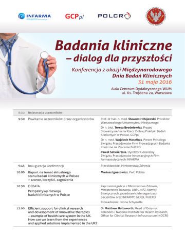 Badania kliniczne – dialog dla przyszłości Konferencja z okazji Międzynarodowego Dnia Badań Klinicznych 31 maja 2016 Aula Centrum Dydaktycznego WUM ul. Ks. Trojdena 2a, Warszawa 8:30 Rejestracja uczestników 9:30 Powitanie uczestników przez organizatorów Prof. dr hab. n. med. Sławomir Majewski, Prorektor Warszawskiego Uniwersytetu Medycznego Dr n. biol. Teresa Brodniewicz, Prezes Stowarzyszenia na Rzecz Dobrej Praktyki Badań Klinicznych w Polsce, GCPpl Dr n. med. Wojciech Masełbas, Prezes Polskiego Związku Pracodawców Firm Prowadzących Badania Kliniczne na Zlecenie PolCRO Paweł Sztwiertnia, Dyrektor Generalny Związku Pracodawców Innowacyjnych Firm Farmaceutycznych INFARMA Inauguracja konferencji Przedstawiciel Ministerstwa Zdrowia 10:00 Raport na temat aktualnego stanu badań klinicznych w Polsce – szanse, korzyści, zagrożenia Mariusz Ignatowicz, PwC Polska 10:30 DEBATA: Zaproszeni goście z Ministerstwa Zdrowia, Ministerstwa Rozwoju, URPL, NFZ, Komisji Bioetycznych, przedstawiciele organizacji pacjentów oraz INFARMY, GCPpl, PolCRO. 9:45 Perspektywy rozwoju badań klinicznych w Polsce Prowadzenie: Iwona Schymalla 12:00 Efficient support for clinical research and development of innovative therapies – example of health care system in the UK. How can we learn from the experiences and applied solutions implemented in the UK? Dr Matthew Hallsworth, Head of External Relations | National Institute for Health Research, Office for Clinical Research Infrastructure (NOCRI) 12:45 Przerwa – lunch 13:45 Rekrutacja pacjentów do badań klinicznych – perspektywa badacza, pacjenta i sponsora Prof. dr hab. med. Tadeusz Pieńkowski, onkolog Dyrektor Medyczny w Radomskim Centrum Onkologii, Prezydent Polskiego Towarzystwa do Badań nad Rakiem Piersi Jacek Gugulski, Prezes Zarządu,Ogólnopolskie Stowarzyszenie Pomocy Chorym Na Przewlekłą Białaczkę Szpikową Wojciech Kaczmarski, Dyrektor Działu Międzynarodowych Badań Klinicznych Roche Polska 15:00 Wykorzystanie innowacyjnych technologii w badaniach klinicznych Mariusz Olejniczak, Dyrektor Biura Sprzedaży i Feasibility, Departament Badań Klinicznych grupy NEUCA 16:00 Zakończenie konferencji lek. med. Aneta Sitarska-Haber, Stowarzyszenie na Rzecz Dobrej Praktyki Badań Klinicznych w Polsce, GCPpl