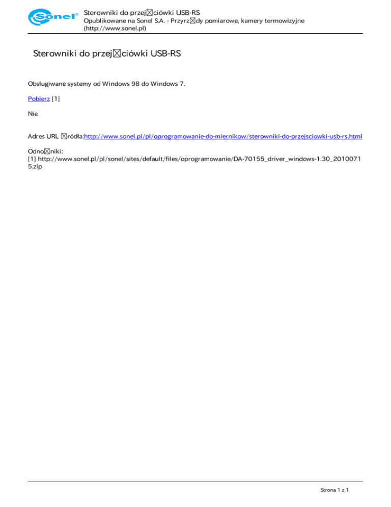 Sterowniki do przej ciówki USB-RS Opublikowane na Sonel S.A. - Przyrz (http://www.sonel.pl) Sterowniki do przej dy pomiarowe, kamery termowizyjne ciówki USB-RS Obsługiwane systemy od Windows 98 do Windows 7. Pobierz [1] Nie Adres URL ródła:http://www.sonel.pl/pl/oprogramowanie-do-miernikow/sterowniki-do-przejsciowki-usb-rs.html Odno niki: [1] http://www.sonel.pl/pl/sonel/sites/default/files/oprogramowanie/DA-70155_driver_windows-1.30_2010071 5.zip Strona 1 z 1 Powered by TCPDF (www.tcpdf.org)