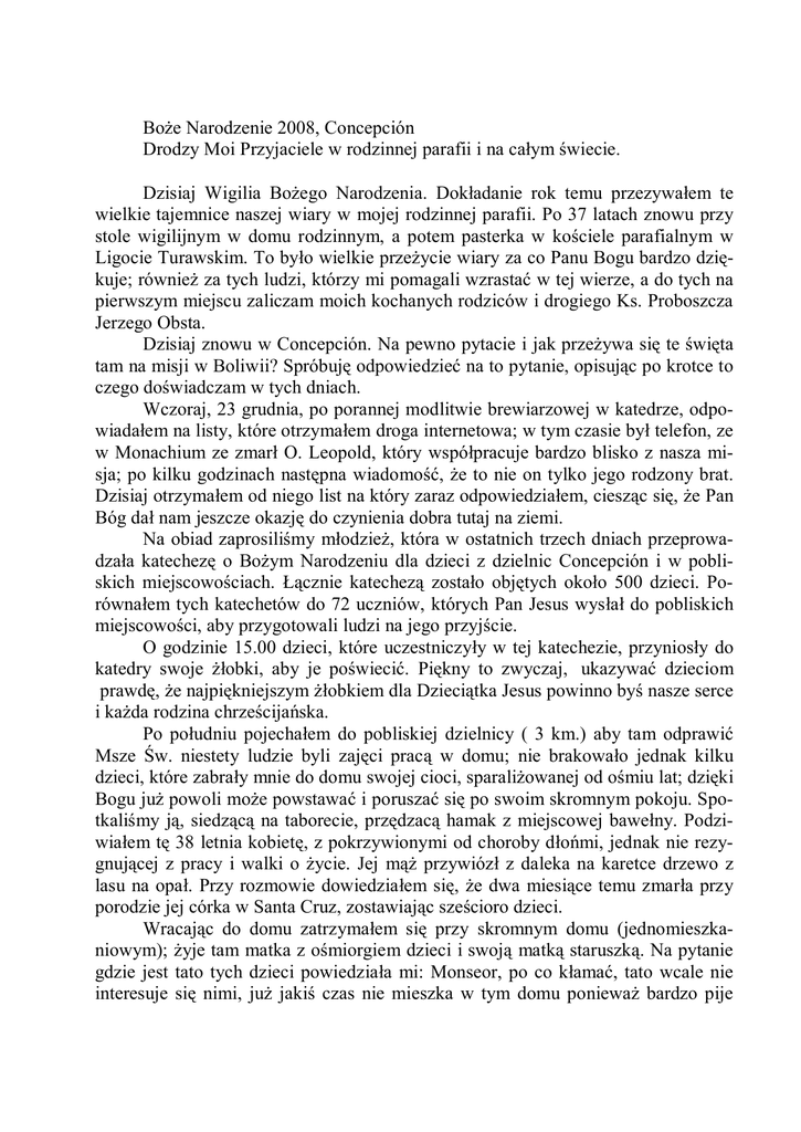Boże Narodzenie 2008, Concepción Drodzy Moi Przyjaciele w rodzinnej parafii i na całym świecie. Dzisiaj Wigilia Bożego Narodzenia. Dokładanie rok temu przezywałem te wielkie tajemnice naszej wiary w mojej rodzinnej parafii. Po 37 latach znowu przy stole wigilijnym w domu rodzinnym, a potem pasterka w kościele parafialnym w Ligocie Turawskim. To było wielkie przeżycie wiary za co Panu Bogu bardzo dziękuje; również za tych ludzi, którzy mi pomagali wzrastać w tej wierze, a do tych na pierwszym miejscu zaliczam moich kochanych rodziców i drogiego Ks. Proboszcza Jerzego Obsta. Dzisiaj znowu w Concepción. Na pewno pytacie i jak przeżywa się te święta tam na misji w Boliwii? Spróbuję odpowiedzieć na to pytanie, opisując po krotce to czego doświadczam w tych dniach. Wczoraj, 23 grudnia, po porannej modlitwie brewiarzowej w katedrze, odpowiadałem na listy, które otrzymałem droga internetowa; w tym czasie był telefon, ze w Monachium ze zmarł O. Leopold, który współpracuje bardzo blisko z nasza misja; po kilku godzinach następna wiadomość, że to nie on tylko jego rodzony brat. Dzisiaj otrzymałem od niego list na który zaraz odpowiedziałem, ciesząc się, że Pan Bóg dał nam jeszcze okazję do czynienia dobra tutaj na ziemi. Na obiad zaprosiliśmy młodzież, która w ostatnich trzech dniach przeprowadzała katechezę o Bożym Narodzeniu dla dzieci z dzielnic Concepción i w pobliskich miejscowościach. Łącznie katechezą zostało objętych około 500 dzieci. Porównałem tych katechetów do 72 uczniów, których Pan Jesus wysłał do pobliskich miejscowości, aby przygotowali ludzi na jego przyjście. O godzinie 15.00 dzieci, które uczestniczyły w tej katechezie, przyniosły do katedry swoje żłobki, aby je poświecić. Piękny to zwyczaj, ukazywać dzieciom prawdę, że najpiękniejszym żłobkiem dla Dzieciątka Jesus powinno byś nasze serce i każda rodzina chrześcijańska. Po południu pojechałem do pobliskiej dzielnicy ( 3 km.) aby tam odprawić Msze Św. niestety ludzie byli zajęci pracą w domu; nie brakowało jednak kilku dzieci, które zabrały mnie do domu swojej cioci, sparaliżowanej od ośmiu lat; dzięki Bogu już powoli może powstawać i poruszać się po swoim skromnym pokoju. Spotkaliśmy ją, siedzącą na taborecie, przędzacą hamak z miejscowej bawełny. Podziwiałem tę 38 letnia kobietę, z pokrzywionymi od choroby dłońmi, jednak nie rezygnującej z pracy i walki o życie. Jej mąż przywiózł z daleka na karetce drzewo z lasu na opał. Przy rozmowie dowiedziałem się, że dwa miesiące temu zmarła przy porodzie jej córka w Santa Cruz, zostawiając sześcioro dzieci. Wracając do domu zatrzymałem się przy skromnym domu (jednomieszkaniowym); żyje tam matka z ośmiorgiem dzieci i swoją matką staruszką. Na pytanie gdzie jest tato tych dzieci powiedziała mi: Monseor, po co kłamać, tato wcale nie interesuje się nimi, już jakiś czas nie mieszka w tym domu ponieważ bardzo pije alkohol. Ja sama pracuję przy wypieku chleba i w ten sposób utrzymuję moją rodzinę. Moja droga do domu prowadziła przez dom rodzinny jednego z tutejszych księży, który już od trzech lat nie odprawia Mszy Św. z powodów nam obu wiadomych. Cieszył się, że pamiętałem o nim, przekazując mu skromny podarunek i książkę Benedykta XVI zatytułowaną „Jezus z Nazaretu”. Wieczorem odprawiłem Mszę Św. a potem były jasełka w katedrze. Nie brakowało w tym przedstawieniu diabełka, który wychodził na przeciw pastuszkom oferując jednemu trochę piwa, innemu smakołyków innym jeszcze drobnych podarunków; niestety niektórzy wpadli w sidła i zamiast adorować Dzieciątko Jesus zostali przy swoim napoju, jedzeniu i podarunkach w połowie drogi. W końcu jednak zbliżył się do nich dobry anioł, zapraszając ich na spotkanie z Panem Jezusem na co oni odpowiedzieli z ochotą. Dzisiaj, 24. grudnia, rano poszliśmy z Br. Markiem i O. Norbertem do pobliskiego więzienia, aby zanieść więźniom trochę jedzenia i przede wszystkim nadzieję, że narodzony Jesus przynosi ludziom wyzwolenie z rąk naszych nieprzyjaciół i pragnie abyśmy mu służyli w świętości i sprawiedliwości. Po odmówieniu modlitwy Pańskiej i pozdrowienia anielskiego, udzieliłem im błogosławieństwa Bożego i złożyliśmy sobie życzenia świąteczne. Potem przyszły dwie dziewczyny po maturze, aby im pomóc w studiach w Santa Cruz, chodzi przede wszystkim o znalezienie mieszkania w tym wielkim mieście. Obiad w Wigilię spożyliśmy razem z siostrami Meksykankami, które od ponad 50 lat pracują w Concepción. Złożyliśmy sobie życzenia świąteczne i dziękowaliśmy Bogu za Jego narodzenie w naszej wspólnocie zakonnej i parafialnej. Za chwilę ojcowie udadzą się a poszczególne dzielnice, wioski (najdalsza aż 75 km od Concepción) aby tam z ludem Bożym dziękować Jezusowi za Jego wcielenie i odnawianie tej tajemnicy w każdej Mszy Świętej. Ja pojadę pod wieczór do pobliskiej miejscowości o nazwie San Andres, potem wrócę na tak zwaną posadę, czyli szukanie gospody “rodzina święta na osiołku odbywa podróż wokół głównego placu nie znajdując miejsca dla nich; wreszcie otwierają się drzwi katedry i razem z towarzyszącymi ludźmi, wkraczają do świątyni, gdzie niebawem zostanie odprawiona Msze Św. w której narodzi się Pan Jesus dla naszego Zbawienia. Moi Drodzy. List współbrata, którego uważaliśmy za nieżywego, Młodzież wychodząca na przeciw dzieci, aby objawić im Dzieciątko Boże; Zapał tych dzieci, ich uczestnictwo w katechezach; Walcząca o życie sparaliżowana matka; Zatroskana o swoje dzieci samotna matka; Ksiądz, który chwilowo nie odprawia Mszy Św., wdzięczny za moją wizytę; Jasełka, dające tak wiele do przemyślenia; Więźniowie ustawieni w szeregu, słuchający dobrej nowiny o narodzeniu Pana również dla nich; młodzież, szukająca zawodu; Przeżywanie wspólnych chwil przy na