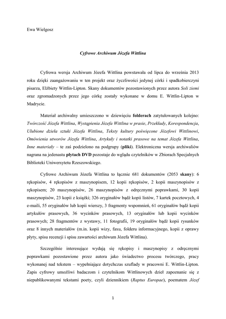 Ewa Wielgosz Cyfrowe Archiwum Józefa Wittlina Cyfrowa wersja Archiwum Józefa Wittlina powstawała od lipca do września 2013 roku dzięki zaangażowaniu w ten projekt oraz życzliwości jedynej córki i spadkobierczyni pisarza, Elżbiety Wittlin-Lipton. Skany dokumentów pozostawionych przez autora Soli ziemi oraz zgromadzonych przez jego córkę zostały wykonane w domu E. Wittlin-Lipton w Madrycie. Materiał archiwalny umieszczono w dziewięciu folderach zatytułowanych kolejno: Twórczość Józefa Wittlina, Wystąpienia Józefa Wittlina w prasie, Przekłady, Korespondencja, Ulubione dzieła sztuki Józefa Wittlina, Teksty kultury poświęcone Józefowi Wittlinowi, Omówienia utworów Józefa Wittlina, Artykuły i notatki prasowe na temat Józefa Wittlina, Inne materiały – te zaś podzielono na podgrupy (pliki). Elektroniczna wersja archiwaliów nagrana na jedenastu płytach DVD pozostaje do wglądu czytelników w Zbiorach Specjalnych Biblioteki Uniwersytetu Rzeszowskiego. Cyfrowe Archiwum Józefa Wittlina to łącznie 681 dokumentów (2053 skany): 6 rękopisów, 4 rękopisów z maszynopisem, 12 kopii rękopisów, 2 kopii maszynopisów z rękopisem; 20 maszynopisów, 26 maszynopisów z odręcznymi poprawkami, 30 kopii maszynopisów, 23 kopii z książki; 326 oryginałów bądź kopii listów, 7 kartek pocztowych, 4 e-maili, 55 oryginałów lub kopii wierszy, 3 fragmenty wspomnień, 61 oryginałów bądź kopii artykułów prasowych, 36 wycinków prasowych, 13 oryginałów lub kopii wycinków prasowych; 28 fragmentów z wystawy, 11 fotografii, 19 oryginałów bądź kopii rysunków oraz 8 innych materiałów (m.in. kopii wizy, faxu, folderu informacyjnego, kopii z oprawy płyty, spisu recenzji i spisu zawartości archiwum Józefa Wittlina). Szczególnie interesujące wydają się rękopisy i maszynopisy z odręcznymi poprawkami pozostawione przez autora jako świadectwo procesu twórczego, pracy wykonanej nad tekstem – wypełniające dotychczas szuflady w pracowni E. Wittlin-Lipton. Zapis cyfrowy umożliwi badaczom i czytelnikom Wittlinowych dzieł zapoznanie się z niepublikowanymi tekstami poety, czyli dziennikiem (Raptus Europae), poematem Józef 1 Wittlin versus Walt Whitman, Notatkami z podróży do Europy, fragmentami notatników, listami. O Józefie Wittlinie Lwowianin Józef Wittlin urodził się 17 sierpnia 1896 roku we wsi Dmytrów pod granicą Wołynia, na Podolu. Dorastał we Lwowie1. W liście z 1961 roku do Zofii Starowieyskiej-Morstinowej twórca objaśnił, że przeniósł się tam wraz z rodzicami, gdy miał pięć lat ze względu na chorobę matki2. Okres ten przypadł na czas zaboru austriackiego. Pierwsze wspomnienia pisarz utrwalił w utworze wspomnieniowo-eseistycznym Mój Lwów. Osierocony przez matkę w siódmym3 roku życia, był wychowywany przez jej siostrę, nazywaną przez chłopca „Loduleczką” oraz jej męża4. Po trzech latach spędzonym u stryjostwa i dziadków na wsi, w dzierżawionym przez krewnych dużym majątku Nagórzany niedaleko Lwowa, dziesięcioletni Wittlin zamieszkał wraz z ojcem (Karolem) i jego drugą żoną, Różą (niemiecką aktorką dramatyczną) we lwowskiej dzielnicy Łyczaków, w związku z czym mówił o sobie „łyczakowskie dziecko”. Ojciec pisarza pracował jako inspektor szkód gradowych i ogniowych, borykając się z trudnościami finansowymi. Późniejszy pisarz rozpoczął wówczas edukację w VII gimnazjum przy ulicy Sokoła, „specjalizującym się w nauce łaciny i greki”, przenikniętym atmosferą lokalnego i narodowego patriotyzmu. Początkowo przedmioty humanistyczne nudziły go, interesowała natomiast piłka nożna, kino, czytanie „tzw. szerloków, czyli zeszytowych edycji” powieści kryminalnych. Sytuacja zmieniła się, gdy podrósł – co dotyczyło zarówno zachowania i podejścia do nauki, jak również pasji gimnazjalisty. W tym czasie chłopiec najintensywniej marzył o karierze muzyka lub dyrygenta. Później, jako piętnastolatek zaczął pisać „melancholijne, patetyczne wiersze o cmentarzach lub na tematy patriotyczno-rewolucyjne”, tragedie wzorowane na twórczości Stanisława Wyspiańskiego, dramaty inspirowane dziełami Henryka Ibsena; bywał często w miejscowych teatrach. 1 Przyjaciółka Wittlina, Zofia Starowieyska-Morstinowa, w szkicu Mój przyjaciel Wittlin przypomniała jego pierwsze lata spędzone we Lwowie. Zob. Z. Starowieyska-Morstinowa, Ci, których spotykałam, wyd. II. uzup., Warszawa 1993, Wydawnictwo Archidiecezji Warszawskiej, ss. 83–126. 2 J. Wittlin, Listy, wstęp i oprac. T. Januszewski, Warszawa 1996, Niezależna Oficyna Wydawnicza, ss. 156– 157. 3 Tamże. Dane pochodzą z listu pisarza do Zofii Starowieyskiej-Morstinowej z 1961 roku. 4 E. Wittlin-Lipton, From one day to Another, Madrid 2011, Ediciones Facta, s. 28. 2 Żołnierz i tłumacz 1912 roku zmarł ojciec pisarza. Lwów był w tamtym czasie „jednym z najważniejszych ośrodków polskich ruchów wolnościowych”, akceptowanym przez austriackie władze jako antyrosyjski. Młodzież skupiała się w stowarzyszeniach patriotycznych przygotowujących się do walki z zaborcami Polski. Pośród członków był także młody Wittlin, o czym wspomniał w biogramie Józef Wittlin5. 1914 roku wstąpił do Wschodniego Legionu Polskiego, rozwiązanego po miesiącu za odmowę wierności cesarzowi. W tej sytuacji poeta wyjechał na studia do Wiednia, gdzie zdał maturę, rozpoczął studia filozoficzne6 w stołecznym uniwersytecie, wiele czytał (między innymi dzieła Friedricha Hebbla), dużo czasu poświęcał muzyce, pisał po polsku, tłumaczył utwory Rainera Marii Rilkego. Zaprzyjaźnił się wtedy z pisarzem austriackiego pochodzenia, Josephem Rothem. 1916 roku obu powołano do austrowęgierskiej armii, w której Wittlin służył jako szeregowiec i kadet już do końca wojny. Najpierw było to stacjonowanie w dwudziestym pierwszym batalionie w Wiedniu, później (bez Rotha) – służba w osiemna