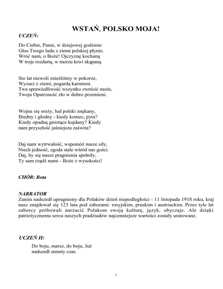 WSTAŃ, POLSKO MOJA! UCZEŃ: Do Ciebie, Panie, w dziejowej godzinie Głos Twego ludu z ziemi polskiej płynie. Wróć nam, o Boże! Ojczyznę kochaną W troje rozdartą, w morzu krwi skąpaną. Sto lat niewoli znieśliśmy w pokorze, Wyzuci z ziemi, pogardą karmieni. Twa sprawiedliwość wszystko zwrócić może, Twoja Opatrzność zło w dobro przemieni. Wojna się sroży, lud polski znękany, Biedny i głodny - kiedy koniec, pyta? Kiedy opadną gniotące kajdany? Kiedy nam przyszłość jaśniejsza zaświta? Daj nam wytrwałość, wspomóż nasze siły, Niech jedność, zgoda stale wśród nas gości. Daj, by się nasze pragnienia spełniły, Ty sam rządź nami - Boże z wysokości! CHÓR: Rota NARRATOR Zanim nadszedł upragniony dla Polaków dzień niepodległości - 11 listopada 1918 roku, kraj nasz znajdował się 123 lata pod zaborami: rosyjskim, pruskim i austriackim. Przez tyle lat zaborcy próbowali narzucić Polakom swoją kulturę, język, obyczaje. Ale dzięki patriotycznemu sercu naszych pradziadów najcenniejsze wartości zostały uratowane. UCZEŃ II: Do boju, marsz, do boju, Już nadszedł zemsty czas. 1 Wśród trudów i wśród znoju Wywalczmy wolność wraz! Niech wzięci orzeł biały I zadrży przed nim wróg! Na pole krwi i chwały Nie mamy innych dróg! Niech pękną więzień mury, Ustanie kajdan brzęk, I wzięci ponad chmury Wolności pieśni dźwięk! Gdy w bój podąży z nami Siermiężny polski lud Żelazem, a nie łzami Wolności wskrzesim cud. UCZEŃ III: Wstań, Polsko moja! Uderz w czyn! Idź znów przebojem w bój szalony. Już płonie lont podziemnych min – Krwawą godzinę biły dzwony – Zerwane pęta - Uderz w czyn! Wstań, Polsko moja! Strząśnij proch! Żałosne marzeń ucisz łkanie! Za tobą zimny smutków loch – Przed Tobą święty zmartchwychwstania!... Z anielskich skrzydeł strząśnij proch! Wstań, Polsko moja! W ogniach zórz Nowe się szlaki krwawią Tobie! O, lżej ci będzie w gromach burz Niżeli w zwiędłych wspomnień grobie – Wstań, Polsko moja, w blaskach zórz! 2 UCZEŃ IV: Na krwawy, matko, idę bój Żołnierska trąbka woła... Żołnierski, szary na mnie strój, Lecz w ręku miecz anioła... Na polach legnął śnieg błękitnie, Lecz w duszy sad wiosenny kwitnie... (...)Jeśli powrócę, matko, dzień ten będzie dniem wesela... Zapukam cicho w twoją sień, W majowe strojną ziela; Do stóp przypadnę twych i złożę Starganą z szyi mej obrożę. Słychać melodię do piosenki „Wojenko, wojenko" UCZEŃ XII: Wojenko, wojenko, cóżeś ty za pani, Że ku tobie idą chłopcy malowani? Chłopcy malowani, chłopcy wybierani, Wojenko, wojenko, cóżeś ty za pani? CHÓR: Słowa podejmuje chór śpiewając piosenkę „Wojenko, wojenko" Pieśń legionowa „Rozkwitały białe pęki róż..." w wykonaniu uczennicy z towarzyszeniem chóru. UCZEŃ V: Nam nie szumią nad głowy sztandary ni proporce na wichrze rozwiane chyba czasem zaszumi bór stary, chyba wichry na polach zbłąkane, tryumfalne nam wieją fanfary! Nam nie graj ą trębacze surmowi ani kotły nam biją zwycięstwo... Na ugorach - wśród sinych pustkowi śmierć jest cicha i ciche jest męstwo i grób cichy - u wszystkich wezgłowi... 3 Ani jasne nam w słońcu lśnią groty, ani mundur zabłyśnie jaskrawię... Idziem - szara kolumna piechoty wędrujące w odlotach żurawie... Jeno sen nasz jest cudny, sen złoty, Sen wolności - co marzy się w sławie! CHÓR: Pieśń żołnierska „Piechota UCZEŃ VI: Kto, jak on - nasz brygadier Piłsudski Polskę w sercu, śmierć w tornistrze nosił. Kto jak on? Pamiętajcie to imię, co z tęsknoty do Polski wyrosło, gdy wróg deptał jaz buta wyniosłą, całą w ogniu stojącą i w dymie. Ten żołnierski wysiłek nadludzki wy swym dzieciom w kolebkach pokażcie, bo jak w burzy kapitan na maszcie stal dziś w Polsce brygadier Piłsudski. CHÓR: Pieśń „Legiony' UCZEŃ VII: 0 Polsko, Polsko, Polsko, (...) patrz - już dzień Twój świtaktoś w ogniu dział i w dymie krwią własną na sztandarach Twe święte kreśli imię. Ktoś krew swą żyzną rosą - Niech będzie cześć i chwała żołnierzom z Bożej łaski! Wpatrz się i wsłuchaj!... Oto Polska idzie, żywcem w męczeńskiej pogrzebana trumnie, i zmartwychwstaje królewsko i dumnie. Polsko, nie jesteś Ty już niewolnicą! Łańcuch twych kajdan stał się tym łańcuchem, 4 Na którym z lochu, co był twą stolicą Lat sto, swym własnym dźwignęłaś się duchem. (...) Polsko, nie jesteś ty już niewolnicą! Lecz czymś największym, czym być można: sobą! UCZEŃ VIII: Okopy przemieniły się w kwiecisty parów, Zarośnięty po brzegi w wierzb płaczące krzaki, w płomienie- jak żołnierskie miłowanie- maki, w pąki przytuli- białe jak kity huzarów. . . Słońce oblewa ogniem swych złotych pożarów srebrne chorągwie wiklin i ostu szyszaki, i husarię błękitu- rozśpiewane ptaki. . . Szumią bylice na kształt sztandarów. . . Tu konały narody, tu grzmiały armaty, A dziś ptaki śpiewaj ą i śmiej ą się kwiaty, Rumiane krwią poległych, ich sławą promienne... Polsko! I ty zakwitniesz jako te okopy. . . Gwiazdą narodów będziesz, słońcem Europy, wielka, można, świetlista- jak niebo wiosenne. . . UCZEŃ IX: Wielkie nazwiska i wielkie imiona Utrwali pamięć w księgach i marmurze, Lecz twoje imię w zapomnieniu skona, Szary piechurze! (...) Inne twe laury, inna twa chwała, Trwalsza nad zgłoski wyryte w marmurze, Bo w czynach twoich Polska zmartwychwstała, Szary piechurze! UCZEŃ X: Daj nam uprzątnąć dom ojczysty Niech będzie biedny, ale czysty Nasz dom z cmentarza podźwignięty. Ziemi, gdy z martwych się obudzi I brzask wolności ją ozłoci, Daj rządy mądrych, dobrych ludzi, 5 Mocnych w mądrości i dobroci. UCZEŃ XI: Matczynej ucz nas miłości jak ojciec w życie wprowadzaj. Nie żałuj serdecznej troski, Za trudy szczodrze nagradzaj. Biel śniegu i żar czerwieni I orły dumne piastowskie To wieczne s