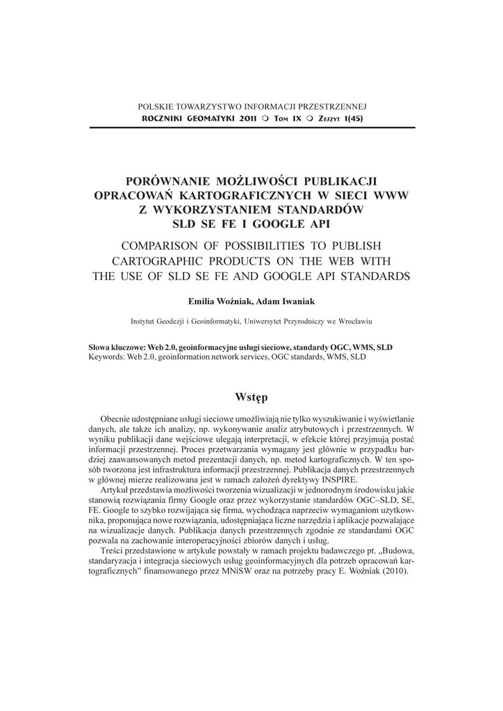 standaryzacja i integracja sieciowych us³ug geoinformacyjnych dla potrzeb opracowañ kartograficznych finansowanego przez MNiSW oraz na potrzeby pracy E. Woniak (2010).