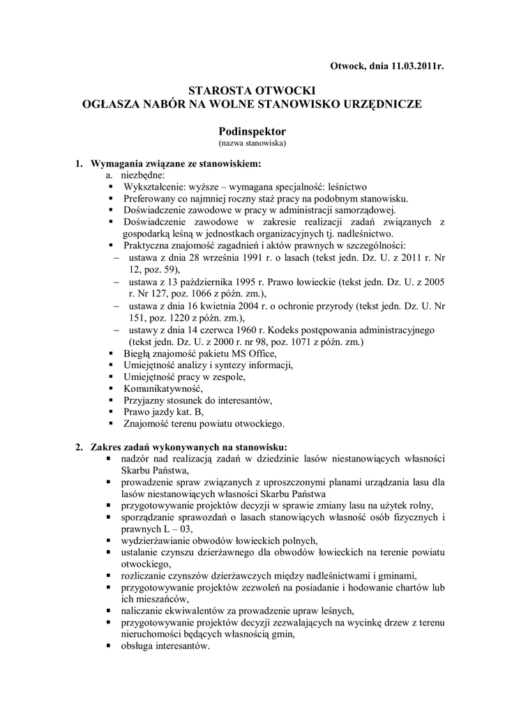 Otwock, dnia 11.03.2011r. STAROSTA OTWOCKI OGŁASZA NABÓR NA WOLNE STANOWISKO URZĘDNICZE Podinspektor (nazwa stanowiska) 1. Wymagania związane ze stanowiskiem: a. niezbędne: Wykształcenie: wyŜsze – wymagana specjalność: leśnictwo Preferowany co najmniej roczny staŜ pracy na podobnym stanowisku. Doświadczenie zawodowe w pracy w administracji samorządowej. Doświadczenie zawodowe w zakresie realizacji zadań związanych z gospodarką leśną w jednostkach organizacyjnych tj. nadleśnictwo. Praktyczna znajomość zagadnień i aktów prawnych w szczególności: − ustawa z dnia 28 września 1991 r. o lasach (tekst jedn. Dz. U. z 2011 r. Nr 12, poz. 59), − ustawa z 13 października 1995 r. Prawo łowieckie (tekst jedn. Dz. U. z 2005 r. Nr 127, poz. 1066 z późn. zm.), − ustawa z dnia 16 kwietnia 2004 r. o ochronie przyrody (tekst jedn. Dz. U. Nr 151, poz. 1220 z późn. zm.), − ustawy z dnia 14 czerwca 1960 r. Kodeks postępowania administracyjnego (tekst jedn. Dz. U. z 2000 r. nr 98, poz. 1071 z późn. zm.) Biegłą znajomość pakietu MS Office, Umiejętność analizy i syntezy informacji, Umiejętność pracy w zespole, Komunikatywność, Przyjazny stosunek do interesantów, Prawo jazdy kat. B, Znajomość terenu powiatu otwockiego. 2. Zakres zadań wykonywanych na stanowisku: nadzór nad realizacją zadań w dziedzinie lasów niestanowiących własności Skarbu Państwa, prowadzenie spraw związanych z uproszczonymi planami urządzania lasu dla lasów niestanowiących własności Skarbu Państwa przygotowywanie projektów decyzji w sprawie zmiany lasu na uŜytek rolny, sporządzanie sprawozdań o lasach stanowiących własność osób fizycznych i prawnych L – 03, wydzierŜawianie obwodów łowieckich polnych, ustalanie czynszu dzierŜawnego dla obwodów łowieckich na terenie powiatu otwockiego, rozliczanie czynszów dzierŜawczych między nadleśnictwami i gminami, przygotowywanie projektów zezwoleń na posiadanie i hodowanie chartów lub ich mieszańców, naliczanie ekwiwalentów za prowadzenie upraw leśnych, przygotowywanie projektów decyzji zezwalających na wycinkę drzew z terenu nieruchomości będących własnością gmin, obsługa interesantów. 2 3. Zakres odpowiedzialności: - Prawidłowa realizacja wszystkich powierzonych obowiązków, - Przestrzeganie obowiązujących przepisów regulujących tok pracy stanowiska, 4. Wymagane dokumenty: - Ŝyciorys (CV ), - list motywacyjny, - kwestionariusz osobowy, - dokument poświadczający wykształcenie ( np. kserokopia dyplomu lub zaświadczenie o stanie odbytych studiów ), - kserokopie innych dodatkowych dokumentów potwierdzających kwalifikacje i umiejętności, - kserokopie świadectw pracy, - oświadczenie o niekaralności za umyślne przestępstwo ścigane z oskarŜenia publicznego lub umyślne przestępstwo skarbowe, - oświadczenie o posiadaniu pełnej zdolności do czynności prawnych oraz o korzystaniu z pełni praw publicznych, - oświadczenie odnośnie pracy w organach samorządu terytorialnego lub kserokopia zaświadczenia o zdaniu z wynikiem pozytywnym egzaminu kończącego słuŜbę przygotowawczą. 5. zatrudnienie na wyŜej wymienionym stanowisku mogą ubiegać się: - tylko obywatele polscy, bowiem praca polega na bezpośrednim lub pośrednim udziale w wykonywaniu władzy publicznej i funkcji mających na celu ochronę generalnych interesów państwa*, - obywatele polscy i pozostałych krajów Unii Europejskiej oraz innych państw, którym na podstawie umów międzynarodowych lub przepisów prawa wspólnotowego przysługuje prawo do podjęcia zatrudnienia na terytorium Rzeczypospolitej Polskiej, pod warunkiem, Ŝe cudzoziemcy posiadają znajomość języka polskiego potwierdzoną dokumentem określonym w przepisach o słuŜbie cywilnej.* * niepotrzebne skreślić. Wymagane dokumenty aplikacyjne naleŜy składać - w terminie 14 dni od daty opublikowania ogłoszenia w Biuletynie Informacji Publicznej Starostwa Powiatowego w Otwocku ( www.powiat-otwocki.pl ), to jest do dnia 28 marca 2011r – w Starostwie Powiatowym w Otwocku ul. Górna 13, 05-400 Otwock osobiście lub drogą pocztową; w przypadku posiadania uprawnień do podpisu elektronicznego dokumenty aplikacyjne moŜna przesłać na adres: [email protected]. Aplikacje, które wpłyną do Starostwa po terminie nie będą rozpatrywane. Informacja o wyniku naboru będzie umieszczona na stronie internetowej Biuletynu Informacji Publicznej Starostwa Powiatowego w Otwocku oraz na tablicy ogłoszeń w siedzibie Starostwa. Wymagane dokumenty aplikacyjne: list motywacyjny, szczegółowe CV ( z uwzględnieniem dokładnego przebiegu kariery zawodowej ), powinny być opatrzone klauzulą: wyraŜam zgodę na przetwarzanie moich danych osobowych zawartych w ofercie pracy dla potrzeb niezbędnych do realizacji procesu rekrutacji zgodnie z ustawą z dnia 3 29 sierpnia 1997r o ochronie danych osobowych ( dz.U. z 2002r, nr 101, poz. 926 z p. zm. ) oraz ustawą z dnia21 listopada 2008r o pracownikach samorządowych ( Dz.U. nr 223, poz. 1458 ).