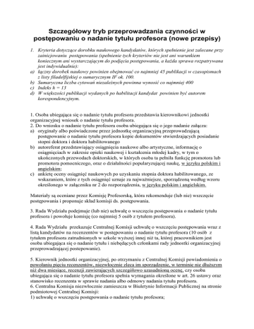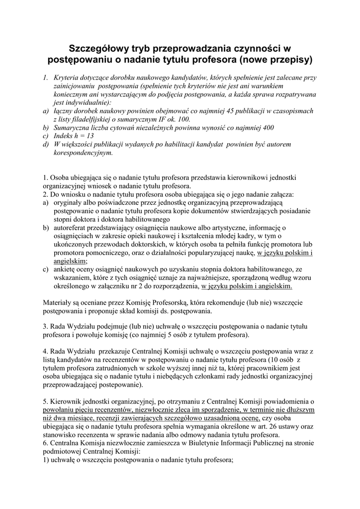 Szczegółowy tryb przeprowadzania czynności w postępowaniu o nadanie tytułu profesora (nowe przepisy) 1. Kryteria dotyczące dorobku naukowego kandydatów, których spełnienie jest zalecane przy zainicjowaniu postępowania (spełnienie tych kryteriów nie jest ani warunkiem koniecznym ani wystarczającym do podjęcia postępowania, a kaŜda sprawa rozpatrywana jest indywidualnie): a) łączny dorobek naukowy powinien obejmować co najmniej 45 publikacji w czasopismach z listy filadelfijskiej o sumarycznym IF ok. 100. b) Sumaryczna liczba cytowań niezaleŜnych powinna wynosić co najmniej 400 c) Indeks h = 13 d) W większości publikacji wydanych po habilitacji kandydat powinien być autorem korespondencyjnym. 1. Osoba ubiegająca się o nadanie tytułu profesora przedstawia kierownikowi jednostki organizacyjnej wniosek o nadanie tytułu profesora. 2. Do wniosku o nadanie tytułu profesora osoba ubiegająca się o jego nadanie załącza: a) oryginały albo poświadczone przez jednostkę organizacyjną przeprowadzającą postępowanie o nadanie tytułu profesora kopie dokumentów stwierdzających posiadanie stopni doktora i doktora habilitowanego b) autoreferat przedstawiający osiągnięcia naukowe albo artystyczne, informację o osiągnięciach w zakresie opieki naukowej i kształcenia młodej kadry, w tym o ukończonych przewodach doktorskich, w których osoba ta pełniła funkcję promotora lub promotora pomocniczego, oraz o działalności popularyzującej naukę, w języku polskim i angielskim; c) ankietę oceny osiągnięć naukowych po uzyskaniu stopnia doktora habilitowanego, ze wskazaniem, które z tych osiągnięć uznaje za najwaŜniejsze, sporządzoną według wzoru określonego w załączniku nr 2 do rozporządzenia, w języku polskim i angielskim. Materiały są oceniane przez Komisję Profesorską, która rekomenduje (lub nie) wszczęcie postępowania i proponuje skład komisji ds. postępowania. 3. Rada Wydziału podejmuje (lub nie) uchwałę o wszczęciu postępowania o nadanie tytułu profesora i powołuje komisję (co najmniej 5 osób z tytułem profesora). 4. Rada Wydziału przekazuje Centralnej Komisji uchwałę o wszczęciu postępowania wraz z listą kandydatów na recenzentów w postępowaniu o nadanie tytułu profesora (10 osób z tytułem profesora zatrudnionych w szkole wyŜszej innej niŜ ta, której pracownikiem jest osoba ubiegająca się o nadanie tytułu i niebędących członkami rady jednostki organizacyjnej przeprowadzającej postepowanie). 5. Kierownik jednostki organizacyjnej, po otrzymaniu z Centralnej Komisji powiadomienia o powołaniu pięciu recenzentów, niezwłocznie zleca im sporządzenie, w terminie nie dłuŜszym niŜ dwa miesiące, recenzji zawierających szczegółowo uzasadnioną ocenę, czy osoba ubiegająca się o nadanie tytułu profesora spełnia wymagania określone w art. 26 ustawy oraz stanowisko recenzenta w sprawie nadania albo odmowy nadania tytułu profesora. 6. Centralna Komisja niezwłocznie zamieszcza w Biuletynie Informacji Publicznej na stronie podmiotowej Centralnej Komisji: 1) uchwałę o wszczęciu postępowania o nadanie tytułu profesora; 2) listę recenzentów; 3) recenzje. 7. Komisja, po zapoznaniu się z recenzjami, przedstawia Radzie Wydziału wniosek w sprawie poparcia lub odmowy poparcia wniosku o nadanie tytułu profesora. 8. Rada Wydziału podejmuje uchwałę w sprawie poparcia lub odmowy poparcia wniosku o nadanie tytułu profesora. 9. Uchwała w sprawie poparcia wniosku o nadanie tytułu profesora jest ogłaszana na stronie internetowej szkoły wyŜszej lub jednostki organizacyjnej oraz Centralnej Komisji. 10. Rada Wydziału, po podjęciu uchwały popierającej wniosek o nadanie tytułu profesora przesyła go wraz z aktami postępowania, w terminie 1 miesiąca od podjęcia uchwały, do Centralnej Komisji. 11. Centralna Komisja podejmuje uchwałę o przedstawieniu albo o odmowie przedstawienia kandydata do tytułu profesora w terminie do 6 miesięcy od dnia otrzymania uchwały. 12. Centralna Komisja, w terminie 1 miesiąca od podjęcia uchwały o przedstawieniu kandydata do tytułu, składa do Prezydenta Rzeczypospolitej Polskiej wniosek o nadanie tytułu profesora. 13. W przypadku podjęcia uchwały o odmowie przedstawienia kandydata do tytułu profesora, rada jednostki organizacyjnej lub osoba ubiegająca się o nadanie tytułu moŜe, w terminie 3 miesięcy od dnia doręczenia jej rozstrzygnięcia, wystąpić do Centralnej Komisji z wnioskiem o ponowne rozpatrzenie sprawy. 14. Centralna Komisja rozpatruje wniosek, o którym mowa w ust. 4, w terminie 6 miesięcy od dnia jego doręczenia. Załącznik (wg. Rozporządzenia Ministra Nauki i Szkolnictwa WyŜszego z dnia 22 września 2011 r., Dz. U. Nr 204) ANKIETA OCENY OSIĄGNIĘĆ NAUKOWYCH ALBO ARTYSTYCZNYCH KANDYDATA DO TYTUŁU PROFESORA I. INFORMACJE O OSIĄGNIĘCIACH I DOROBKU 1. Informacja o osiągnięciach i dorobku naukowym: 1) wykaz autorskich publikacji naukowych w czasopismach krajowych i międzynarodowych; 2) wykaz autorskich monografii; 3) wykaz współautorskich publikacji naukowych i udział w opracowaniach zbiorowych; 4) członkostwo w redakcjach naukowych. Wykaz publikacji naleŜy sporządzić ze wskazaniem wskaźnika impact factor publikacji, liczby cytowań publikacji i indeksu Hirscha. 2. Informacja o aktywności naukowej: 1) we wszystkich obszarach wiedzy a) informacje o udziale w krajowych i międzynarodowych konferencjach naukowych, b) członkostwo w komitetach redakcyjnych i radach naukowych czasopism, c) wykaz zrealizowanych projektów naukowo-badawczych krajowych, europejskich i innych międzynarodowych, d) informacje o kierowaniu zespołami badawczymi realizującymi projekty finansowane w drodze konkursów krajowych i zagranicznych; 3. Informacja o współpracy z otoczeniem społecznym i gospodarczym: 1) w obszarach wiedzy: nauk ścisłych, nauk technicznych, nauk przyrodniczych, nauk rolniczych, leśnych i weterynaryjnych, nauk med