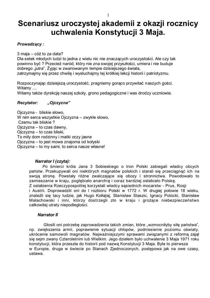 1 Scenariusz uroczystej akademii z okazji rocznicy uchwalenia Konstytucji 3 Maja. Prowadzący : 3 maja – cóż to za data? Dla setek młodych ludzi to jedna z wielu nic nie znaczących uroczystości. Ale czy tak powinno być ? Przecież naród, który nie zna swojej przyszłości, umiera i nie buduje dobrego „jutra”. Żyjąc w zwariowanym tempie dzisiejszego świata, zatrzymajmy się przez chwilę i wysłuchajmy tej krótkiej lekcji historii i patriotyzmu. Rozpoczynając dzisiejszą uroczystość, pragniemy gorąco przywitać naszych gości. Witamy .... Witamy także dyrekcję naszej szkoły, grono pedagogiczne i was drodzy uczniowie. Recytator: „Ojczyzna” Ojczyzna - bliskie słowo, W nim serca wszystkie Ojczyzna – zwykłe słowo, Czemu tak bliskie ? Ojczyzna – to czas dawny, Ojczyzna – to czas bliski, To miły dom rodzinny i matki oczy jasne Ojczyzna – to jest mowa znajoma od kołyski Ojczyzna – to my sami, to serca nasze własne! Narrator I (czyta): Po śmierci króla Jana 3 Sobieskiego o tron Polski zabiegali władcy obcych państw. Przekupywali oni niektórych magnatów polskich i starali się przeciągnąć ich na swoją stronę. Powstały różne zwalczające się obozy i stronnictwa. Powodowało to zamieszanie w kraju, pogłębiało anarchi ę i coraz bardziej osłabiało Polskę. Z osłabienia Rzeczypospolitej korzystali władcy sąsiednich mocarstw - Prus, Rosji i Austrii. Doprowadzili oni do l rozbioru Polski w 1772 r. W drugiej połowie 18 wieku, znaleźli się tacy ludzie, jak Hugo Kołłątaj, Stanisław Staszic, Ignacy Potocki, Stanisław Małachowski i inni, którzy dostrzegli zło w kraju i grożące niebezpieczeństwo całkowitej utraty niepodległości. Narrator II Głosili oni potrzebę zaprowadzenia takich zmian, które „wzmocniłyby siłę państwa”, np. zwiększenia armii, poprawienie sytuacji chłopów, podniesienie poziomu oświaty, ukrócenie samowoli magnatów. Najważniejszymi sprawami związanymi z reformą zajął się sejm zwany Czteroletnim lub Wielkim. Jego dziełem było uchwalenie 3 Maja 1971 roku konstytucji, która przeszła do historii pod nazwą Konstytucji 3 Maja. Była to pierwsza w Europie, druga w świecie po Stanach Zjednoczonych, postępowa jak na owe czasy, ustawa. 2 Narrator I Konstytucja budziła nadzieję na wyprowadzenie Polski z niewoli i uratowanie jej zagrożonej niepodległości. Przetrwała w tradycji jako ukoronowanie starań patriotów polskich o uratowanie Ojczyzny.^ Chór szkolny śpiewa pieśń pt. „Trzeci Maj", słowa: Rajnold Suchodolski. 1. Witaj majowa jutrzenko Świeć naszej polskiej krainie Uczcimy ciebie piosenką Polska nigdy nie zaginie, Ref. Witaj Maj, 3 Maj Dla Polaków błogi raj. 2. Nierząd braci naszych cisnął gnuśność w rakach króla spala A wtem 3 Maj zabłysnął l nasza Polska powstała. Ref. Wiwat Maj, piękny Maj Wiwat wielki Kołłątaj. Recytator: Cala stolica od rana Huczy, jak rzeka wezbrana. Poprzez ludu gwarne mrowie Ciągną na zamek posłowie. We wielkiej sali zamkowej Gromkie okrzyki, przemowy. Wchodzi król. W radosnej wrzawie Zebranych wita łaskawie. Nagle milknie ciżba zbita Marszałek ustawę czyta. Wielka ma zawitać zmiana: Wolność, równość wszystkim dana. Wszyscy zjednoczą się w pracy: Szlachta, mieszczanie, wieśniacy. Lecz wszyscy też w równej mierze Polsce winni służyć szczerze. Kto za tym, nich głos swój poda. Jeden okrzyk: „Zgoda! Zgoda!"^ Niech żyje sejm. król kochany" Niechaj żyją wszystkie stany! Byle razem, ramie w ramie A wszystko zło się przełamie. Zapamiętajże narodzie: ,. W waśni zguba, silą w zgodzie ", Chór 3 (Na scenę wchodzi dwoje uczniów przebranych za matkę z synem ) S: Mamusiu, co oni wołają? M: Cieszą się ze święta S :A co to za święto? Czemu mamuś nie odpowiadasz? Taką masz dziwną minę. M: Bo nie wiem, dziecino, jak ci to wytłumaczyć. Malutki jeszcze jesteś, to nie zrozumiesz. Wiesz, że jak bawisz się zgodnie z dziećmi, to mamusia się cieszy. Wiesz synku , co to jest zgoda? S: Wiem mamusiu. Jak się nie kłócimy przy zabawie. M :Dziś jest święto zgody. Dziś w całej Polsce, jak długa i szeroka, zgodzili się ludzie na jedno. Zgodził się król z narodem, naród z królem. Zgodzili się wielcy z małymi, bogacze z biednymi. Cały kraj się pogodził i myśli nad tym jak rządzić, żeby z tej zgody jak najwięcej pożytku wynikło i dla wszystkich i dla każdego z osobna. Król Polski Stanisław August będzie składał przysięgę. S :A co to jest przysięga? M :Przysięga to taka obietnica , której trzeba dotrzymać. Daje sieją Bogu. nie ludziom i tylko Pan Bóg może od niej zwolnić! S :A co król, mamusiu, będzie obiecywał? Że będzie wiernie narodowi służył i jego praw przestrzegał. że sprawiedliwie będzie rządził i do krzywdy ludzkiej nie dopuści. S :Mamusiu, a czyja mógłbym przysiąc? Ja bym tak strasznie chciał przysiąc. Pozwól mamuś! M :Na co chcesz przysiąc? S :Że będę zawsze kochał wszystkich, że się nie będę kłócił, że się będę dobrze uczył, ze nie będę robił krzywdy nikomu. M :Dobrze, synku, możesz przysiąc, ale pamiętaj ze musisz obietnicy dotrzymać. Piosenka: „ Nadzieja” J. Pietrzaka w wykonaniu dwóch uczennic. Recytator: A jak cię kto zapyta: Kto ty taki, skąd ty rodem? Mów, żeś z tego łanu żyta, żeś z tych łąk, co pachną miodem. Mów, że jesteś z takiej chaty, co Piastowską chatą była. Żeś z tej ziemi, której kwiaty Gorzka rosa wykarmiła. 4 Recytator: Staliśmy ongiś na rozstaju, wielu minionych, błędnych dróg! Tyś wywiódł nas o Trzeci Maju na prawy próg! Myśl nasza rwała się w rozterce, w zamęcie chceń, w chaosie prób! Tyś zbudził prawe, wielkie serce złu wyrwały łup. I dusza polska dzięki tobie rozkwitła pięknem wiernych tchnień... Więc zawsze, w szczęściu czy w żałobie -ten pomnisz dzień. Narrator: II Konstytucja 3 Maja obowiązywała tylko 14 miesięcy. Nastąpił 