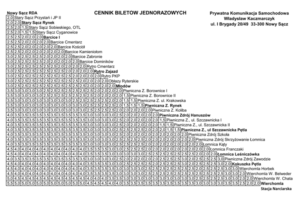 Nowy Sącz RDA CENNIK BILETÓW JEDNORAZOWYCH Prywatna Komunikacja Samochodowa 2,0 Stary Sącz Przystań i JP II Władysław Kaczmarczyk 2,0 2,0 Stary Sącz Rynek ul. I Brygady 20/49 33-300 Nowy Sącz 2,5 2,0 1,5 Stary Sącz Sobieskiego, OTL 2,5 2,0 1,5 1,5 Stary Sącz Cyganowice 2,5 2,5 2,0 2,0 2,0 Barcice I 2,5 2,5 2,0 2,0 2,0 2,0 Barcice Cmentarz 2,5 2,5 2,0 2,0 2,0 2,0 2,0 Barcice Kościół 2,5 2,5 2,0 2,0 2,0 2,0 2,0 2,0 Barcice Kamieniołom 3,0 2,5 2,5 2,5 2,5 2,0 2,0 2,0 2,0 Barcice Zabronie 3,0 2,5 2,5 2,5 2,5 2,0 2,0 2,0 2,0 2,0 Barcice Dominików 3,0 2,5 2,5 2,5 2,5 2,5 2,5 2,0 2,0 2,0 2,0 Rytro Cmentarz 3,0 2,5 2,5 2,5 2,5 2,5 2,5 2,5 2,0 2,0 2,0 2,0 Rytro Zajazd 3,0 2,5 2,5 2,5 2,5 2,5 2,5 2,5 2,5 2,0 2,0 2,0 2,0 Rytro PKP 3,0 2,5 2,5 2,5 2,5 2,5 2,5 2,5 2,5 2,5 2,0 2,0 2,0 2,0 Obłazy Ryterskie 3,0 2,5 2,5 2,5 2,5 2,5 2,5 2,5 2,5 2,5 2,5 2,0 2,0 2,0 2,0 Młodów 3,5 3,0 3,0 3,0 3,0 2,5 2,5 2,5 2,5 2,5 2,5 2,5 2,0 2,0 2,0 2,0 Piwniczna Z. Borownice I 3,5 3,0 3,0 3,0 3,0 2,5 2,5 2,5 2,5 2,5 2,5 2,5 2,0 2,0 2,0 2,0 1,5 Piwniczna Z. Borownice II 3,5 3,0 3,0 3,0 3,0 3,0 3,0 3,0 3,0 2,5 2,5 2,5 2,5 2,5 2,0 2,0 1,5 1,5 Piwniczna Z. ul. Krakowska 3,5 3,0 3,0 3,0 3,0 3,0 3,0 3,0 3,0 3,0 3,0 2,5 2,5 2,5 2,5 2,0 1,5 1,5 1,5 Piwniczna Z. Rynek 3,5 3,0 3,0 3,0 3,0 3,0 3,0 3,0 3,0 3,0 3,0 2,5 2,5 2,5 2,5 2,0 2,0 2,0 2,0 2,0 Piwniczna Z. Koliba 4,0 3,5 3,5 3,5 3,5 3,5 3,5 3,5 3,5 3,5 3,5 3,0 3,0 3,0 3,0 2,5 2,0 2,0 2,0 2,0 2,0 Piwniczna Zdrój Hanuszów 4,0 3,5 3,5 3,5 3,5 3,5 3,5 3,5 3,5 3,5 3,5 3,0 3,0 3,0 3,0 2,5 2,0 2,0 2,0 2,0 2,0 1,5 Piwniczna Z., ul. Szczawnicka I 4,0 3,5 3,5 3,5 3,5 3,5 3,5 3,5 3,5 3,5 3,5 3,0 3,0 3,0 3,0 2,5 2,0 2,0 2,0 2,0 2,0 1,5 1,5 Piwniczna Z., ul. Szczawnicka II 4,0 3,5 3,5 3,5 3,5 3,5 3,5 3,5 3,5 3,5 3,5 3,0 3,0 3,0 3,0 2,5 2,5 2,5 2,5 2,0 2,0 2,0 1,5 1,5 Piwniczna Z., ul Szczawnicka Pętla 4,0 3,5 3,5 3,5 3,5 3,5 3,5 3,5 3,5 3,5 3,5 3,0 3,0 3,0 3,0 2,5 2,0 2,0 2,0 2,0 2,0 2,0 2,0 2,0 2,0 Piwniczna Zdrój Szkoła 4,0 3,5 3,5 3,5 3,5 3,5 3,5 3,5 3,5 3,5 3,5 3,0 3,0 3,0 3,0 2,5 2,5 2,5 2,5 2,0 2,0 2,0 2,0 2,0 2,0 2,0 Piwniczna Zdrój Skrzyżowanie Łomnica 4,0 3,5 3,5 3,5 3,5 3,5 3,5 3,5 3,5 3,5 3,5 3,0 3,0 3,0 3,0 2,5 2,5 2,5 2,5 2,0 2,0 2,0 2,0 2,0 2,0 2,0 2,0 Łomnica Kąty 4,5 4,0 4,0 4,0 4,0 4,0 4,0 4,0 4,0 4,0 4,0 3,5 3,5 3,5 3,0 3,0 2,5 2,5 2,5 2,0 2,0 2,0 2,0 2,0 2,0 2,0 2,0 2,0 Łomnica Franczaki 4,5 4,0 4,0 4,0 4,0 4,0 4,0 4,0 4,0 4,0 4,0 3,5 3,5 3,5 3,0 3,0 3,0 3,0 3,0 2,5 2,5 2,5 2,5 2,5 2,5 2,5 2,0 2,0 2,0 Łomnica Leśniczówka 4,0 3,5 3,5 3,5 3,5 3,5 3,5 3,5 3,5 3,5 3,5 3,0 3,0 3,0 3,0 2,5 2,0 2,0 2,0 2,0 2,0 2,5 2,5 2,5 3,0 2,0 2,5 2,5 2,5 3,0 Piwniczna Zdrój Zawodzie 4,5 4,0 4,0 4,0 4,0 4,0 4,0 4,0 4,0 4,0 4,0 3,5 3,5 3,5 3,0 3,0 2,5 2,5 2,5 2,5 2,0 2,5 2,5 2,5 3,0 2,0 2,5 2,5 2,5 3,0 2,0 Kokuszka Pętla 4,5 4,0 4,0 4,0 4,0 4,0 4,0 4,0 4,0 4,0 4,0 3,5 3,5 3,5 3,5 3,0 3,0 3,0 3,0 2,5 2,5 2,5 2,5 2,5 2,5 2,5 2,0 2,5 2,5 2,5 3,0 3,0 Wierchomla Horbek 4,5 4,0 4,0 4,0 4,0 4,0 4,0 4,0 4,0 4,0 4,0 3,5 3,5 3,5 3,5 3,0 3,0 3,0 3,0 2,5 2,5 2,5 2,5 2,5 2,5 2,5 2,5 2,5 2,5 2,5 3,0 3,0 2,0 Wierchomla W. Belweder 5,0 4,5 4,5 4,5 4,5 4,5 4,5 4,5 4,5 4,5 4,5 4,0 4,0 4,0 3,5 3,5 3,0 3,0 3,0 3,0 3,0 3,0 3,0 3,0 3,0 3,0 2,5 2,5 2,5 2,5 3,0 3,0 2,0 2,0 Wierchomla W. Chata 5,5 5,0 5,0 5,0 5,0 5,0 5,0 5,0 5,0 5,0 5,0 4,5 4,5 4,5 4,0 4,0 3,5 3,5 3,5 3,5 3,5 3,5 3,5 3,5 3,5 3,5 3,0 3,0 3,0 3,0 3,5 3,5 2,5 2,0 2,0 Wierchomla Stacja Narciarska