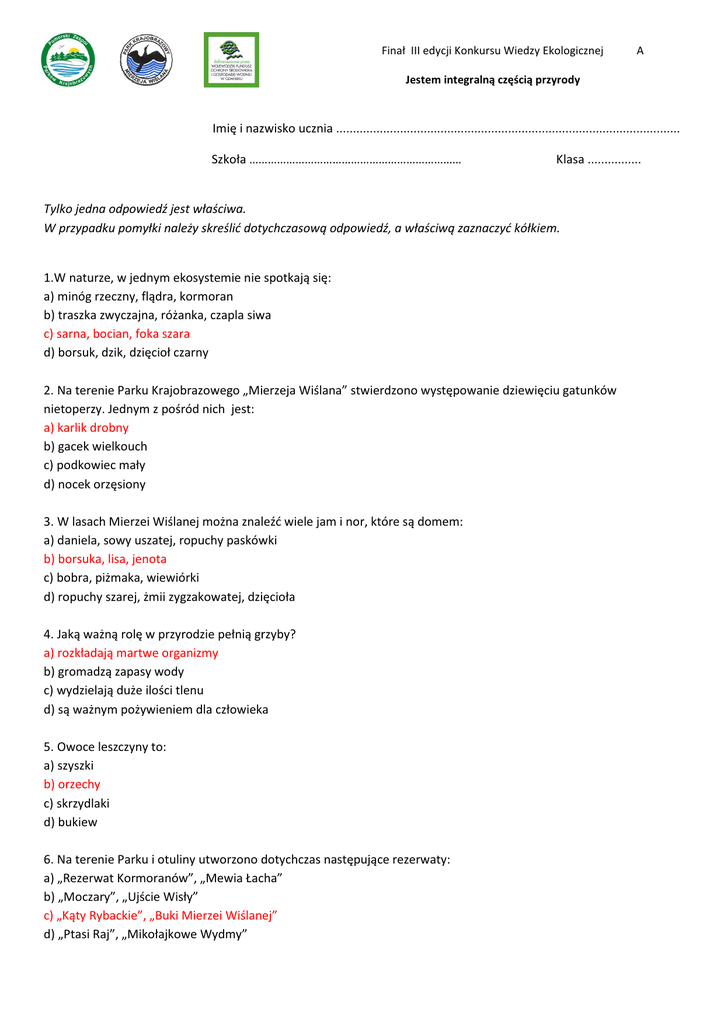 Test z odpowiedziami wersja A - Park Krajobrazowy „Mierzeja