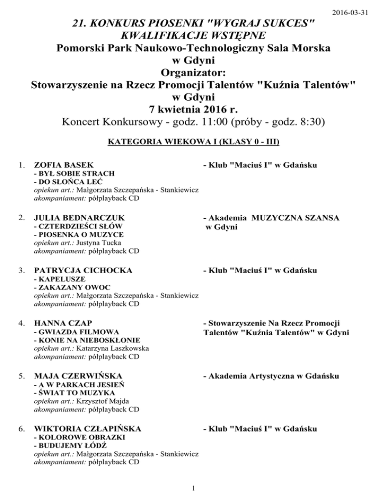 2016-03-31 21. KONKURS PIOSENKI "WYGRAJ SUKCES" KWALIFIKACJE WSTĘPNE Pomorski Park Naukowo-Technologiczny Sala Morska w Gdyni Organizator: Stowarzyszenie na Rzecz Promocji Talentów "Kuźnia Talentów" w Gdyni 7 kwietnia 2016 r. Koncert Konkursowy - godz. 11:00 (próby - godz. 8:30) KATEGORIA WIEKOWA I (KLASY 0 - III) 1. ZOFIA BASEK - Klub "Maciuś I" w Gdańsku - BYŁ SOBIE STRACH - DO SŁOŃCA LEĆ opiekun art.: Małgorzata Szczepańska - Stankiewicz akompaniament: półplayback CD 2. JULIA BEDNARCZUK - Akademia MUZYCZNA SZANSA w Gdyni - CZTERDZIEŚCI SŁÓW - PIOSENKA O MUZYCE opiekun art.: Justyna Tucka akompaniament: półplayback CD 3. PATRYCJA CICHOCKA - Klub "Maciuś I" w Gdańsku - KAPELUSZE - ZAKAZANY OWOC opiekun art.: Małgorzata Szczepańska - Stankiewicz akompaniament: półplayback CD 4. HANNA CZAP - Stowarzyszenie Na Rzecz Promocji Talentów "Kuźnia Talentów" w Gdyni - GWIAZDA FILMOWA - KONIE NA NIEBOSKŁONIE opiekun art.: Katarzyna Laszkowska akompaniament: półplayback CD 5. MAJA CZERWIŃSKA - Akademia Artystyczna w Gdańsku - A W PARKACH JESIEŃ - ŚWIAT TO MUZYKA opiekun art.: Krzysztof Majda akompaniament: półplayback CD 6. - Klub "Maciuś I" w Gdańsku WIKTORIA CZŁAPIŃSKA - KOLOROWE OBRAZKI - BUDUJEMY ŁÓDŹ opiekun art.: Małgorzata Szczepańska - Stankiewicz akompaniament: półplayback CD 1 2016-03-31 7. MAJA DEJA - Klub "Maciuś I" w Gdańsku - SŁOWA WOKÓŁ NAS - LALECZKA Z SASKIEJ PORCELANY opiekun art.: Małgorzata Szczepańska - Stankiewicz akompaniament: półplayback CD 8. AMELKA DZIURDZIEWICZ - Akademia "Muzyczna SZANSA" w Gdyni - DO GÓRY, DO GÓRY - DAMĄ BYĆ opiekun art.: Justyna Tucka akompaniament: półplayback CD 9. IGA KASPEROWICZ - Klub "Maciuś I" w Gdańsku - KOCI WESOŁY ŚWIAT - PIOSENKA DREWNIANYCH LALEK opiekun art.: Małgorzata Szczepańska - Stankiewicz akompaniament: półplayback CD 10. PIOTR KOWALCZYK - Klub "Maciuś I" w Gdańsku - NA MOŚCIE WIARY - ZAKAZANY OWOC opiekun art.: Małgorzata Szczepańska - Stankiewicz akompaniament: półplayback CD 11. WIKTORIA KOWALSKA - Chwaszczyno - KOCHAM MAMĘ - KIEDYŚ WE ŚNIE Z BAJKI ŚPIĄCA KRÓLEWNA opiekun art.: Joanna Chęcińska akompaniament: półplayback CD 12. KINGA KOZICKA - Klub "Maciuś I" w Gdańsku - OSTATNI TAKI WÓZ - ŚRUBKI PANA MICHAŁA opiekun art.: Małgorzata Szczepańska - Stankiewicz akompaniament: półplayback CD 13. DOMINIKA KUCIABA - Akademia "Muzyczna SZANSA" w Gdyni - ŚPIEWAM I TAŃCZĘ - ODPUŚĆ SOBIE WRZUĆ NA LUZ opiekun art.: Justyna Tucka akompaniament: półplayback CD 14. MAJA KURSZEWSKA - Stowarzyszenie Na Rzecz Promocji Talentów "Kuźnia Talentów" w Gdyni - BANALNY BLUES - ZAWSZE NAJ opiekun art.: Katarzyna Laszkowska akompaniament: półplayback CD 2 2016-03-31 15. KINGA LESZCZYŃSKA - Stowarzyszenie Na Rzecz Promocji Talentów "Kuźnia Talentów" w Gdyni - DRZWI DO KARIERY - BLUES BUJANY opiekun art.: Katarzyna Laszkowska akompaniament: półplayback CD 16. KINGA LIS - Akademia "Muzyczna SZANSA" w Gdyni - ŚMIESZNA PIOSENKA - BLUES BUJANY opiekun art.: Justyna Tucka akompaniament: półplayback CD 17. PAULINA PAWELSKA - Klub "Maciuś I" w Gdańsku - ŚRUBKI PANA MICHAŁA - LALECZKA Z SASKIEJ PORCELANY opiekun art.: Małgorzata Szczepańska - Stankiewicz akompaniament: półplayback CD 18. MAGDALENA PILANOWSKA - Stowarzyszenie Na Rzecz Promocji Talentów "Kuźnia Talentów" w Gdyni - RÓŻOWA PIOSENKA - MYSZKA WIDZIAŁA OSTATNIA opiekun art.: Katarzyna Laszkowska akompaniament: półplayback CD 19. WERONIKA RICHTER - Gdańska Szkoła Artystyczna w Gdańsku - ŻYJ DO PRZODU - CUD W SZAFIE opiekun art.: Dominika Radwan akompaniament: półplayback CD 20. KAMILA ROMAN - Gdańska Szkoła Artystyczna w Gdańsku - PIOSENKA DREWNIANYCH LALEK - NIE PYTAJ MNIE opiekun art.: Dominika Radwan akompaniament: półplayback CD 21. ALEKSANDRA SUJKA - Akademia "Muzyczna SZANSA" w Gdyni - ŚPIEWAM I TAŃCZĘ - DAJ MI RĘKĘ TATO opiekun art.: Justyna Tucka akompaniament: półplayback CD 22. ZUZANNA WASILEWSKA - Klub "Maciuś I" w Gdańsku - SŁOWA WOKÓŁ NAS - RYTM I MELODIA opiekun art.: Małgorzata Szczepańska - Stankiewicz akompaniament: półplayback CD 3 2016-03-31 23. MAJA WIECZOREK - Stowarzyszenie Na Rzecz Promocji Talentów "Kuźnia Talentów" w Gdyni - KOCI WESOŁY ŚWIAT - PRZYJACIEL WIE opiekun art.: Katarzyna Laszkowska akompaniament: półplayback CD 24. EMILA WIERZBICKA - Akademia "Muzyczna SZANSA" w Gdyni - ŚRUBKI PANA MICHAŁA - KUNDEL BURY opiekun art.: Justyna Tucka akompaniament: półplayback CD 25. DOMINIKA WÓJCIK - Klub "Maciuś I" w Gdańsku - KOLOROWE OBRAZKI - MOTYLEM BYŁAM opiekun art.: Małgorzata Szczepańska - Stankiewicz akompaniament: półplayback CD 26. ALEKSANDRA WRÓBLEWSKA - Klub "Maciuś I" w Gdańsku - OKULARY MAM NA NOSIE - BYŁ SOBIE STRACH opiekun art.: Małgorzata Szczepańska - Stankiewicz akompaniament: półplayback CD KATEGORIA WIEKOWA II (KLASY IV - VI) 1. MACIEJ ANTOŃCZAK - Stowarzyszenie Na Rzecz Promocji Talentów "Kuźnia Talentów" w Gdyni - ODPUŚĆ SOBIE WRZUĆ NA LUZ - ZA MAŁY opiekun art.: Katarzyna Laszkowska akompaniament: półplayback CD 2. IZABELA BASIŃSKA - Stowarzyszenie Na Rzecz Promocji Talentów "Kuźnia Talentów" w Gdyni - PRZEBUDZENIE IKARA - CZAS NAS UCZY POGODY opiekun art.: Katarzyna Laszkowska akompaniament: półplayback CD 3. ZUZANNA DRAMCZYK - Stowarzyszenie Na Rzecz Promocji Talentów "Kuźnia Talentów" w Gdyni - PIOSENKA DREWNIANYCH LALEK - ENE DUE RABE SWING opiekun art.: Katarzyna Laszkowska akompaniament: półplayback CD 4. - Klub "Maciuś I" w Gdańsku LAURA DUBIEŃSKA - NA MOŚCIE WIARY - ŁÓDŹ BLISKA, DALEKA opiekun art.: Małgorzata Szczepańska - Stankiewicz akompaniament: półplayback CD 4 2016-03-31 5. PIOTR HAŁASA - Centrum Kultury 105 w Koszalinie - DZIKI KOT - A JA PO PROSTU FRAJDĘ MAM opiekun art.: Ewa Turowska akompaniament: półplayback CD 6. - Szkoła Podstawowa nr 44 w Gdańsku ZUZANNA KOTUS - MAŁE EM - PRZYJACIEL DESZCZOWĄ PORĄ opiekun art.: