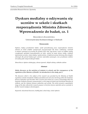 Naukowy Przegląd Dziennikarski Nr 1/2016 Journalism Research Review Quarterly Dyskurs medialny o odżywaniu się uczniów w szkole i skutkach rozporządzenia Ministra Zdrowia. Wprowadzenie do badań, cz. 1 MAŁGORZATA KALISZEWSKA Uniwersytet Jana Kochanowskiego w Kielcach Streszczenie Dyskurs, będący przedmiotem badań, został sprowokowany przez rozporządzenie ministra zdrowia na temat środków spożywczych przeznaczonych dla dzieci i młodzieży i zaistniał w ramach czasowych od września do grudnia 2015 roku. Jego forma i treści są źródłem wiedzy o językowych sposobach komunikowania się ludzi, mówią na temat obrazu szkoły i edukacji żywieniowej uczniów, relacji władzy i społeczeństwa. Artykuł prezentuje ilościowy obraz danych, zebranych dla potrzeb badawczych w formie materiałów prasowych, oraz przedstawia niektóre ich analizy jako wstęp do dalszych badań. Słowa-klucze: dyskurs edukacyjny, zdrowa żywność, sklepik szkolny, stołówka szkolna Abstract Media discourse on the nutrition of students in schools and the consequences of the regulation of the Minister of Health. An introduction to the study, part 1 The discourse which is the subject of the research was provoked by the Ministry of Health regulation on foods intended for children and adolescents and came into being within the timeframe between September and December 2015. Its form and content are a source of knowledge about the linguistic methods of human communication, on the image of schools and nutritional education of students, and the relations between authorities and society. The article presents a quantitative image of the data collected for research purpose in the form of press materials and as a prelude to further research analyzes selected papers. Keywords: educational discourse, healthy food, school shop, school cafeteria 19 Naukowy Przegląd Dziennikarski Nr 1/2016 Journalism Research Review Quarterly Celem artykułu jest nie tylko przedstawienie genezy i treści dyskursu medialnego, wywołanego Rozporządzeniem Ministra Zdrowia z dnia 28 sierpnia 2015 roku „w sprawie środków spożywczych przeznaczonych do sprzedaży dzieciom i młodzieży [...]”1, który zaistniał i przetoczył się przez prasę ogólnopolską i regionalną2, głównie w przedziale czasowym od września do grudnia 2015 roku, ale też zaprezentowanie wstępnych wyników badań, dotyczących niektórych jego aspektów ilościowych i językowych; jego dynamiki i tła. Jest to rodzaj społecznej debaty, którą można nazwać dyskursem edukacyjnym, gdyż dotyczy głównie szkoły i uczniów, ale też społecznego uczenia się za pośrednictwem mediów. Zainteresowanie tym dyskursem wynika z kilku powodów. Po pierwsze takie połączenie dyscyplin medioznawstwa i pedagogiki ma swój symboliczny początek w pierwszych badaniach zawartości prasy, opublikowanych przez Jana Władysława Dawida, pedagoga i dziennikarza już w roku 18893, nie jest więc niczym nowym, a współcześnie nawet liczba takich publikacji wzrasta. Ze względu na tematykę, jest to dyskurs ważny tak dla dziennikarzy, jak i dla pedagogów, głównie pedagogów zdrowia. Po drugie widoczny brak w tym dyskursie głosu nauczycieli, sugeruje potrzebę przygotowywania w ramach studiów przyszłych pedagogów i nauczycieli do udziału w takich dyskursach, przez specjalne ćwiczenia pisarskie, uczelniane debaty oraz odnoszenie się podczas wybranych zajęć do aktualnych medialnych dyskursów. Jest to konieczne dla budowania w przyszłych nauczycielach i pedagogach poczucia sprawstwa i kompetencji, pozwalających na kontakt z mediami i wyrażanie w dyskursach własnych opinii na podejmowane tematy. Dyskurs ten jest również pouczający dla przyszłych dziennikarzy, pokazuje bowiem możliwości podejścia do tematu, formy i język przekazu oraz wpływu na odbiorcę. Opracowanie sytuuję na styku pedagogiki zdrowia i pedagogiki mediów, a zaplanowane badania - w obrębie ilościowo-jakościowej krytycznej analizy dyskursu (KAD). Obejmuje ono wstępną, głównie ilościową analizę zebranego materiału badawczego oraz wskazuje dalsze pola badawcze tego dyskursu. I. GENEZA, CEL I TREŚCI DYSKURSU MEDIALNEGO (NA PRZYKŁADZIE DYSKURSU PRASOWEGO) Impulsem, który wywołał interesujący nas dyskurs prasowy, stało się Rozporządzenie Ministra Zdrowia z dnia 28 sierpnia 2015 roku, poz. 1256 „w sprawie środków spożywczych przeznaczonych do sprzedaży dzieciom i młodzieży w jednostkach systemu oświaty Dziennik Ustaw Rzeczypospolitej Polskiej, Warszawa, dnia 15 sierpnia 2015. Dyskurs istniał również w innych mediach, także w Internecie, ale dla celów badawczych wybrałam wyłącznie dyskurs prasowy. 3 M. Lisowska-Magdziarz, Analiza zawartości mediów. Przewodnik dla studentów. Wersja 1.1, Kraków 2004, s. 18. 1 2 20 Naukowy Przegląd Dziennikarski Nr 1/2016 Journalism Research Review Quarterly oraz wymagań, jakie muszą spełnić środki spożywcze stosowane w ramach żywienia zbiorowego dzieci i młodzieży w tych jednostkach”4. Załączniki do rozporządzenia regulują w sposób bardzo szczegółowy wymagania wobec środków spożywczych, przez co wywołały dyskusję nad zasadnością takich ustaleń, ich wykonalnością, konsekwencjami ekonomicznymi, zdrowotnymi oraz wychowawczymi. Opinię społeczną zbulwersowały głównie regulacje, dotyczące drastycznego ograniczenia stosowania w żywieniu uczniów soli i cukru oraz bardzo konkretne wskazania odnośnie wielkości opakowań, jakości produktów, porcjowania owoców i warzyw, które wymagają od producentów, hurtowników i ajentów wprowadzania nowych rozwiązań i szukania nowych dostawców. Trzeba dodać, że problem jakości towarów sprzedawanych w szkolnych sklepikach nie jest nowy. Był on przedmiotem zainteresowania naukowców i praktyków, a więc przedmiotem dyskursu naukowego i praktycznego, także powodem troski twórców sieci „szkół promujących zdrowie”. Jeszcze na