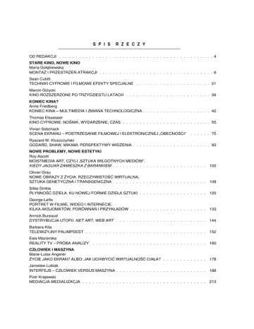 S P I S R Z E C Z Y OD REDAKCJI . . . . . . . . . . . . . . . . . . . . . . . . . . . . . . . . . . . . . . . . . . . . . . 4 STARE KINO, NOWE KINO Maria Gołe˛biewska MONTAŻ I PRZESTRZEŃ ATRAKCJI . . . . . . . . . . . . . . . . . . . . . . . . . . . . . . . . . . 6 Sean Cubitt TECHNIKI CYFROWE I FILMOWE EFEKTY SPECJALNE . . . . . . . . . . . . . . . . . . . . . . 21 Marcin Giżycki KINO ROZSZERZONE PO TRZYDZIESTU LATACH . . . . . . . . . . . . . . . . . . . . . . . . . 36 KONIEC KINA? Anne Friedberg KONIEC KINA – MULTIMEDIA I ZMIANA TECHNOLOGICZNA . . . . . . . . . . . . . . . . . . . . 42 Thomas Elsaesser KINO CYFROWE: NOŚNIK, WYDARZENIE, CZAS . . . . . . . . . . . . . . . . . . . . . . . . . . 55 Vivian Sobchack SCENA EKRANU – POSTRZEGANIE FILMOWEJ I ELEKTRONICZNEJ „OBECNOŚCI” . . . . . . 75 Ryszard W. Kluszczyński GODARD, SHAW, MIKAMI: PERSPEKTYWY WIDZENIA . . . . . . . . . . . . . . . . . . . . . . . 93 NOWE PROBLEMY, NOWE ESTETYKI Roy Ascott MOISTMEDIA ART, CZYLI „SZTUKA WILGOTNYCH MEDIÓW”. KIEDY JAGUAR ZAMIESZKA Z BARANKIEM . . . . . . . . . . . . . . . . . . . . . . . . . . . . 102 Olivier Grau NOWE OBRAZY Z ŻYCIA. RZECZYWISTOŚĆ WIRTUALNA, SZTUKA GENETYCZNA I TRANSGENICZNA . . . . . . . . . . . . . . . . . . . . . . . . . . . . 108 Söke Dinkla PŁYNNOŚĆ DZIEŁA. KU NOWEJ FORMIE DZIEŁA SZTUKI . . . . . . . . . . . . . . . . . . . . 120 George Lellis PORTRET W FILMIE, WIDEO I INTERNECIE. KILKA AKSJOMATÓW, PORÓWNAŃ I PRZYKŁADÓW . . . . . . . . . . . . . . . . . . . . . . . 133 Annick Bureaud DYSTRYBUCJA UTOPII. NET ART, WEB ART . . . . . . . . . . . . . . . . . . . . . . . . . . . 144 Barbara Kita TELEWIZYJNY PALIMPSEST . . . . . . . . . . . . . . . . . . . . . . . . . . . . . . . . . . . . 152 Ewa Mazierska REALITY TV – PRÓBA ANALIZY . . . . . . . . . . . . . . . . . . . . . . . . . . . . . . . . . . 160 CZŁOWIEK I MASZYNA Marie-Luise Angerer ŻYCIE JAKO EKRAN? ALBO: JAK UCHWYCIĆ WIRTUALNOŚĆ CIAŁA? . . . . . . . . . . . . . 178 Jarosław Lubiak INTERFEJS – CZŁOWIEK VERSUS MASZYNA . . . . . . . . . . . . . . . . . . . . . . . . . . . 188 Piotr Krajewski MEDIACJA-MEDIALIZACJA . . . . . . . . . . . . . . . . . . . . . . . . . . . . . . . . . . . . . 213 S P I S R Z E C Z Y Andrzej Gwóźdź EKRANY ŚWIATA . . . . . . . . . . . . . . . . . . . . . . . . . . . . . . . . . . . . . . . . . . 221 Wojciech Chyła OD OBRAZÓW ARTYSTYCZNYCH DO OBRAZÓW MEDIALNYCH . . . . . . . . . . . . . . . . 230 Bogusław Dziadzia EKRAN SZTUKI – EKRAN KONSUMPCJI . . . . . . . . . . . . . . . . . . . . . . . . . . . . . . 241 Marcin Składanek INTELIGENTNY AGENT – TEORIA I PERSPEKTYWY . . . . . . . . . . . . . . . . . . . . . . . 248 KOMPUTERY. ŻYCIE JEST GRA˛ Grahame Weinbren PANOWANIE (SONIC, C’EST MOI) . . . . . . . . . . . . . . . . . . . . . . . . . . . . . . . . . 260 Piotr Sitarski ZAGRAJ W TO JESZCZE RAZ. POWTARZALNOŚĆ W GRACH KOMPUTEROWYCH . . . . . . . . . . . . . . . . . . . . . . . 277 Zbigniew Wałaszewski JA WAMPIR (DRACULA, C’EST MOI) . . . . . . . . . . . . . . . . . . . . . . . . . . . . . . . . 285 OD TEORII DO PRAKTYKI Edward A. Shanken SZTUKA W EPOCE INFORMACJI. TECHNOLOGIA A SZTUKA KONCEPTUALNA . . . . . . . . . . . . . . . . . . . . . . . . . . . 302 Lev Manovich AWANGARDA JAKO SOFTWARE . . . . . . . . . . . . . . . . . . . . . . . . . . . . . . . . . . 323 Machiko Kusahara JAPOŃSKOŚĆ I UNIWERSALIZM. WSPÓŁCZEŚNI JAPOŃSCY ARTYŚCI SZTUKI MEDIÓW I DZIEDZICTWO KULTUROWE JAPONII . . . . . . . . . . . . . . . . . . . . . . . . . . . . . . 337 Georg Schöllhammer EXPORT-IMPORT . . . . . . . . . . . . . . . . . . . . . . . . . . . . . . . . . . . . . . . . . . 342 Geert Lovink. CENTRUM MEDIALNE SARAI . . . . . . . . . . . . . . . . . . . . . . . . . . . . . . . . . . . . 347 OKIEM I UCHEM Marcin Giżycki KONIEC KINA CZY KONIEC KULTURY? . . . . . . . . . . . . . . . . . . . . . . . . . . . . . . 356 POŻEGNANIA Marcin Giżycki BUSTER KEATON FILMU ANIMOWANEGO. WSPOMNIENIE O JANIE LENICY (1928-2001) . . . . . . . . . . . . . . . . . . . . . . . . . . . 362 NOTY O AUTORACH . . . . . . . . . . . . . . . . . . . . . . . . . . . . . . . . . . . . . . . . 364 FILM W POLSCE 2000 (cz. 2) (oprac. Beata Kosińska-Krippner) . . . . . . . . . . . . . . . . . . 367 SUMMARY . . . . . . . . . . . . . . . . . . . . . . . . . . . . . . . . . . . . . . . . . . . . . . 406 SOMMAIRE . . . . . . . . . . . . . . . . . . . . . . . . . . . . . . . . . . . . . . . . . . . . . 412