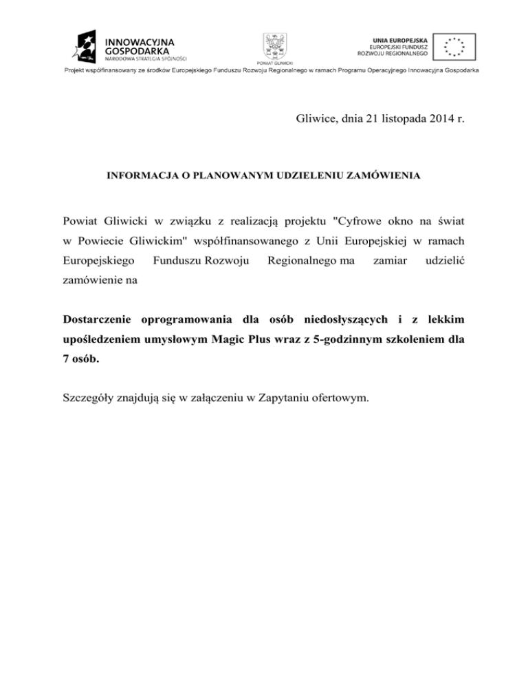Gliwice, dnia 21 listopada 2014 r. INFORMACJA O PLANOWANYM UDZIELENIU ZAMÓWIENIA Powiat Gliwicki w związku z realizacją projektu "Cyfrowe okno na świat w Powiecie Gliwickim" współfinansowanego z Unii Europejskiej w ramach Europejskiego Funduszu Rozwoju Regionalnego ma zamiar udzielić zamówienie na Dostarczenie oprogramowania dla osób niedosłyszących i z lekkim upośledzeniem umysłowym Magic Plus wraz z 5-godzinnym szkoleniem dla 7 osób. Szczegóły znajdują się w załączeniu w Zapytaniu ofertowym. ZAPYTANIE OFERTOWE Opis przedmiotu zamówienia Przedmiotem zamówienia jest dostarczenie oprogramowania dla osób niedosłyszących i z lekkim upośledzeniem umysłowym Magic Plus wraz z 5-godzinnym szkoleniem dla 7 osób. 2. Zamówienie jest realizowane w ramach projektu "Cyfrowe okno na świat w Powiecie Gliwickim" współfinansowanego z Unii Europejskiej w ramach Europejskiego Funduszu Rozwoju Regionalnego. 3. Zamawiający wymaga dostarczenia 27 licencji oprogramowania Magic Plus. Oprogramowanie zostanie zainstalowane w 3 lokalizacjach: Zespół Szkół Specjalnych w Knurowie – 8 licencji, Zespół Szkół Specjalnych w Pyskowicach - 15 licencji, Dom Pomocy Społecznej Ostoja w Sośnicowicach – 4 licencje. I. 1. II. Termin wykonania zamówienia Zamówienie musi być zrealizowane do dnia 16 grudnia br. III. 1. 2. 3. 4. 5. IV. 1. 2. 3. 4. 5. Warunki udziału Oprogramowanie musi zostać dostarczone do Zamawiającego do dnia 16 grudnia br. Szkolenie z obsługi oprogramowania musi zostać przeprowadzone w Starostwie Powiatowym w Gliwicach w terminie ustalonym przez przedstawiciela Zamawiającego w godzinach urzędowania Starostwa. Szkolenie będzie przeprowadzone dla 7 osób i będzie trwało 5 godzin. Szkolenie musi zostać przeprowadzone do dnia 16 grudnia br. Odbiór przedmiotu zamówienia nastąpi na podstawie protokołu zdawczo-odbiorczego podpisanego przez przedstawicieli obu stron. Sposób przygotowania ofert: Oferta musi być sporządzona z zachowaniem formy pisemnej pod rygorem nieważności. Oferta musi być czytelna i musi być podpisana przez osobę upoważnioną do reprezentowania Wykonawcy. Upoważnienie do podpisania oferty musi być dołączone do oferty, jeżeli nie wynika ono z innych dokumentów załączonych przez Wykonawcę. Jeżeli osoba /osoby podpisująca ofertę działa na podstawie pełnomocnictwa, wówczas pełnomocnictwo to musi w swej treści jednoznacznie wskazywać uprawnienie do podpisania oferty. Pełnomocnictwo to musi zostać dołączone do oferty i musi być złożone w oryginale lub kopii poświadczonej za zgodność z oryginałem przez notariusza. Oferta musi być sporządzona w języku polskim. Zaleca się przy sporządzaniu oferty skorzystanie z wzoru (formularza oferty) przygotowanego przez zamawiającego. Wykonawca może przedstawić ofertę na swoich formularzach z zastrzeżeniem, że muszą one zawierać wszystkie informacje określone przez zamawiającego w przygotowanym wzorze. 6. 7. 8. Wykonawca ponosi wszelkie koszty związane z przygotowaniem i złożeniem oferty. Złożenie więcej niż jednej oferty lub złożenie oferty zawierającej propozycje alternatywne spowoduje odrzucenie wszystkich ofert złożonych przez Wykonawcę. Na ofertę składają się: a) formularz oferty (wzór załączeniu), b) pełnomocnictwo – w przypadku gdy za Wykonawcę działa pełnomocnik. V. Sposób składania ofert: Oferty należy złożyć w zamkniętych kopertach opatrzonych informacją: „Dostawa oprogramowania dla osób niedosłyszących i z lekkim upośledzeniem umysłowym Magic Plus wraz z 5-godzinnym szkoleniem dla 7 osób” „Nie otwierać przed dniem 28.11.2014 r., godz. 13:15” VI. Termin składania ofert: Oferty prosimy składać do: 28 listopada 2014 r. do godz. 13:00 w Biurze Obsługi Klienta Starostwa Powiatowego, ul. Zygmunta Starego 17, 44-100 Gliwice. Decyduje data wpływu dokumentu. VII. Kryterium wyboru ofert: 1. Przy wyborze najkorzystniejszej oferty Zamawiający będzie się kierował kryterium ceny brutto za realizację przedmiotu zamówienia obliczonej przez Wykonawcę zgodnie zobowiązującymi przepisami prawa. 2. Zamawiający za najkorzystniejszą uzna ofertę, która nie podlega odrzuceniu oraz uzyska największą liczbę punktów przyznanych w ramach ustalonego kryterium. 3. Maksymalna liczba punktów w kryterium równa jest określonej wadze kryterium w %. 4. Uzyskana liczba punktów w ramach kryterium zaokrąglana będzie do drugiego miejsca po przecinku. 5. Przyznawanie ilości punktów poszczególnym ofertom odbywać się będzie według następującej zasady: Cena brutto najniższej zaproponowanej oferty Liczba punktów = ---------------------------------------------------------- x 100 Cena brutto oferty badanej VIII. Udzielenie zamówienia Zamawiający udzieli zamówienia Wykonawcy, którego oferta odpowiada wszystkim wymaganiom określonym w niniejszym zapytaniu ofertowym i została oceniona jako najkorzystniejsza w oparciu o podane kryterium wyboru. Zamawiający niezwłocznie zawrze umowę w sprawie zamówienia publicznego. Warunki płatność: Przelew 14 dni od dnia dostarczenia faktury. IX. FORMULARZ OFERTY Nazwa Wykonawcy / wykonawców w przypadku oferty wspólnej: ........................................................................................................................................ Adres*: ………………………………………………………………………………………………… Regon*: ……………………………………… NIP*: ……………………………………… Numer KRS*: ………………………………… (jeżeli dotyczy) FAX*, na który Zamawiający ma przesyłać korespondencję: …………………………………………….. Telefon*: ………………………………… e-mail*: ………………………………… * w przypadku oferty wspólnej należy podać dane dotyczące pełnomocnika wykonawcy Powiat Gliwicki ul. Zy