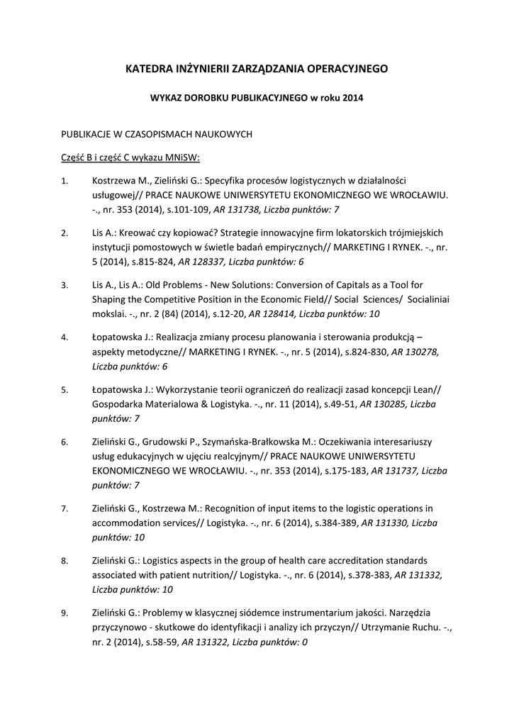 KATEDRA INŻYNIERII ZARZĄDZANIA OPERACYJNEGO WYKAZ DOROBKU PUBLIKACYJNEGO w roku 2014 PUBLIKACJE W CZASOPISMACH NAUKOWYCH Część B i część C wykazu MNiSW: 1. Kostrzewa M., Zieliński G.: Specyfika procesów logistycznych w działalności usługowej// PRACE NAUKOWE UNIWERSYTETU EKONOMICZNEGO WE WROCŁAWIU. -., nr. 353 (2014), s.101-109, AR 131738, Liczba punktów: 7 2. Lis A.: Kreować czy kopiować? Strategie innowacyjne firm lokatorskich trójmiejskich instytucji pomostowych w świetle badań empirycznych// MARKETING I RYNEK. -., nr. 5 (2014), s.815-824, AR 128337, Liczba punktów: 6 3. Lis A., Lis A.: Old Problems - New Solutions: Conversion of Capitals as a Tool for Shaping the Competitive Position in the Economic Field// Social Sciences/ Socialiniai mokslai. -., nr. 2 (84) (2014), s.12-20, AR 128414, Liczba punktów: 10 4. Łopatowska J.: Realizacja zmiany procesu planowania i sterowania produkcją – aspekty metodyczne// MARKETING I RYNEK. -., nr. 5 (2014), s.824-830, AR 130278, Liczba punktów: 6 5. Łopatowska J.: Wykorzystanie teorii ograniczeń do realizacji zasad koncepcji Lean// Gospodarka Materialowa & Logistyka. -., nr. 11 (2014), s.49-51, AR 130285, Liczba punktów: 7 6. Zieliński G., Grudowski P., Szymańska-Brałkowska M.: Oczekiwania interesariuszy usług edukacyjnych w ujęciu realcyjnym// PRACE NAUKOWE UNIWERSYTETU EKONOMICZNEGO WE WROCŁAWIU. -., nr. 353 (2014), s.175-183, AR 131737, Liczba punktów: 7 7. Zieliński G., Kostrzewa M.: Recognition of input items to the logistic operations in accommodation services// Logistyka. -., nr. 6 (2014), s.384-389, AR 131330, Liczba punktów: 10 8. Zieliński G.: Logistics aspects in the group of health care accreditation standards associated with patient nutrition// Logistyka. -., nr. 6 (2014), s.378-383, AR 131332, Liczba punktów: 10 9. Zieliński G.: Problemy w klasycznej siódemce instrumentarium jakości. Narzędzia przyczynowo - skutkowe do identyfikacji i analizy ich przyczyn// Utrzymanie Ruchu. -., nr. 2 (2014), s.58-59, AR 131322, Liczba punktów: 0 10. Zieliński G., Studzińska M.: Key logistics processes in project management based on organisation of an international training session-case study// Logistyka. -., nr. 6 (2014), s.390-395, AR 131325, Liczba punktów: 10 11. Zieliński G., Studzińska M.: Projektowanie usług z wykorzystaniem koncepcji design thinking// MARKETING I RYNEK. -., nr. 5 (2014), s.206-212, AR 129250, Liczba punktów: 6 MONOGRAFIE NAUKOWE W JĘZYKU POLSKIM 1. Lis A., Lis A.: Zarządzanie kapitałami w klastrach: kapitał społeczny, kulturowy, ekonomiczny i symboliczny w strukturach klastrowych. Warszawa: Difin SA, 2014.288 s. ISBN 978-83-7930-520-9, MK 129650, Liczba punktów: 20 ROZDZIAŁY W MONOGRAFIACH NAUKOWYCH W JĘZYKU POLSKIM 1. Drozd R., Kufel K.: Techniki proekologiczne stosowane w procesie farb proszkowych przedsiębiorstwa X funkcjonujące w ramach systemu zarządzania środowiskiem// Globalizacja i regionalizacja w ochronie środowiska/ ed. Noch Tadeusz, Sauczuk Jan, Wesołowska Alicja Gdańsk: Wydawnictwo Gdańskiej Szkoły Wyższej, 2014, s.198-206, MCK 131581, Liczba punktów: 4 2. Kostrzewa M., Łopatowska J.: Generatory zmian służące doskonaleniu usług medycznych// W : Wielowymiarowe aspekty doskonalenia podmiotów leczniczych/ ed. Małgorzata Wisniewska Grzegorz Zieliński Gdańsk: Wydawnictwo Politechniki Gdańskiej, 2014, s.97-110, MCK 129196, Liczba punktów: 4 3. Kostrzewa M., Łopatowska J.: Metody Ilościowe w zarządzaniu operacyjnym// W : Systemy techniczne i społeczne/ ed. Jolanta Łopatowska Grzegorz Zieliński Gdańsk: Wydawnictwo Politechniki Gdańskiej, 2014, s.87-98, MCK 130263, Liczba punktów: 4 4. Kukułka A., Barylski A.: Metodyka badawcza z wykorzystaniem wskaźnika całkowitej efektywności wyposażenia// W : Systemy techniczne i społeczne/ ed. Jolanta Łopatowska, Grzegorz Zieliński Gdańsk: Wydawnictwo Politechniki Gdańskiej, 2014, s.137-148, MCK 131627, Liczba punktów: 4 5. Lis A., Lis A.: Kulturowe determinanty zarządzania przedsiębiorstwami klastrowymi// Kultura organizacyjna we współczesnych organizacjach/ ed. Katarzyna Szymańska Łódź: Wydawnictwo Politechniki Łódzkiej, 2014, s.187-200, MCK 128346, Liczba punktów: 4 6. Lis A.: Podaż technologii vs potrzeby w zakresie technologii: rola instytucji pośredniczących w transferze technologii na Pomorzu// W : Innowacyjne i jakościowe aspekty w zarządzaniu operacyjnym/ ed. Anna Maria Lis, Grzegorz Zieliński Gdańsk: Wydawnictwo Politechniki Gdańskiej, 2014, s.25-41, MCK 129651, Liczba punktów: 4 7. Łopatowska J.: Wykorzystanie teorii ograniczeń w zarządzaniu operacyjnym// W : Systemy techniczne i społeczne/ ed. Jolanta Łopatowska, Grzegorz Zieliński Gdańsk: Wydawnictwo Politechniki Gdańskiej, 2014, s.127-136, MCK 130262, Liczba punktów: 4 8. Ogrodowczyk B.: Efektywność i skuteczność w koncepcji doboru mierników procesów w startupie biotechnologicznym// W : Wielowymiarowe aspekty doskonalenia podmiotów leczniczych/ ed. Małgorzata Wiśniewska Grzegorz Zieliński Gdańsk: Wydawnictwo Politechniki Gdańskiej, 2014, s.157-168, MCK 129488, Liczba punktów: 4 9. Wirkus M., Kowalczyk R.: ASPEKTY SPOŁECZNE W REALIZACJI PROJEKTÓW BUDOWLANYCH// Innowacje w zarządzaniu i inżynierii produkcji/ ed. Ryszard Knosala Opole: Oficyna Wydawnicza Polskiego Towarzystwa Zarządznia Podukcją, 2014, s.926-933, MCK 128213, Liczba punktów: 4 10. Wirkus M., Kufel K.: Problem analizy obniżenia wartości OEE zautomatyzowanego parku maszynowego spowodowanego spadkiem prędkości pracy oraz mikroprzestojami technicznymi// Zarządzanie przedsiębiorstwem : Teoria i praktyka 2014./ ed. Piotr Łebkowski Kraków: Wydawnictwa AGH, 2014, s.106-125, MCK 131584, Liczba punktów: 4 11. Zieliński G., Dąbek M.: Detrminanty jakości promocji usług turystycznych na przykładzie ofert wystawienniczych// W : Innowacyjne i jakościowe aspekty w zarządzaniu operacyjnym/ ed. Lis A., Zieliński G