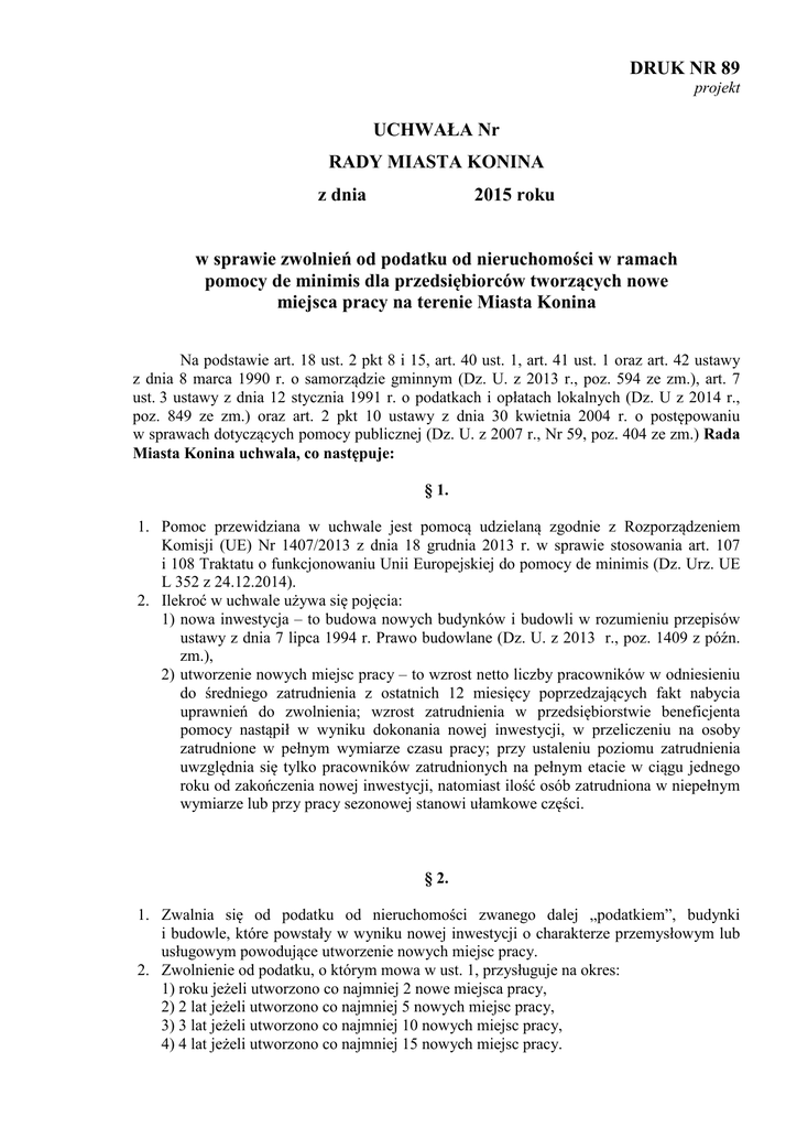 DRUK NR 89 projekt UCHWAŁA Nr RADY MIASTA KONINA z dnia 2015 roku w sprawie zwolnień od podatku od nieruchomości w ramach pomocy de minimis dla przedsiębiorców tworzących nowe miejsca pracy na terenie Miasta Konina Na podstawie art. 18 ust. 2 pkt 8 i 15, art. 40 ust. 1, art. 41 ust. 1 oraz art. 42 ustawy z dnia 8 marca 1990 r. o samorządzie gminnym (Dz. U. z 2013 r., poz. 594 ze zm.), art. 7 ust. 3 ustawy z dnia 12 stycznia 1991 r. o podatkach i opłatach lokalnych (Dz. U z 2014 r., poz. 849 ze zm.) oraz art. 2 pkt 10 ustawy z dnia 30 kwietnia 2004 r. o postępowaniu w sprawach dotyczących pomocy publicznej (Dz. U. z 2007 r., Nr 59, poz. 404 ze zm.) Rada Miasta Konina uchwala, co następuje: § 1. 1. Pomoc przewidziana w uchwale jest pomocą udzielaną zgodnie z Rozporządzeniem Komisji (UE) Nr 1407/2013 z dnia 18 grudnia 2013 r. w sprawie stosowania art. 107 i 108 Traktatu o funkcjonowaniu Unii Europejskiej do pomocy de minimis (Dz. Urz. UE L 352 z 24.12.2014). 2. Ilekroć w uchwale używa się pojęcia: 1) nowa inwestycja – to budowa nowych budynków i budowli w rozumieniu przepisów ustawy z dnia 7 lipca 1994 r. Prawo budowlane (Dz. U. z 2013 r., poz. 1409 z późn. zm.), 2) utworzenie nowych miejsc pracy – to wzrost netto liczby pracowników w odniesieniu do średniego zatrudnienia z ostatnich 12 miesięcy poprzedzających fakt nabycia uprawnień do zwolnienia; wzrost zatrudnienia w przedsiębiorstwie beneficjenta pomocy nastąpił w wyniku dokonania nowej inwestycji, w przeliczeniu na osoby zatrudnione w pełnym wymiarze czasu pracy; przy ustaleniu poziomu zatrudnienia uwzględnia się tylko pracowników zatrudnionych na pełnym etacie w ciągu jednego roku od zakończenia nowej inwestycji, natomiast ilość osób zatrudniona w niepełnym wymiarze lub przy pracy sezonowej stanowi ułamkowe części. § 2. 1. Zwalnia się od podatku od nieruchomości zwanego dalej „podatkiem”, budynki i budowle, które powstały w wyniku nowej inwestycji o charakterze przemysłowym lub usługowym powodujące utworzenie nowych miejsc pracy. 2. Zwolnienie od podatku, o którym mowa w ust. 1, przysługuje na okres: 1) roku jeżeli utworzono co najmniej 2 nowe miejsca pracy, 2) 2 lat jeżeli utworzono co najmniej 5 nowych miejsc pracy, 3) 3 lat jeżeli utworzono co najmniej 10 nowych miejsc pracy, 4) 4 lat jeżeli utworzono co najmniej 15 nowych miejsc pracy. Każdą zmianę stanu zatrudnienia powodującą utratę prawa do zwolnienia lub jego części, przedsiębiorca zobowiązany jest zgłosić organowi podatkowemu w terminie 14 dni od jej zaistnienia. 3. Zwolnienie, o którym mowa w ust. 1 nie dotyczy nieruchomości, które stanowiły podstawę opodatkowania podatkiem od nieruchomości przed wejściem w życie niniejszej uchwały za wyjątkiem nieruchomości, które: 1) zostały nabyte w ramach przekształcenia majątku skarbu państwa lub gminy, lub 2) zostały nabyte w ramach procesu upadłościowego. 4. Zwolnień, o których mowa w ust. 2, nie stosuje się do przedsiębiorców posiadających zaległości z tytułu podatków od nieruchomości, rolnego, leśnego i od środków transportowych wobec budżetu Miasta Konina. § 3. Przedsiębiorca, który zamierza skorzystać z pomocy de minimis zobowiązany jest do zgłoszenia organowi podatkowemu zamiaru korzystania z pomocy, na druku stanowiącym załącznik nr 1 do uchwały, dołączając wymienione w nim dokumenty. § 4. Za dzień udzielenia pomocy w ramach zasady de minimis należy rozumieć dzień, w którym beneficjent nabył prawo do otrzymania tej pomocy. § 5. 1. W okresie do sześciu miesięcy od zakończenia inwestycji, jednakże nie później niż w terminie określonym w § 6 ust. 1, przedsiębiorca zobowiązany jest do przedłożenia organowi podatkowemu: 1) oświadczenia o zakończeniu inwestycji, na druku stanowiącym załącznik nr 2 do uchwały, 2) oświadczenia o utworzeniu nowych miejsc pracy związanych z nową inwestycją, na druku stanowiącym załącznik nr 3 do uchwały, 3) oświadczenia o niezaleganiu w stosunku do Miasta Konina z zapłatą podatków od nieruchomości, rolnego, leśnego i od środków transportowych, na druku stanowiącym załącznik nr 4 do uchwały, 4) kopii decyzji pozwolenia na realizację inwestycji oraz kopii decyzji o pozwoleniu na użytkowanie budynków lub budowli stanowiących nową inwestycję (jeżeli jest wymagana), 5) wszystkich zaświadczeń o pomocy de minimis, otrzymanych w roku, w którym podatnik ubiega się o pomoc oraz w ciągu 2 poprzedzających go lat, albo oświadczenia o wielkości pomocy otrzymanej w tym okresie, albo oświadczenia o nieotrzymaniu takiej pomocy w tym okresie, 6) informacji niezbędnych do udzielenia pomocy de minimis, zgodnie z rozporządzeniem Rady Ministrów z dnia 29 marca 2010 r. w sprawie zakresu informacji przedstawianych przez podmiot ubiegający się o pomoc de minimis (Dz. U. Nr 53, poz. 311 z późn. zm.). 2. Na żądanie organu podatkowego przedsiębiorca zobowiązany jest do przedłożenia, dodatkowych informacji niezbędnych do oceny udzielenia pomocy oraz prawidłowego jej monitorowania. § 6. Przedsiębiorca w okresie korzystania ze zwolnienia od podatku od nieruchomości na podstawie niniejszej uchwały, jest zobowiązany do dnia 15 stycznia (ze stanem na dzień 31 grudnia) każdego roku podatkowego, przedstawić bez wezwania, organowi podatkowemu: 1) informacji, o których mowa w rozporządzeniu Rady Ministrów z dnia 29 marca 2010 r. w sprawie zakresu informacji przedstawianych przez podmiot ubiegający się o pomoc de minimis (Dz. U. Nr 53, poz. 311 z późn. zm.), 2) wszystkie zaświadczenia o pomocy de minimis, otrzymane w roku, w którym podatnik ubiega się o pomoc oraz w ciągu 2 poprzedzających go lat kalendarzowych, albo oświadczenie o wielkości pomocy otrzymanej w tym okresie, albo oświadczenia o nieotrzymaniu takiej pomocy w tym okresie, 3) informację o stanie zatrudnienia na koniec poprzedniego roku kalendarzowego, potwi