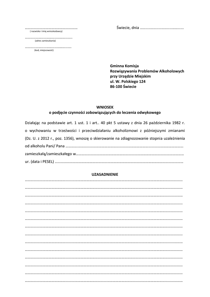 ……………………………………………… Świecie, dnia …………………………………………. ( nazwisko i imię wnioskodawcy) …………………………………………….. (adres zamieszkania) ……………………………………………. (kod, miejscowość) Gminna Komisja Rozwiązywania Problemów Alkoholowych przy Urzędzie Miejskim ul. W. Polskiego 124 86-100 Świecie WNIOSEK o podjęcie czynności zobowiązujących do leczenia odwykowego Działając na podstawie art. 1 ust. 1 i art.. 40 pkt 5 ustawy z dnia 26 października 1982 r. o wychowaniu w trzeźwości i przeciwdziałaniu alkoholizmowi z późniejszymi zmianami (Dz. U. z 2012 r., poz. 1356), wnoszę o skierowanie na zdiagnozowanie stopnia uzależnienia od alkoholu Pani/ Pana ………….……………………………………………………………………………………………… zamieszkałą/zamieszkałego w………………………………………………………………………………………………… ur. (data i PESEL) …………………………………………………………………………………………………………………… UZASADNIENIE ……………………………………………………………………………………………………………………………………………… ……………………………………………………………………………………………………………………………………………… ……………………………………………………………………………………………………………………………………………… ……………………………………………………………………………………………………………………………………………… ……………………………………………………………………………………………………………………………………………… ……………………………………………………………………………………………………………………………………………… ……………………………………………………………………………………………………………………………………………… ……………………………………………………………………………………………………………………………………………… ……………………………………………………………………………………………………………………………………………… ……………………………………………………………………………………………………………………………………………… ……………………………………………………………………………………………………………………………………………… ……………………………………………………………………………………………………………………………………………… ……………………………………………………………………………………………………………………………………………… ……………………………………………………………………………………………………………………………………………… ……………………………………………………………………………………………………………………………………………… ……………………………………………………………………………………………………………………………………………… ……………………………………………………………………………………………………………………………………………… ……………………………………………………………………………………………………………………………………………… ……………………………………………………………………………………………………………………………………………… ……………………………………………………………………………………………………………………………………………… ……………………………………………………………………………………………………………………………………………… ……………………………………………………………………………………………………………………………………………… ……………………………………………………………………………………………………………………………………………… ……………………………………………………………………………………………………………………………………………… ……………………………………………………………………………………………………………………………………………… ……………………………………………………………………………………………………………………………………………… ……………………………………………………………………………………………………………………………………………… ……………………………………………………………………………………………………………………………………………… ……………………………………………………………………………………………………………………………………………… ………………………………………………