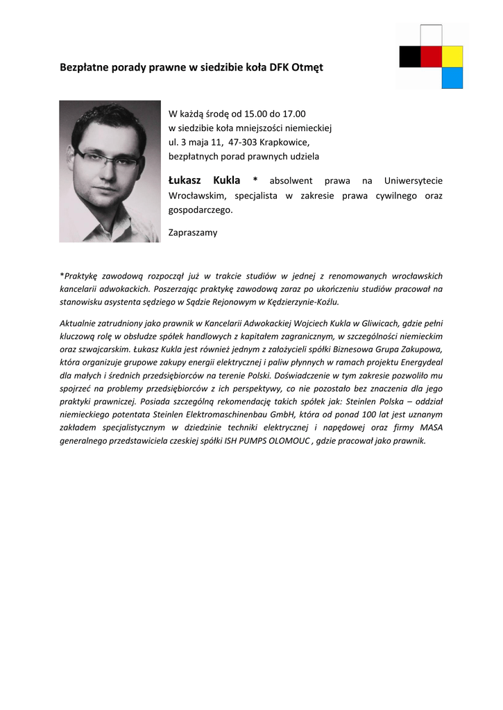 Bezpłatne porady prawne w siedzibie koła DFK Otmęt W każdą środę od 15.00 do 17.00 w siedzibie koła mniejszości niemieckiej ul. 3 maja 11, 47-303 Krapkowice, bezpłatnych porad prawnych udziela Łukasz Kukla * absolwent prawa na Uniwersytecie Wrocławskim, specjalista w zakresie prawa cywilnego oraz gospodarczego. Zapraszamy *Praktykę zawodową rozpoczął już w trakcie studiów w jednej z renomowanych wrocławskich kancelarii adwokackich. Poszerzając praktykę zawodową zaraz po ukończeniu studiów pracował na stanowisku asystenta sędziego w Sądzie Rejonowym w Kędzierzynie-Koźlu. Aktualnie zatrudniony jako prawnik w Kancelarii Adwokackiej Wojciech Kukla w Gliwicach, gdzie pełni kluczową rolę w obsłudze spółek handlowych z kapitałem zagranicznym, w szczególności niemieckim oraz szwajcarskim. Łukasz Kukla jest również jednym z założycieli spółki Biznesowa Grupa Zakupowa, która organizuje grupowe zakupy energii elektrycznej i paliw płynnych w ramach projektu Energydeal dla małych i średnich przedsiębiorców na terenie Polski. Doświadczenie w tym zakresie pozwoliło mu spojrzeć na problemy przedsiębiorców z ich perspektywy, co nie pozostało bez znaczenia dla jego praktyki prawniczej. Posiada szczególną rekomendację takich spółek jak: Steinlen Polska – oddział niemieckiego potentata Steinlen Elektromaschinenbau GmbH, która od ponad 100 lat jest uznanym zakładem specjalistycznym w dziedzinie techniki elektrycznej i napędowej oraz firmy MASA generalnego przedstawiciela czeskiej spółki ISH PUMPS OLOMOUC , gdzie pracował jako prawnik.