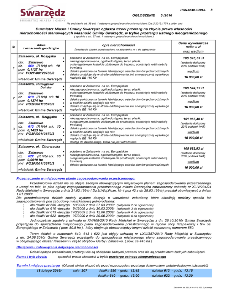 RGN.6840.3.2015- OGŁOSZENIE 8 5 /2016 Na podstawie art. 38 ust. 1 ustawy o gospodarce nieruchomościami (Dz.U.2015.1774 z późn. zm) Burmistrz Miasta i Gminy Swarzędz ogłasza trzeci przetarg na zbycie prawa własności nieruchomości stanowiących własność Gminy Swarzędz, w trybie przetargu ustnego nieograniczonego ( zgodnie z art. 37 ust. 1 ustawy o gospodarce nieruchomościami ) lp Zalasewo, ul. Rosyjska 1 opis nieruchomości Adres i oznaczenia geodezyjne (lokalizację działek przedstawiono na załączniku nr 1 do ogłoszenia) obr. Zalasewo dz. 550 (R IVb) ark. 10 pow. 0,1127 ha KW PO2P/00129788/8 właściciel: Gmina Swarzędz Zalasewo, ul.Belgijska/ Duńska 2 obr. Zalasewo dz. 610 (R IVb) ark. 10 pow. 0,1274 ha KW PO2P/00113670/3 właściciel: Gmina Swarzędz położona w Zalasewie na os. Europejskim niezagospodarowana, ogólnodostępna, teren płaski, o nieregularnym kształcie zbliżonym do trapezu; porośnięta roślinnością trawiastą działka położona na terenie istniejącego osiedla domów jednorodzinnych w pobliżu działki znajduje się rów działka znajduje się w strefie oddziaływania linii energetycznej wysokiego napięcia EE 110 KV położona w Zalasewie na os. Europejskim niezagospodarowana, ogólnodostępna, teren płaski, o regularnym kształcie zbliżonym do prostokąta; porośnięta roślinnością trawiastą działka położona na terenie istniejącego osiedla domów jednorodzinnych w pobliżu działki znajduje się rów działka znajduje się w strefie oddziaływania linii energetycznej wysokiego napięcia EE 110 KV dostęp do działki drogą, która nie jest udrożniona obr. Zalasewo dz. 622 (R IVb) ark. 10 pow. 0,0619 ha KW PO2P/00113670/3 położona w Zalasewie na os. Europejskim niezagospodarowana, ogólnodostępna, teren płaski, o regularnym kształcie zbliżonym do prostokąta; porośnięta roślinnością trawiastą działka położona na terenie istniejącego osiedla domów jednorodzinnych Zalasewo, ul. Belgijska 3 położona w Zalasewie na os. Europejskim niezagospodarowana, ogólnodostępna, teren płaski, o nieregularnym kształcie zbliżonym do trapezu; porośnięta roślinnością trawiastą działka położona na terenie istniejącego osiedla domów jednorodzinnych działka znajduje się w strefie oddziaływania linii energetycznej wysokiego napięcia EE 110 KV obr. Zalasewo dz. 613 (R IVb) ark. 10 pow. 0,1423 ha KW PO2P/00113670/3 właściciel: Gmina Swarzędz Zalasewo, ul. Chorwacka właściciel: Gmina Swarzędz Cena wywoławcza netto w zł oraz wadium 160 345,53 zł (zostanie doliczony 23% podatek VAT) wadium 16 000,00 zł 160 544,72 zł (zostanie doliczony 23% podatek VAT) wadium 16 000,00 zł 161 967,48 zł (zostanie doliczony 23% podatek VAT) wadium 15 000,00 zł 105 682,93 zł (zostanie doliczony 23% podatek VAT) wadium 10 000,00 zł Przeznaczenie w miejscowym planie zagospodarowania przestrzennego: Przedmiotowe działki nie są objęte żadnym obowiązującym miejscowym planem zagospodarowania przestrzennego, z uwagi na fakt, że plan ogólny zagospodarowania przestrzennego miasta Swarzędza zatwierdzony uchwałą nr XLIV/234/94 Rady Miejskiej w Swarzędzu z dnia 21.02.1994r ( Dz.U.Woj.Pozn. Nr 4 poz 42 z dn 28.03.1994r) przestał obowiązywać z dniem 1.01.2003r. Dla przedmiotowych działek zostały wydane decyzje o warunkach zabudowy, które określają możliwy sposób ich zagospodarowania pod zabudowę mieszkaniową jednorodzinną: dla działki nr 550 -decyzja 60/2009 z dnia 27.03.2009r (załącznik 2 do ogłoszenia) dla działki nr 610 -decyzja 54/2009 z dnia 20.03.2009r (załącznik 3 do ogłoszenia) dla działki nr 613 -decyzja 140/2009 z dnia 12.06.2009r (załącznik 4 do ogłoszenia) dla działki nr 622 -decyzja 97/2009 z dnia 20.05.2009r (załącznik 5 do ogłoszenia) Jednocześnie zgodnie z uchwałą nr XV/408/2010 Rady Miejskiej w Swarzędzu z dn. 26.10.2010r Gmina Swarzędz przystąpiła do sporządzenia miejscowego planu zagospodarowania przestrzennego w rejonie ulicy Rzepakowej i tzw os. Europejskiego w Zalasewie ( pow. 80,8 ha ), który obejmuje obszar między innymi działki oznaczonej numerem 550. Teren działek o numerach 610, 613 i 622 jest objęty uchwałą nr LXIII/387/2010 Rady Miejskiej w Swarzędzu z dn. 24.08.2010r Gmina Swarzędz przystąpiła do sporządzenia miejscowego planu zagospodarowania przestrzennego w obejmującego obszar Kruszewni i część obrębów Garby i Zalasewo. ( pow. ca 445 ha ) Obciążenia i zobowiązania dotyczące nieruchomości Działki będące przedmiotem przetargu nie są obciążone żadnymi prawami oraz nie są przedmiotem żadnych zobowiązań. Forma i tryb zbycia: sprzedaż prawa własności w trybie przetargu ustnego nieograniczonego Termin i miejsce przetargu (Oferent winien okazać się przed rozpoczęciem przetargu dokumentem potwierdzającym tożsamość) 18 lutego 2016r sala 207 działka 550 - godz. 12.45 działka 613 - godz. 13.15 działka 610 - godz. 13.00 działka 622 - godz. 13.30 Zalasewo, dz. 550, 610 ,613, 622, 3 przetarg Terminy przeprowadzonych przetargów: 21.05.2015r, 15.09.2015r Cena prawa własności : do ceny ustalonej w drodze przetargu zostanie doliczony podatek VAT w stawce 23%. W przypadku zmiany stawki podatku VAT do ceny prawa własności zostanie doliczony podatek VAT w stawce obowiązującej w dniu zawarcia umowy notarialnej. Warunki przetargu WADIUM Aby przystąpić do przetargu należy wnieść wadium w pieniądzu w wysokości wskazanej w ogłoszeniu w terminie najpóźniej do dnia 12 lutego 2016r. wadium należy wpłacić na konto Urzędu Miasta i Gminy w Swarzędzu, Bank BNP Paribas Bank Polska S.A. Nr 29 1600 1084 1843 0348 6000 0007 Tytuł wpłaty wadium winien wskazywać jednoznacznie uczestnika przetargu oraz działkę której wpłata dotyczy Za dzień wniesienia wadium uważa się datę wpływu środków pieniężnych na konto Gminy Swarzędz Wadium wniesione przez uczestnika, który wygrał przetarg, zalicza się na poczet ceny nabyc