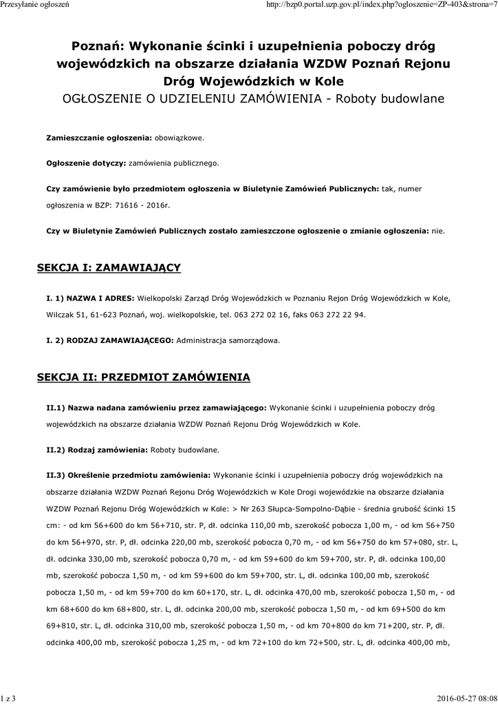 Przesyłanie ogłoszeń 1z3 http://bzp0.portal.uzp.gov.pl/index.php?ogloszenie=ZP-403&strona=7 Poznań: Wykonanie ścinki i uzupełnienia poboczy dróg wojewódzkich na obszarze działania WZDW Poznań Rejonu Dróg Wojewódzkich w Kole OGŁOSZENIE O UDZIELENIU ZAMÓWIENIA - Roboty budowlane Zamieszczanie ogłoszenia: obowiązkowe. Ogłoszenie dotyczy: zamówienia publicznego. Czy zamówienie było przedmiotem ogłoszenia w Biuletynie Zamówień Publicznych: tak, numer ogłoszenia w BZP: 71616 - 2016r. Czy w Biuletynie Zamówień Publicznych zostało zamieszczone ogłoszenie o zmianie ogłoszenia: nie. SEKCJA I: ZAMAWIAJĄCY I. 1) NAZWA I ADRES: Wielkopolski Zarząd Dróg Wojewódzkich w Poznaniu Rejon Dróg Wojewódzkich w Kole, Wilczak 51, 61-623 Poznań, woj. wielkopolskie, tel. 063 272 02 16, faks 063 272 22 94. I. 2) RODZAJ ZAMAWIAJĄCEGO: Administracja samorządowa. SEKCJA II: PRZEDMIOT ZAMÓWIENIA II.1) Nazwa nadana zamówieniu przez zamawiającego: Wykonanie ścinki i uzupełnienia poboczy dróg wojewódzkich na obszarze działania WZDW Poznań Rejonu Dróg Wojewódzkich w Kole. II.2) Rodzaj zamówienia: Roboty budowlane. II.3) Określenie przedmiotu zamówienia: Wykonanie ścinki i uzupełnienia poboczy dróg wojewódzkich na obszarze działania WZDW Poznań Rejonu Dróg Wojewódzkich w Kole Drogi wojewódzkie na obszarze działania WZDW Poznań Rejonu Dróg Wojewódzkich w Kole: > Nr 263 Słupca-Sompolno-Dąbie - średnia grubość ścinki 15 cm: - od km 56+600 do km 56+710, str. P, dł. odcinka 110,00 mb, szerokość pobocza 1,00 m, - od km 56+750 do km 56+970, str. P, dł. odcinka 220,00 mb, szerokość pobocza 0,70 m, - od km 56+750 do km 57+080, str. L, dł. odcinka 330,00 mb, szerokość pobocza 0,70 m, - od km 59+600 do km 59+700, str. P, dł. odcinka 100,00 mb, szerokość pobocza 1,50 m, - od km 59+600 do km 59+700, str. L, dł. odcinka 100,00 mb, szerokość pobocza 1,50 m, - od km 59+700 do km 60+170, str. L, dł. odcinka 470,00 mb, szerokość pobocza 1,50 m, - od km 68+600 do km 68+800, str. L, dł. odcinka 200,00 mb, szerokość pobocza 1,50 m, - od km 69+500 do km 69+810, str. L, dł. odcinka 310,00 mb, szerokość pobocza 1,50 m, - od km 70+800 do km 71+200, str. P, dł. odcinka 400,00 mb, szerokość pobocza 1,25 m, - od km 72+100 do km 72+500, str. L, dł. odcinka 400,00 mb, 2016-05-27 08:08 Przesyłanie ogłoszeń 2z3 http://bzp0.portal.uzp.gov.pl/index.php?ogloszenie=ZP-403&strona=7 szerokość pobocza 1,25 m, - od km 72+750 do km 72+800, str. P, dł. odcinka 50,00 mb, szerokość pobocza 1,25 m, > Nr 266 Ciechocinek-Konin - średnia grubość ścinki 15 cm: - od km 76+700 do km 76+820, str. L, dł. odcinka 120,00 mb, szerokość pobocza 1,50 m, > Nr 269 Szczerkowo-Kowal - średnia grubość ścinki 15 cm: - od km 31+100 do km 33+622, str. P, dł. odcinka 2 522,00 mb, szerokość pobocza 1,00 m, - od km 31+100 do km 33+622, str. L, dł. odcinka 2 522,00 mb, szerokość pobocza 1,00 m, > Nr 470 Kościelec-Turek-Kalisz - średnia grubość ścinki 15 cm: - od km 54+100 do km 54+410, str. L, dł. odcinka 310,00 mb, szerokość pobocza 2,00 m, - od km 54+200 do km 54+300, str. P, dł. odcinka 100,00 mb, szerokość pobocza 2,00 m, - od km 54+420 do km 54+569, str. P, dł. odcinka 149,00 mb, szerokość pobocza 2,00 m, - od km 54+550 do km 54+780, str. L, dł. odcinka 230,00 mb, szerokość pobocza 2,00 m, - od km 54+630 do km 54+726, str. P, dł. odcinka 96,00 mb, szerokość pobocza 2,00 m, - od km 54+800 do km 55+830, str. L, dł. odcinka 1 030,00 mb, szerokość pobocza 2,00 m, - od km 55+580 do km 55+810, str. P, dł. odcinka 230,00 mb, szerokość pobocza 2,00 m, - od km 55+900 do km 56+200, str. L, dł. odcinka 300,00 mb, szerokość pobocza 2,00 m, - od km 56+000 do km 56+080, str. P, dł. odcinka 80,00 mb, szerokość pobocza 2,00 m, > Nr 471 Opatówek-Lisków-Rzymsko - średnia grubość ścinki 15 cm: - od km 4+860 do km 4+950, str. P, dł. odcinka 90,00 mb, szerokość pobocza 1,25 m, od km 7+300 do km 7+500, str. P, dł. odcinka 200,00 mb, szerokość pobocza 1,25 m, - od km 8+270 do km 8+310, str. P, dł. odcinka 40,00 mb, szerokość pobocza 1,25 m, - od km 26+320 do km 26+515, str. P, dł. odcinka 195,00 mb, szerokość pobocza 1,25 m, - od km 29+050 do km 29+305, str. L, dł. odcinka 255,00 mb, szerokość pobocza 1,25 m, - od km 34+250 do km 34+700, str. P, dł. odcinka 450,00 mb, szerokość pobocza 1,25 m, - od km 34+250 do km 34+760, str. L, dł. odcinka 510,00 mb, szerokość pobocza 1,25 m Na wymienionych ciągach drogowych przewidziana jest ścinka pobocza celem zapewnienia prawidłowego odwodnienia korpusu drogowego. Ścinanie poboczy prowadzić od krawędzi pobocza do krawędzi nawierzchni zgodnie z założonym spadkiem poprzecznym od krawędzi jezdni. W przypadku występowania ubytków (wgłębień) i zaniżenia w poboczach należy je uzupełnić materiałem o właściwościach podobnych do materiały, z którego zostały pobocza wykonane. Dopuszcza się wykorzystanie materiału pozyskanego ze ścinki pobocza (bez darniny) po uprzedniej akceptacji Inspektora nadzoru. Spadek poprzeczny po ścince pobocza - 6 % od jezdni. Pobocze należy wyrównać na całej jego szerokości i zagęścić po ścince płytą wibracyjną lub walcem ogumionym. II.4) Wspólny Słownik Zamówień (CPV): 45.23.31.41-9. SEKCJA III: PROCEDURA III.1) TRYB UDZIELENIA ZAMÓWIENIA: Przetarg nieograniczony III.2) INFORMACJE ADMINISTRACYJNE Zamówienie dotyczy projektu/programu finansowanego ze środków Unii Europejskiej: nie SEKCJA IV: UDZIELENIE ZAMÓWIENIA 2016-05-27 08:08 Przesyłanie ogłoszeń 3z3 http://bzp0.portal.uzp.gov.pl/index.php?ogloszenie=ZP-403&strona=7 IV.1) DATA UDZIELENIA ZAMÓWIENIA: 23.05.2016. IV.2) LICZBA OTRZYMANYCH OFERT: 5. IV.3) LICZBA ODRZUCONYCH OFERT: 1. IV.4) NAZWA I ADRES WYKONAWCY, KTÓREMU UDZIELONO ZAMÓWIENIA: Zakład Usługowo-Handlowy Wojciech Wojtkowiak, Bożacin, ul. Jagły 33, 63-700 Krotoszyn, kraj/woj. wielkopolskie. IV.5) Szac