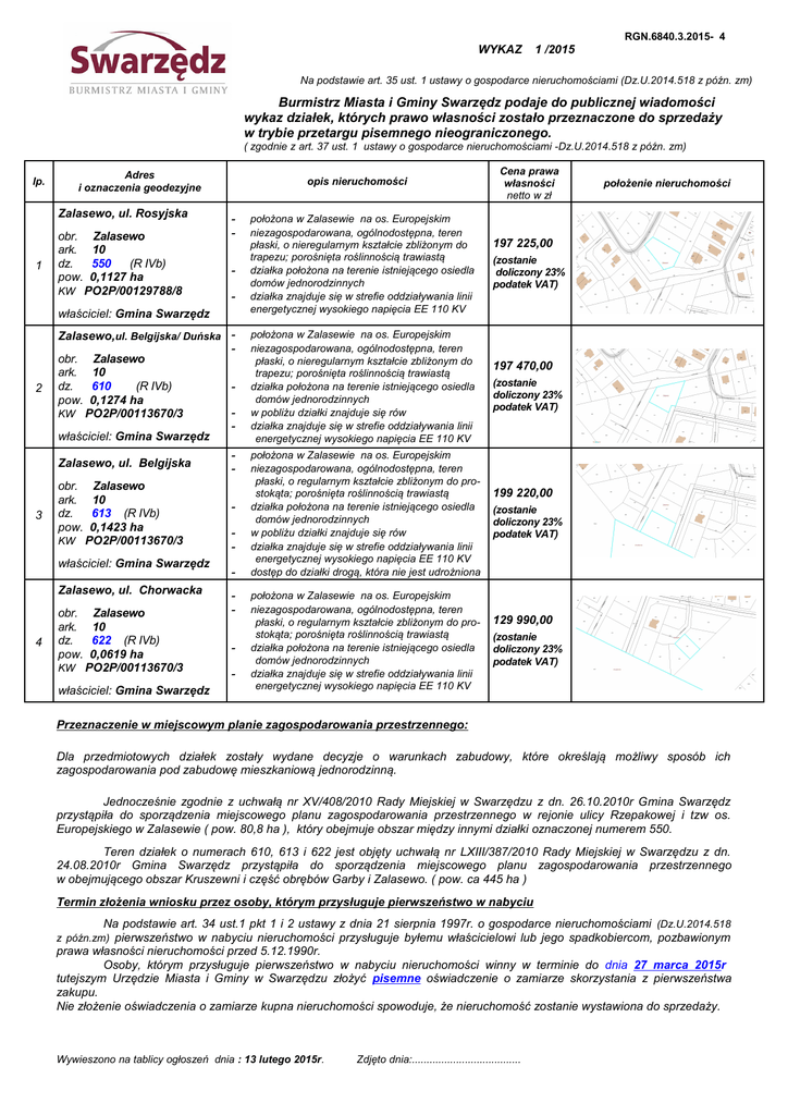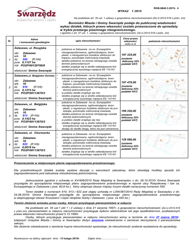RGN.6840.3.2015- 4 WYKAZ 1 /2015 Na podstawie art. 35 ust. 1 ustawy o gospodarce nieruchomościami (Dz.U.2014.518 z późn. zm) Burmistrz Miasta i Gminy Swarzędz podaje do publicznej wiadomości wykaz działek, których prawo własności zostało przeznaczone do sprzedaży w trybie przetargu pisemnego nieograniczonego. ( zgodnie z art. 37 ust. 1 ustawy o gospodarce nieruchomościami -Dz.U.2014.518 z późn. zm) lp. Adres i oznaczenia geodezyjne Zalasewo, ul. Rosyjska 1 obr. ark. dz. pow. Zalasewo 10 550 (R IVb) 0,1127 ha KW PO2P/00129788/8 opis nieruchomości - właściciel: Gmina Swarzędz 2 3 Zalasewo,ul. Belgijska/ Duńska obr. Zalasewo ark. 10 dz. 610 (R IVb) pow. 0,1274 ha KW PO2P/00113670/3 właściciel: Gmina Swarzędz Zalasewo, ul. Belgijska - obr. ark. dz. pow. - Zalasewo 10 613 (R IVb) 0,1423 ha KW PO2P/00113670/3 właściciel: Gmina Swarzędz Zalasewo, ul. Chorwacka 4 obr. ark. dz. pow. Zalasewo 10 622 (R IVb) 0,0619 ha KW PO2P/00113670/3 właściciel: Gmina Swarzędz - położona w Zalasewie na os. Europejskim niezagospodarowana, ogólnodostępna, teren płaski, o nieregularnym kształcie zbliżonym do trapezu; porośnięta roślinnością trawiastą działka położona na terenie istniejącego osiedla domów jednorodzinnych działka znajduje się w strefie oddziaływania linii energetycznej wysokiego napięcia EE 110 KV położona w Zalasewie na os. Europejskim niezagospodarowana, ogólnodostępna, teren płaski, o nieregularnym kształcie zbliżonym do trapezu; porośnięta roślinnością trawiastą działka położona na terenie istniejącego osiedla domów jednorodzinnych w pobliżu działki znajduje się rów działka znajduje się w strefie oddziaływania linii energetycznej wysokiego napięcia EE 110 KV położona w Zalasewie na os. Europejskim niezagospodarowana, ogólnodostępna, teren płaski, o regularnym kształcie zbliżonym do prostokąta; porośnięta roślinnością trawiastą działka położona na terenie istniejącego osiedla domów jednorodzinnych w pobliżu działki znajduje się rów działka znajduje się w strefie oddziaływania linii energetycznej wysokiego napięcia EE 110 KV dostęp do działki drogą, która nie jest udrożniona położona w Zalasewie na os. Europejskim niezagospodarowana, ogólnodostępna, teren płaski, o regularnym kształcie zbliżonym do prostokąta; porośnięta roślinnością trawiastą działka położona na terenie istniejącego osiedla domów jednorodzinnych działka znajduje się w strefie oddziaływania linii energetycznej wysokiego napięcia EE 110 KV Cena prawa własności netto w zł położenie nieruchomości 197 225,00 (zostanie doliczony 23% podatek VAT) 197 470,00 (zostanie doliczony 23% podatek VAT) 199 220,00 (zostanie doliczony 23% podatek VAT) 129 990,00 (zostanie doliczony 23% podatek VAT) Przeznaczenie w miejscowym planie zagospodarowania przestrzennego: Dla przedmiotowych działek zostały wydane decyzje o warunkach zabudowy, które określają możliwy sposób ich zagospodarowania pod zabudowę mieszkaniową jednorodzinną. Jednocześnie zgodnie z uchwałą nr XV/408/2010 Rady Miejskiej w Swarzędzu z dn. 26.10.2010r Gmina Swarzędz przystąpiła do sporządzenia miejscowego planu zagospodarowania przestrzennego w rejonie ulicy Rzepakowej i tzw os. Europejskiego w Zalasewie ( pow. 80,8 ha ), który obejmuje obszar między innymi działki oznaczonej numerem 550. Teren działek o numerach 610, 613 i 622 jest objęty uchwałą nr LXIII/387/2010 Rady Miejskiej w Swarzędzu z dn. 24.08.2010r Gmina Swarzędz przystąpiła do sporządzenia miejscowego planu zagospodarowania przestrzennego w obejmującego obszar Kruszewni i część obrębów Garby i Zalasewo. ( pow. ca 445 ha ) Termin złożenia wniosku przez osoby, którym przysługuje pierwszeństwo w nabyciu Na podstawie art. 34 ust.1 pkt 1 i 2 ustawy z dnia 21 sierpnia 1997r. o gospodarce nieruchomościami (Dz.U.2014.518 z późn.zm) pierwszeństwo w nabyciu nieruchomości przysługuje byłemu właścicielowi lub jego spadkobiercom, pozbawionym prawa własności nieruchomości przed 5.12.1990r. Osoby, którym przysługuje pierwszeństwo w nabyciu nieruchomości winny w terminie do dnia 27 marca 2015r tutejszym Urzędzie Miasta i Gminy w Swarzędzu złożyć pisemne oświadczenie o zamiarze skorzystania z pierwszeństwa zakupu. Nie złożenie oświadczenia o zamiarze kupna nieruchomości spowoduje, że nieruchomość zostanie wystawiona do sprzedaży. Wywieszono na tablicy ogłoszeń dnia : 13 lutego 2015r. Zdjęto dnia:.....................................
