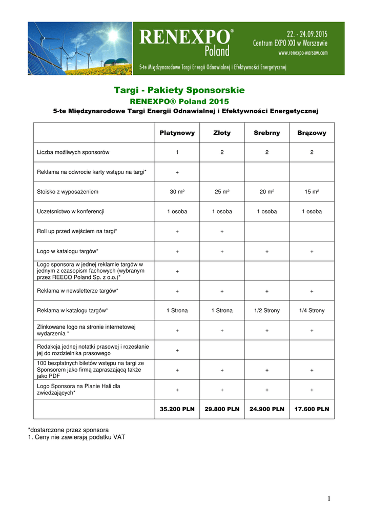 Targi - Pakiety Sponsorskie RENEXPO® Poland 2015 5-te Międzynarodowe Targi Energii Odnawialnej i Efektywności Energetycznej Platynowy Złoty Srebrny Brązowy Liczba możliwych sponsorów 1 2 2 2 Reklama na odwrocie karty wstępu na targi* + 30 m² 25 m² 20 m² 15 m² 1 osoba 1 osoba 1 osoba 1 osoba Roll up przed wejściem na targi* + + Logo w katalogu targów* + + + + Logo sponsora w jednej reklamie targów w jednym z czasopism fachowych (wybranym przez REECO Poland Sp. z o.o.)* + Reklama w newsletterze targów* + + + + 1 Strona 1 Strona 1/2 Strony 1/4 Strony Zlinkowane logo na stronie internetowej wydarzenia * + + + + Redakcja jednej notatki prasowej i rozesłanie jej do rozdzielnika prasowego + 100 bezpłatnych biletów wstępu na targi ze Sponsorem jako firmą zapraszającą także jako PDF + + + + Logo Sponsora na Planie Hali dla zwiedzających* + + + + 35.200 PLN 29.800 PLN 24.900 PLN 17.600 PLN Stoisko z wyposażeniem Uczetsnictwo w konferencji Reklama w katalogu targów* *dostarczone przez sponsora 1. Ceny nie zawierają podatku VAT 1 Dodatkowe możliwości sponsoringu Ceremonia Otwarcia RENEXPO® Poland / lub Kolacja Profesjonalistów OZE - rozpoznawalność Sponsora poprzez banner, roll up albo plakat w trakcie Wieczoru Wystawców, logo na serwetkach itp. * - logo na stronie internetowej i w programie jako Sponsora Ceremonii Otwarcia - Logo i reklama w katalogu targów 20.000 PLN *dostarczone przez sponsora 1. Ceny nie zawierają podatku VAT Targi - Pakiety Sponsorskie (proszę zakreślić) Platynowy Pakiet Sponsorski 35.200 PLN Złoty Pakiet Sponsorski 29.800 PLN Srebrny Pakiet Sponsorski 24.900 PLN Brązowy Pakiet Sponsorski 17.600 PLN Dodatkowe możliwości Sponsoringu (proszę zakreślić) Kolacja Profesjonalistów OZE 20.000 PLN Ceremonia Otwarcia RENEXPO® Poland 20.000 PLN 2 Dane kontaktowe: Nazwa Firmy: ........................................................................................................................................... Dział: ........................................................................................................................................................ Ulica/skrytka pocztowa: ......................................................................................................................... Kraj/kod pocztowy/miejscowość: ......................................................................................................... Numer telefonu: ...................................................................................................................................... Fax:........................................................................................................................................................... Email: .............................................@...................................................................................................... Strona internetowa: ................................................................................................................................ NIP: ........................................................................................................................................................... 1. Ceny nie zawierają podatku VAT Dyrektor/Prezes: ..................................................................................................................................... Tel.: .......................................................................................................................................................... Email: ......................................................@.............................................................................................. Osoba kontaktowa w kwestii sponsoringu: ......................................................................................... Tel.: .......................................................................................................................................................... Numer komórkowy: ................................................................................................................................ Email: .......................................................@............................................................................................. Proszę przygotować mi indywidualny pakiet sponsorski, w tym celu proszę o kontakt. Niniejszym zamawiam wybrany/e pakiet/y sponsorski/e. Pakiety sponsorskie nie zawierają kosztów produkcji materiałów reklamowych. Przyznanie i wyrażenie ugody na sponsoring następuje po sprawdzeniu możliwości sponsoringu. Odpowiednie warunki handlowe, które są częścią umowy są mi znane i akceptuje je. Aby umowa była ważna wymagana jest zgoda Organizatora. Miejscowość, data: ........................................................... Prawnie wiążący podpis: .......................... Pieczątka: Wypełniony formularz prosze wysłać na adres email [email protected] lub faxem na numer +48-22-379-78-60. 3