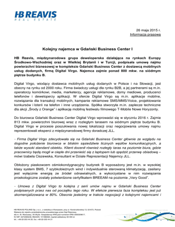 26 maja 2015 r. Informacja prasowa Kolejny najemca w Gdański Business Center I HB Reavis, międzynarodowa grupa deweloperska działająca na rynkach Europy Środkowo-Wschodniej oraz w Wielkiej Brytanii i w Turcji, podpisała umowę najmu powierzchni biznesowej w kompleksie Gdański Business Center z dostawcą mobilnych usług dodanych, firmą Digital Virgo. Najemca zajmie ponad 800 mkw. na siódmym piętrze budynku B. Digital Virgo, wiodący dostawca mobilnych usług dodanych w Polsce i na Słowacji, jest obecny na rynku od 2000 roku. Firma wiadczy usługi dla rynku B2B, a jej partnerami są m.in. operatorzy komórkowi, media, marketerzy, agencje reklamowe, domy mediowe, producenci telefonów i deweloperzy aplikacji. W ofercie Digital Virgo są m.in. aplikacje mobilne, rozwiązania dla transakcji mobilnych, kampanie reklamowe SMS/MMS/Voice, projektowanie konkursów i loterii na telefon i inne urządzenia. Spółka stworzyła m.in. zaplecze techniczne dla akcji „ rody z Orange” i aplikację mobilną festiwalu filmowego T-Mobile Nowe Horyzonty. Do biurowca Gdański Business Center Digital Virgo wprowadzi się w styczniu 2016 r. Zajmie 813 mkw. powierzchni biurowej wraz z rozległym tarasem na siódmym piętrze budynku B. Digital Virgo w procesie poszukiwania nowej lokalizacji oraz negocjowania umowy najmu reprezentowali eksperci z międzynarodowej firmy doradczej JLL. - Firma Digital Virgo zdecydowała się na Gdański Business Center głównie ze względu na dogodne położenie biurowca w bliskim sąsiedztwie licznych węzłów komunikacyjnych, a także wysoki standard obiektu. Klient docenił również rozległy taras na poziomie biura, gdzie pracownicy będą mogli w ciepłe dni przenieść się z laptopem lub spędzić przerwę obiadową – mówi Izabela Ciszewska, Konsultant w Dziale Reprezentacji Najemcy JLL. Obłożony piaskowcem o miokondygnacyjny budynek B wyposażony jest m.in. w wysokiej klasy system BMS, 7 szybkobieżnych wind i indywidualnie sterowaną klimatyzację, zasilany jest wyłącznie energią ze źródeł odnawialnych, a wykorzystane w nim rozwiązania proekologiczne zostały potwierdzone certyfikatem BREEAM na poziomie „Very Good”. - Umowa z Digital Virgo to kolejna z serii umów najmu w Gdański Business Center podpisanych przez nas od początku tego roku. W efekcie pierwsza faza kompleksu jest już skomercjalizowana w 80%. Obecnie jesteśmy w trakcie negocjacji z kolejnymi najemcami i HB REAVIS POLAND Sp. z o.o., z siedzibą w Warszawie, przy ul. Konstruktorskiej 13, 02-673, Poland Wpisana do rejestru przedsiębiorców prowadzonego przez Sąd Rejonowy dla m. St. Warszawy, XII Wydz. Gospodarczy KRS pod numerem KRS 0000309617, Nr NIPŚ 5272580238, REGONŚ 141488564, kapitał zakładowy 50 000 zł. tel.: +48-22-203 44 20, fax: +48-22-203 44 21 www.hbreavis.com jestem przekonany, że w nieodległej przyszłości oba budynki zostaną w całości wynajęte – powiedział Grzegorz Strutyński, Dyrektor Handlowy i Członek Zarządu HB Reavis Poland. Pierwsza faza kompleksu Gdański Business Center została oddana do użytku w ubiegłym roku. Planowany termin oddania dwóch kolejnych budynków to pierwszy kwartał 2016 roku. Całkowita powierzchnia najmu inwestycji (łącznie I i II faza) wyniesie ponad 98 000 mkw. O grupie HB Reavis HB Reavis to międzynarodowa grupa deweloperska założona w 1993 roku w Bratysławie, działająca na kluczowych rynkach Europy rodkowo-Wschodniej (Polska, Czechy, Słowacja, Węgry) oraz w Wielkiej Brytanii i Turcji. Dotychczas grupa zrealizowała 750 000 m kw. nowoczesnej powierzchni biurowej, handloworozrywkowej i logistycznej, a kolejny 1 milion m kw. znajduje się obecnie w realizacji lub w procesach przygotowawczych. HB Reavis wykorzystuje zintegrowany model biznesu, który obejmuje działania deweloperskie i wykonawcze oraz zarządzanie majątkiem i inwestycjami. W całej Europie Grupa zatrudnia ponad 400 osób oraz dysponuje aktywami w wysoko ci 1,8 miliarda euro, o warto ci netto na poziomie 964 milionów euro, co zapewnia jej silną pozycję rynkową. Jej potwierdzeniem są liczne wyróżnienia, m.in. tytuł „Dewelopera Roku w Europie rodkowo-Wschodniej, 2015” w konkursie CEE Quality Awards oraz „Biurowego Dewelopera Roku w Europie rodkowo-Wschodniej" w Eurobuild Awards. Więcej informacji znajduje się na stronie internetowej http://www.hbreavis.com. Informacje dla mediów: Monika Kalinowska PR Manager HB Reavis E-mail: [email protected] Kom.: +48 696 803 116 Magdalena Sobota Senior Account Manager Grayling E-mail: [email protected] Kom.: +48 609 099 041 HB REAVIS POLAND Sp. z o.o., z siedzibą w Warszawie, przy ul. Konstruktorskiej 13, 02-673, Poland Wpisana do rejestru przedsiębiorców prowadzonego przez Sąd Rejonowy dla m. St. Warszawy, XII Wydz. Gospodarczy KRS pod numerem KRS 0000309617, Nr NIPŚ 5272580238, REGONŚ 141488564, kapitał zakładowy 50 000 zł. tel.: +48-22-203 44 20, fax: +48-22-203 44 21 www.hbreavis.com