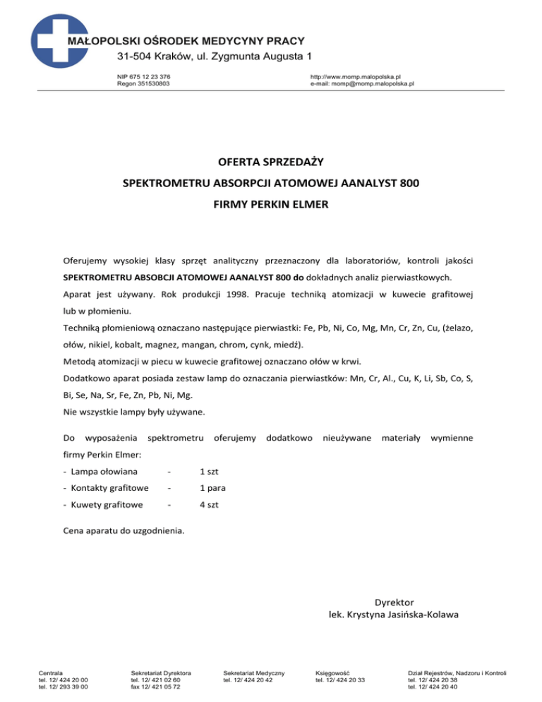 31-504 Kraków, ul. Zygmunta Augusta 1 NIP 675 12 23 376 Regon 351530803 http://www.momp.malopolska.pl e-mail: [email protected] OFERTA SPRZEDAŻY SPEKTROMETRU ABSORPCJI ATOMOWEJ AANALYST 800 FIRMY PERKIN ELMER Oferujemy wysokiej klasy sprzęt analityczny przeznaczony dla laboratoriów, kontroli jakości SPEKTROMETRU ABSOBCJI ATOMOWEJ AANALYST 800 do dokładnych analiz pierwiastkowych. Aparat jest używany. Rok produkcji 1998. Pracuje techniką atomizacji w kuwecie grafitowej lub w płomieniu. Techniką płomieniową oznaczano następujące pierwiastki: Fe, Pb, Ni, Co, Mg, Mn, Cr, Zn, Cu, (żelazo, ołów, nikiel, kobalt, magnez, mangan, chrom, cynk, miedź). Metodą atomizacji w piecu w kuwecie grafitowej oznaczano ołów w krwi. Dodatkowo aparat posiada zestaw lamp do oznaczania pierwiastków: Mn, Cr, Al., Cu, K, Li, Sb, Co, S, Bi, Se, Na, Sr, Fe, Zn, Pb, Ni, Mg. Nie wszystkie lampy były używane. Do wyposażenia spektrometru oferujemy dodatkowo nieużywane materiały wymienne firmy Perkin Elmer: - Lampa ołowiana - 1 szt - Kontakty grafitowe - 1 para - Kuwety grafitowe - 4 szt Cena aparatu do uzgodnienia. Dyrektor lek. Krystyna Jasińska-Kolawa Centrala tel. 12/ 424 20 00 tel. 12/ 293 39 00 Sekretariat Dyrektora tel. 12/ 421 02 60 fax 12/ 421 05 72 Sekretariat Medyczny tel. 12/ 424 20 42 Księgowość tel. 12/ 424 20 33 Dział Rejestrów, Nadzoru i Kontroli tel. 12/ 424 20 38 tel. 12/ 424 20 40