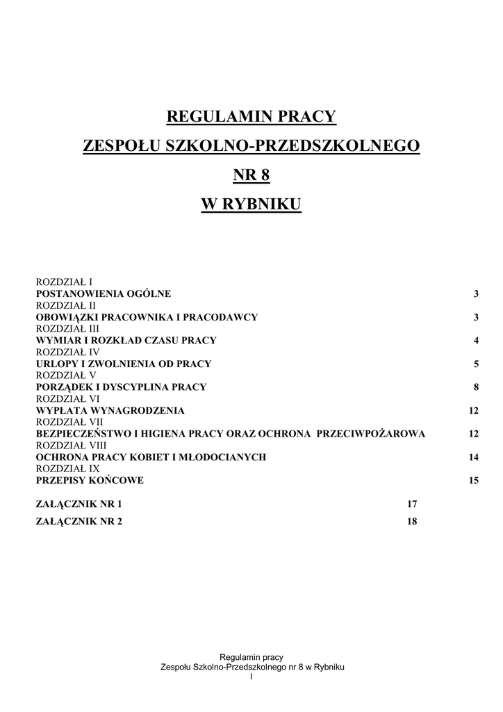 REGULAMIN PRACY ZESPOŁU SZKOLNO-PRZEDSZKOLNEGO NR 8 W RYBNIKU ROZDZIAŁ I POSTANOWIENIA OGÓLNE ROZDZIAŁ II OBOWIĄZKI PRACOWNIKA I PRACODAWCY ROZDZIAŁ III WYMIAR I ROZKŁAD CZASU PRACY ROZDZIAŁ IV URLOPY I ZWOLNIENIA OD PRACY ROZDZIAŁ V PORZĄDEK I DYSCYPLINA PRACY ROZDZIAŁ VI WYPŁATA WYNAGRODZENIA ROZDZIAŁ VII BEZPIECZEŃSTWO I HIGIENA PRACY ORAZ OCHRONA PRZECIWPOŻAROWA ROZDZIAŁ VIII OCHRONA PRACY KOBIET I MŁODOCIANYCH ROZDZIAŁ IX PRZEPISY KOŃCOWE ZAŁĄCZNIK NR 1 17 ZAŁĄCZNIK NR 2 18 Regulamin pracy Zespołu Szkolno-Przedszkolnego nr 8 w Rybniku 1 3 3 4 5 8 12 12 14 15 ROZDZIAŁ I Postanowienia ogólne §1 1. Regulamin Pracy ustala organizację i porządek pracy w Zespole Szkolno-Przedszkolnym nr 8 w Rybniku oraz związane z tym prawa i obowiązki pracodawcy i pracowników. 2. Organizację zajęć dydaktyczno – wychowawczych i opiekuńczych określa Statut Zespołu. §2 - Regulamin został opracowany w oparciu o: art. 104 ustawy z 26 czerwca 1974 r. Kodeks Pracy (Dz.U. z 1998 r., nr 21, poz.94 z późn. zmianami), art.30 ustawy z dnia 23 maja 1991 r. o związkach zawodowych (Dz.U. z 2001 r. nr 79, poz. 854 z późn. zmianami) ustawę z dnia 26 stycznia 1982 r. Karta Nauczyciela (Dz.U. z 1997 r. nr 56, poz, 357 z późn. zmianami) ustawę z dnia 7 września 1991 r. o systemie oświaty (Dz.U. z 1996 r. nr 67, poz. 329 z późn. zmianami) §3 Ilekroć w regulaminie jest mowa o: 1. przepisach prawa pracy - oznacza to ustawę Kodeks pracy oraz przepisy wydane na jej podstawie, 2. pracodawcy należy przez to rozumieć Zespół Szkolno-Przedszkolny nr 8 w Rybniku reprezentowany przez dyrektora, 3. pracowniku - oznacza to osobę zatrudnioną na podstawie umowy o pracę lub mianowania, 4. nauczycielach – oznacza to pracowników podlegających przepisom ustawy KN. §4 1. Regulamin pracy obowiązuje wszystkich pracowników zespołu tj. nauczycieli oraz pracowników nie będących nauczycielami, bez względu na wymiar czasu pracy, rodzaj wykonywanej pracy i zajmowane stanowisko, oraz podstawę nawiązania stosunku pracy. 2. Dla nauczycieli, w zakresie nie objętym niniejszym Regulaminem obowiązują zasady wynikające z ustawy Karta Nauczyciela oraz ustawy o systemie oświaty. §5 1. Każdy pracownik przed dopuszczeniem do pracy podlega zaznajomieniu z Regulaminem Pracy. 2. Oświadczenie o zapoznaniu z treścią regulaminu, zaopatrzone w podpis pracownika i datę, dołącza się do akt osobowych. ROZDZIAŁ II Obowiązki pracownika i pracodawcy §6 1. Podstawowym obowiązkiem pracownika jest: 1) rzetelne i efektywne wykonywanie pracy, 2) dążenie do uzyskiwania w pracy jak najlepszych wyników, Regulamin pracy Zespołu Szkolno-Przedszkolnego nr 8 w Rybniku 2 3) wykonywanie zadań określonych w indywidualnych przydziałach czynności, a także wynikających z odrębnych przepisów, 4) dokładne i sumienne wykonywanie poleceń przełożonych, które dotyczą pracy, jeżeli nie są one sprzeczne z przepisami prawa lub umową o pracę, 5) przestrzeganie obowiązującego Regulaminu Pracy oraz ustalonego porządku i czasu pracy, 6) przestrzeganie przepisów, zasad bezpieczeństwa i higieny pracy oraz przepisów przeciw-pożarowych, 7) podnoszenie kwalifikacji zawodowych oraz doskonalenie umiejętności pracy, 8) dbanie o dobro zakładu pracy i jego mienie, 9) używanie środków pracy zgodnie z ich przeznaczeniem wyłącznie do wykonywania zadań służbowych, 10) współpraca z pracodawcą i przełożonym w realizowaniu obowiązków służbowych, 11) zachowanie w tajemnicy informacji, których ujawnienie mogłoby narazić pracodawcę na szkodę, 12) przestrzeganie tajemnicy służbowej i państwowej, 13) przestrzeganie w zespole zasad współżycia społecznego, ze szczególnym uwzględnieniem prawa do odmienności poglądów i poszanowania godności osobistej oraz zasady nadrzędności podstawowych interesów pracodawcy nad interesami partykularnymi, 14) dbałość o czystość i porządek wokół swojego stanowiska pracy, stan maszyn i urządzeń, narzędzi i sprzętu, 15) należyte zabezpieczanie po zakończeniu pracy dokumentów, narzędzi i urządzeń oraz pomieszczenia pracy. 16) wykazywać lojalność w stosunku do pracodawcy i realizować jego politykę rozwoju placówki. 2. Szczegółowe obowiązki nauczycieli wynikające z odrębnych przepisów określa Statut Zespołu. §7 1. Pracodawca jest obowiązany w szczególności: 1) zapewnić pracownikowi przydział pracy zgodny z treścią zawartej umowy o pracę, 2) zaznajomić pracownika podejmującego pracę z zakresem jego obowiązków, sposobem wykonania pracy na wyznaczonym stanowisku oraz jego podstawowymi uprawnieniami pracowniczymi, przepisami bhp i przeciwpożarowymi oraz przepisami dotyczącymi tajemnicy służbowej, 3) organizować pracę w sposób zapewniający zmniejszenie uciążliwości pracy, zwłaszcza pracy monotonnej i pracy w ustalonym z góry tempie, 4) przeciwdziałać dyskryminacji w zatrudnieniu, w szczególności ze względu na płeć, wiek, niepełnosprawność, rasę, religię, narodowość, przekonania polityczne, przynależność związkową, pochodzenie etniczne, wyznanie, orientację seksualną, także ze względu na zatrudnienie na czas określony lub nie określony albo w pełnym lub w niepełnym wymiarze czasu pracy, 5) zapewnić bezpieczne i higieniczne warunki pracy oraz prowadzić systematyczne szkolenia pracowników w zakresie bezpieczeństwa i higieny pracy, 6) wydawać pracownikom potrzebne materiały i narzędzia pracy, 7) stwarzać pracownikom podejmującym zatrudnienie po ukończeniu szkoły prowadzącej kształcenie zawodowe lub szkoły wyższej, warunki sprzyjające przystosowaniu się do należytego wykonywania pracy, 8) ułatwiać pracownikom podnoszenie kwalifikacji zawodowych i stwarzać warunki awansu zawodowego nauczycieli, 9) terminowo i prawidłowo wypłacać wynagrodzenie, 10) prowadzić dokumentację w sprawach związanych ze stosunkiem pracy oraz akta osobowe pracownika i