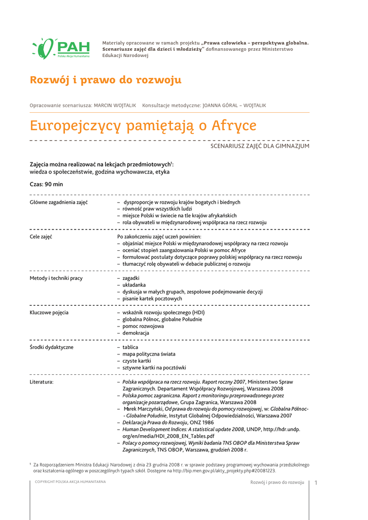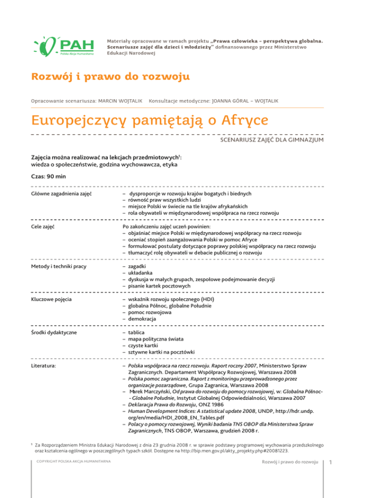 Materiały opracowane w ramach projektu „Prawa człowieka – perspektywa globalna. Scenariusze zajęć dla dzieci i młodzieży” dofinansowanego przez Ministerstwo Edukacji Narodowej Rozwój i prawo do rozwoju Opracowanie scenariusza: Marcin Wojtalik Konsultacje metodyczne: Joanna Góral – Wojtalik Europejczycy pamiętają o Afryce Scenariusz zajęć dla gimnazjum Zajęcia można realizować na lekcjach przedmiotowych1: wiedza o społeczeństwie, godzina wychowawcza, etyka Czas: 90 min Główne zagadnienia zajęć – dysproporcje w rozwoju krajów bogatych i biednych – równość praw wszystkich ludzi – miejsce Polski w świecie na tle krajów afrykańskich – rola obywateli w międzynarodowej współpraca na rzecz rozwoju Cele zajęćPo zakończeniu zajęć uczeń powinien: – objaśniać miejsce Polski w międzynarodowej współpracy na rzecz rozwoju – oceniać stopień zaangażowania Polski w pomoc Afryce – formułować postulaty dotyczące poprawy polskiej współpracy na rzecz rozwoju – tłumaczyć rolę obywateli w debacie publicznej o rozwoju Metody i techniki pracy – zagadki – układanka – dyskusja w małych grupach, zespołowe podejmowanie decyzji – pisanie kartek pocztowych Kluczowe pojęcia – wskaźnik rozwoju społecznego (HDI) – globalna Północ, globalne Południe – pomoc rozwojowa – demokracja Środki dydaktyczne – tablica – mapa polityczna świata – czyste kartki – sztywne kartki na pocztówki Literatura: – Polska współpraca na rzecz rozwoju. Raport roczny 2007, Ministerstwo Spraw Zagranicznych. Departament Współpracy Rozwojowej, Warszawa 2008 – Polska pomoc zagraniczna. Raport z monitoringu przeprowadzonego przez organizacje pozarządowe, Grupa Zagranica, Warszawa 2008 – Marek Marczyński, Od prawa do rozwoju do pomocy rozwojowej, w: Globalna Północ- Globalne Południe, Instytut Globalnej Odpowiedzialności, Warszawa 2007 – Deklaracja Prawa do Rozwoju, ONZ 1986 – Human Development Indices: A statistical update 2008, UNDP, http://hdr.undp. org/en/media/HDI_2008_EN_Tables.pdf – Polacy o pomocy rozwojowej, Wyniki badania TNS OBOP dla Ministerstwa Spraw Zagranicznych, TNS OBOP, Warszawa, grudzień 2008 r. Za Rozporządzeniem Ministra Edukacji Narodowej z dnia 23 grudnia 2008 r. w sprawie podstawy programowej wychowania przedszkolnego oraz kształcenia ogólnego w poszczególnych typach szkół. Dostępne na http://bip.men.gov.pl/akty_projekty.php#20081223. 1 Copyright Polska Akcja Humanitarna Rozwój i prawo do rozwoju Przebieg zajęć Czas Co trzeba zrobić? Materiały 10 min. Przed wejściem uczniów do klasy narysuj na tablicy oś od 1 do 179 i zaznacz na Tablica niej liczby 1, 44, 88, 132 i 179, które dzielą ten zakres na cztery równe części. Uwagi Pełna lista 179 krajów uszeregowanych według HDI, uaktualniona w grudniu 2008 roku, znajduje się na stronie internetowej UNDP – dokładny adres – patrz: Literatura. Powiedz uczniom, że tematem lekcji jest rola Polski w świecie. Będziecie rozmawiać o rozwoju różnych krajów. Zapytaj uczniów, jak myślą, co świadczy o rozwoju danego kraju. Gdy uczniowie podadzą swoje propozycje, podsumuj, zwracając uwagę na mnogość przejawów rozwoju (dostęp do podstawowych usług, takich jak edukacja, służba zdrowia, ubezpieczenia społeczne, a także uprzemysłowienie, styl życia, ochrona środowiska, równość szans itd.). Kraj rozwinięty to taki, w którym ludzie mają: długie i zdrowe życie, – dostęp do edukacji, – godziwe warunki bytowe. Przedstaw wskaźnik rozwoju społecznego (HDI). Wyjaśnij, że wskaźnik ten uwzględnia nie tylko bogactwo kraju (liczone w dochodzie na mieszkańca), ale też dwa inne ważne czynniki: dostęp do edukacji i długość życia. Powiedz, że na liście państw uszeregowanych według HDI znajduje się również Polska. Poproś uczniów, żeby aby zastanowili się, czy Polska jest krajem bogatym i zgadli, które miejsce zajmuje na liście HDI. Poprawna odpowiedź: miejsce 39. – wg danych z 2008 r. Zaznacz miejsce Polski na osi na tablicy. Zwróć uwagę, że nasz kraj mieści się w pierwszej ćwiartce; należy zatem do najbardziej rozwiniętych krajów na świecie. Zapytaj uczniów, czy tak wysokie miejsce Polski ich zdziwiło. Powiedz, że w trakcie tej lekcji poznają jeszcze więcej ciekawych faktów. Podziel uczniów na 5-6 grup. Poproś, aby na kartce papieru stworzyli dwie listy krajów – pięć państw bardziej rozwiniętych od Polski i pięć mniej rozwiniętych. Powiedz uczniom, że wygra ta grupa, która poprawnie wymieni po pięć krajów bardziej i mniej rozwiniętych, a ponadto uwzględni państwa z jak największej liczby kontynentów. 10 min. Ważne: przypomnij uczniom, że wszyscy ludzie są równi pod względem praw i godności. Zaznacz, że w krajach ubogich mniej ludzi może korzystać z praw, które im przysługują. Gdy uczniowie skończą pracę, poproś przedstawicieli grup na środek klasy. Przystępujecie do porównania odpowiedzi grup z informacjami o miejscu poszczególnych krajów na liście HDI. Rozdaj uczniom siedzącym w ławkach materiał pomocniczy nr 2 – Alfabetyczna lista krajów. Przedstawiciele poszczególnych grup czytają odpowiedzi swoich grup, a klasa sprawdza, które z nich są zgodne z rzeczywistością. Na końcu podsumuj wyniki. Jeśli uczniowie mieli trudności z wymienieniem krajów mniej rozwiniętych od Polski, zapytaj, jak myślą, dlaczego tak jest. 10 min. Materiał pomocniczy nr 1 – Kraje bardziej i mniej rozwinięte Materiał pomocniczy nr 2 – Alfabetyczna lista krajów Podkreśl, że warto poznać nie tylko kraje bardziej rozwinięte; pozostałe kraje stanowią przecież większość świata. Wyjaśnij uczniom pojęcia globalna Północ i globalne Południe. Zaznacz, że Polska, podobnie jak pozostałe kraje znajdujące się wysoko na liście HDI, należy do bogatej Północy. Materiał pomocniczy nr 3 Podziel uczniów na grupy. Rozdaj im poci