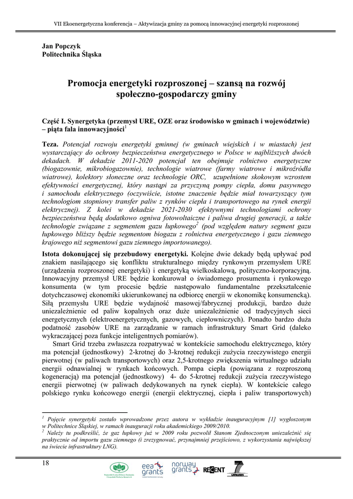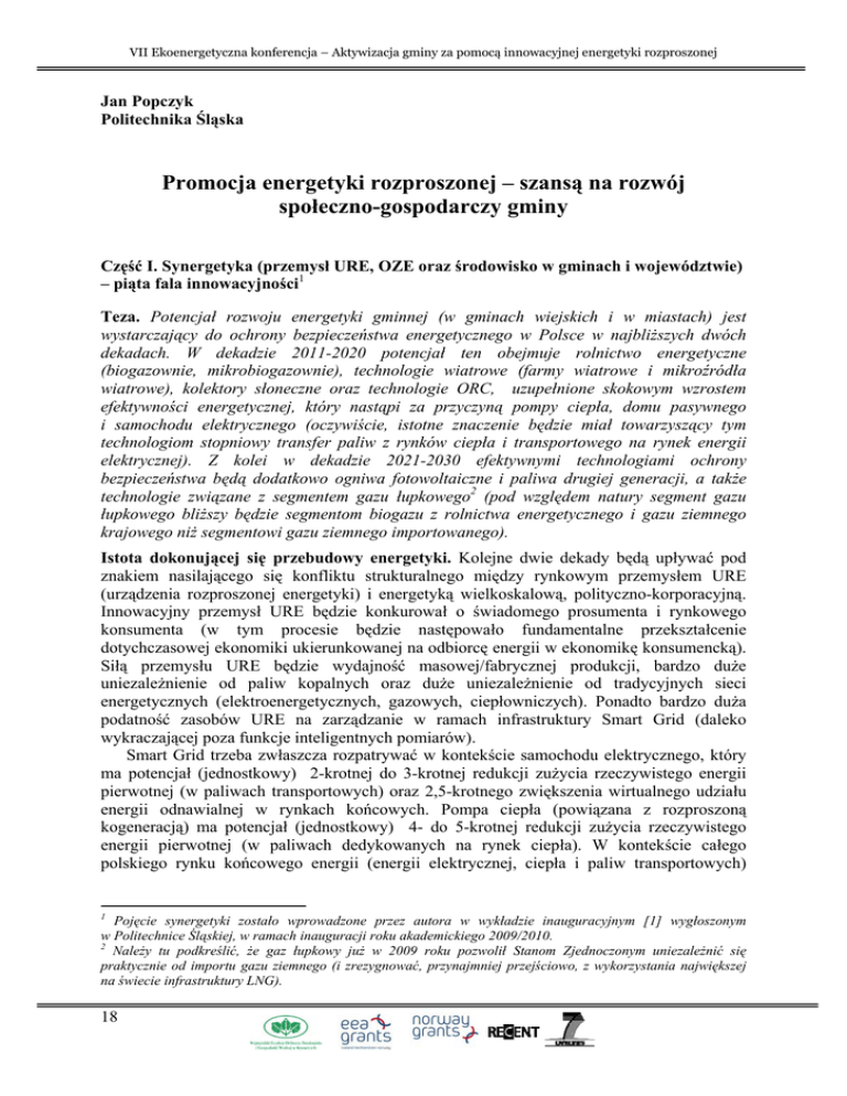 VII Ekoenergetyczna konferencja – Aktywizacja gminy za pomocą innowacyjnej energetyki rozproszonej Jan Popczyk Politechnika Śląska Promocja energetyki rozproszonej – szansą na rozwój społeczno-gospodarczy gminy Część I. Synergetyka (przemysł URE, OZE oraz środowisko w gminach i województwie) – piąta fala innowacyjności1 Teza. Potencjał rozwoju energetyki gminnej (w gminach wiejskich i w miastach) jest wystarczający do ochrony bezpieczeństwa energetycznego w Polsce w najbliższych dwóch dekadach. W dekadzie 2011-2020 potencjał ten obejmuje rolnictwo energetyczne (biogazownie, mikrobiogazownie), technologie wiatrowe (farmy wiatrowe i mikroźródła wiatrowe), kolektory słoneczne oraz technologie ORC, uzupełnione skokowym wzrostem efektywności energetycznej, który nastąpi za przyczyną pompy ciepła, domu pasywnego i samochodu elektrycznego (oczywiście, istotne znaczenie będzie miał towarzyszący tym technologiom stopniowy transfer paliw z rynków ciepła i transportowego na rynek energii elektrycznej). Z kolei w dekadzie 2021-2030 efektywnymi technologiami ochrony bezpieczeństwa będą dodatkowo ogniwa fotowoltaiczne i paliwa drugiej generacji, a także technologie związane z segmentem gazu łupkowego2 (pod względem natury segment gazu łupkowego bliższy będzie segmentom biogazu z rolnictwa energetycznego i gazu ziemnego krajowego niż segmentowi gazu ziemnego importowanego). Istota dokonującej się przebudowy energetyki. Kolejne dwie dekady będą upływać pod znakiem nasilającego się konfliktu strukturalnego między rynkowym przemysłem URE (urządzenia rozproszonej energetyki) i energetyką wielkoskalową, polityczno-korporacyjną. Innowacyjny przemysł URE będzie konkurował o świadomego prosumenta i rynkowego konsumenta (w tym procesie będzie następowało fundamentalne przekształcenie dotychczasowej ekonomiki ukierunkowanej na odbiorcę energii w ekonomikę konsumencką). Siłą przemysłu URE będzie wydajność masowej/fabrycznej produkcji, bardzo duże uniezależnienie od paliw kopalnych oraz duże uniezależnienie od tradycyjnych sieci energetycznych (elektroenergetycznych, gazowych, ciepłowniczych). Ponadto bardzo duża podatność zasobów URE na zarządzanie w ramach infrastruktury Smart Grid (daleko wykraczającej poza funkcje inteligentnych pomiarów). Smart Grid trzeba zwłaszcza rozpatrywać w kontekście samochodu elektrycznego, który ma potencjał (jednostkowy) 2-krotnej do 3-krotnej redukcji zużycia rzeczywistego energii pierwotnej (w paliwach transportowych) oraz 2,5-krotnego zwiększenia wirtualnego udziału energii odnawialnej w rynkach końcowych. Pompa ciepła (powiązana z rozproszoną kogeneracją) ma potencjał (jednostkowy) 4- do 5-krotnej redukcji zużycia rzeczywistego energii pierwotnej (w paliwach dedykowanych na rynek ciepła). W kontekście całego polskiego rynku końcowego energii (energii elektrycznej, ciepła i paliw transportowych) 1 Pojęcie synergetyki zostało wprowadzone przez autora w wykładzie inauguracyjnym [1] wygłoszonym w Politechnice Śląskiej, w ramach inauguracji roku akademickiego 2009/2010. 2 Należy tu podkreślić, że gaz łupkowy już w 2009 roku pozwolił Stanom Zjednoczonym uniezależnić się praktycznie od importu gazu ziemnego (i zrezygnować, przynajmniej przejściowo, z wykorzystania największej na świecie infrastruktury LNG). 18 VII Ekoenergetyczna konferencja – Aktywizacja gminy za pomocą innowacyjnej energetyki rozproszonej samochód elektryczny ma w tendencji potencjał redukcji tego rynku o około 20%, a pompa ciepła o około 30%. Polityczno-korporacyjna energetyka będzie natomiast spętana całkowitą zależnością od paliw kopalnych, posiadanymi nieefektywnymi zasobami technicznymi i pracy (dalszą niezdolnością do pro-efektywnościowej restrukturyzacji), także negatywnym już efektem skali (technicznej i organizacyjnej), ale przede wszystkim ograniczeniami środowiskowymi (dotyczącymi emisji CO2 w wytwarzaniu i lokalizacyjnymi w segmencie sieciowym) oraz ograniczonymi możliwościami mobilizacji ogromnego kapitału potrzebnego do finansowania wielkich i jednocześnie bardzo ryzykownych projektów. Ważny wreszcie jest fakt, że Smart Grid, ze swojej natury nie tworzy potencjału wzrostowego wielkoskalowej politycznokorporacyjnej energetyki (w szczególności zła kondycja tradycyjnych sieci energetycznych jest punktem wyjścia dla Smart Gridu, a same sieci są bardzo potrzebne Smart Gridowi do rozwoju w pierwszym etapie, ale one same na pewno nie zaczną się rozwijać za przyczyną Smart Gridu, czyli wzajemności nie będzie). Potrzeba przebudowy regulacji. Istnieje potrzeba wypracowania propozycji na polską prezydencję w 2011 roku ukierunkowanej na: (i) integrację systemów ETS i non-ETS oraz (ii) integrację systemów wspomagania OZE i redukcji emisji, przy wykorzystaniu inkorporacji kosztów zewnętrznych ochrony środowiska do kosztów paliwa. Rozwiązania idące w tym kierunku dawałyby Polsce wielką szansę. Mianowicie, szansę wykorzystania wielkich zasobów energii odnawialnej, w szczególności zasobów rolnictwa energetycznego, spełniających kryterium ekonomiczne w sensie takim, jaki wynika z inkorporacji kosztów środowiska do kosztów paliwa [1, 2]. Wówczas też cel dotyczący udziału energii odnawialnej w rynkach końcowych, wymagany przez dyrektywę 2009/28/WE, zostałby spełniony z bardzo dużą nadwyżką, a dwa pozostałe cele zostałyby spełnione niejako „automatycznie”. Zasadniczymi barierami regulacyjnymi poprawy efektywności energetyki, które wymagają niezwłocznego przystąpienia do ich przełamywania są: 1. Brak jednolitego podejścia do internalizacji kosztów zewnętrznych szeroko rozumianych, charakterystycznych w szczególności dla elektroenergetyki i ciepłownictwa. Chodzi tu o takie koszty jak: koszty środowiska w wytwarzaniu energii elektrycznej i ciepła, koszty sieciowe, koszty usług systemowych, kt