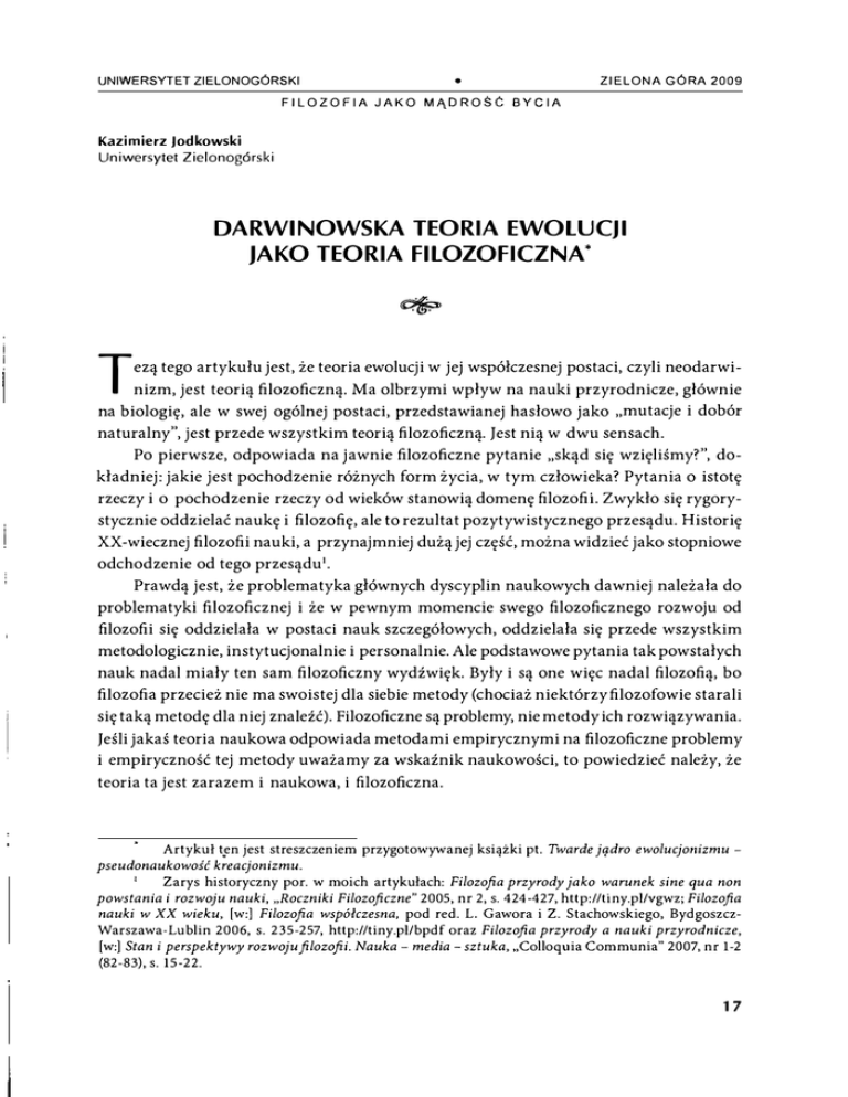 UNIWERSYTET ZIELONOGÓRSKI • ZIELON A GÓRA 2009 FILOZOFIA JAK O MĄDROŚĆ BYCIA Kazimierz Jodkowski Uniwersytet Zielonogórski DARWINOWSKA TEORIA EWOLUCJI JAKO TEORIA FllOZOFICZNA* � �� T ezą tego artykułu jest, że teoria ewolucji w jej współczesnej postaci, czyli neodarwi nizm, jest teorią filozoficzną. Ma olbrzymi wpływ na nauki przyrodnicze, głównie na biologię, ale w swej ogólnej postaci, przedstawianej hasłowo jako "mutacje i dobór naturalny ", jest przede wszystkim teorią filozoficzną. Jest nią w dwu sensach. Po pierwsze, odpowiada na jawnie filozoficzne pytanie "skąd się wzięliśmy? ", do kładniej: jakie jest pochodzenie różnych form życia, w tym człowieka? Pytania o istotę rzeczy i o pochodzenie rzeczy od wieków stanowią domenę filozofii. Zwykło się rygory stycznie oddzielać naukę i filozofię, ale to rezultat pozytywistycznego przesądu. Historię XX-wiecznej filozofii nauki, a przynajmniej dużą jej część, można widzieć jako stopniowe odchodzenie od tego przesądu'. Prawdą jest, że problematyka głównych dyscyplin naukowych dawniej należała do problematyki filozoficznej i że w pewnym momencie swego filozoficznego rozwoju od filozofii się oddzielała w postaci nauk szczegółowych, oddzielała się przede wszystkim metodologicznie, instytucjonalnie i personalnie. Ale podstawowe pytania tak powstałych nauk nadal miały ten sam filozoficzny wydźwięk. Były i są one więc nadal filozofią, bo filozofia przecież nie ma swoistej dla siebie metody (chociaż niektórzy filozofowie starali się taką metodę dla niej znaleźć). Filozoficzne są problemy, nie metody ich rozwiązywania. Jeśli jakaś teoria naukowa odpowiada metodami empirycznymi na filozoficzne problemy i empiryczność tej metody uważamy za wskaźnik naukowości, to powiedzieć należy, że teoria ta jest zarazem i naukowa, i filozoficzna. Artykuł t.en jest streszczeniem przygotowywanej książki pt. Twarde jqdro ewolucjonizmu pseudonaukowość kreacjonizmu. , Zarys historyczny por. w moich artykułach: Filozofia przyrody jako warunek sine qua non powstania i rozwoju nauki, "Roczniki Filozoficzne" 2005, nr 2, s. 424-427, http://tiny.pl/vgwz; Filozofia nauki w XX wieku, [w:] Filozofia współczesna, pod red. L. Gawora i Z. Stachowskiego, Bydgoszcz Warszawa-Lublin 2006, s. 235-257, http://tiny.pl/bpdf oraz Filozofia przyrody a nauki przyrodnicze, [w:] Stan i perspektywy rozwoju filozofii. Nauka - media - sztuka, "Colloquia Communia" 2007, nr 1-2 (82-83), s. 15-22. 17 Kazimierz Jodkowski Oczywiście, filozoficzny charakter ma wówczas nie cała teoria, a tylko ta jej część, która kontynuuje odpowiedzi na pytania dawniej zadawane przez filozofów (o istotę rzeczy lub ich genezę). Duża część dobrze rozwiniętych teorii naukowych filozoficznego charakteru już nie ma, gdyż rozwiązywanie jednych problemów, nawet filozoficznych z natury, generuje wiele nowych problemów, które już nie muszą mieć i najczęściej nie mają filozoficznego charakteru. Ale dopóki teoria nie pozbywa się pierwotnych ( "zało życielskich ") problemów, dopóty mamy prawo uważać ją za filozoficzną (przynajmniej w dużym stopniu), a samych uczonych za sprzymierzeńców, którzy wyspecjalizowanymi metodami osiągają odpowiedzi praktycznie niedostępne dla zawodowych filozofów. Nie jest więc tak, jak się to niektórym uczonym wydaje, że z chwilą oderwania się nauki od filozofii ustaje jakakolwiek więź między tymi dwiema sferami aktywności intelektualnej. Ona istnieje nadal, a uczeni, odpowiadający na pytania filozoficzne, praktycznie są też i filozofami. Jest to pierwszy, mniej kontrowersyjny sens, w jakim teoria ewolucji jest teorią filozoficzną. Ale teoria ewolucji jest też teorią filozoficzną w innym sensie i jest to teza znacznie bardziej nieoczywista niż pierwsza. Teoria ewolucji jest mianowicie metafizyką. Pogląd taki jest nieoczywisty głównie dlatego, że wszyscy wiemy, jak wiele empirycznych badań ewolucjoniści prowadzili i prowadzą, oraz jak wiele z tych badań zakończyło się sukcesem. Ale to nie te badania, oczywiście, nazywam tu metafizyką. Tak kwalifikuję ogólny teoretyczny fundament badań ewolucjonistycznych, podstawowe założenia, wyj ściowe twierdzenia tego, co się nazywa współczesnym ewolucjonizmem. Albo inaczej: to, z czego ewolucjoniści nigdy nie zrezygnują, a co za Imre Lakatosem nazywam twardym jądrem ewolucjonizmu. Na temat tego, co przewiduje współczesna teoria ewolucji, istnieje wiele nieporo zumień. W jednym ze swoich dawniejszych artykułów przeprowadziłem szczegółowe badania, poszukując takich konsekwencji empirycznych teorii, co do których zgadzają się wszyscy ewolucjoniści, czyli empirycznego tzw. twardego jądra ewolucjonizmu2• Ist nienie takiego twardego jądra jest istotne, jeśli teoria ma być empirycznie falsyfikowalna. Odróżnia się teorie "miękkie", które dostosowują się do bardzo wielu, nawet przeciwnych, możliwych sytuacji empirycznych, i "sztywne", które wykluczają wiele możliwych do pomyślenia sytuacji empirycznych (wyników obserwacji czy eksperymentów). Każda teoria jest do pewnego stopnia "miękka", a to dzięki możliwości modyfikowania pasa ochronnych hipotez oraz redefiniowaniu terminów. Według kryteriów Karla Poppera czy Lakatosa teoria całkowicie "miękka" jest niefalsyfikowalna, czyli nienaukowa. Im teoria " sztywniejsza" tym - według tych kryteriów - lepiej. Analizowałem wypowiedzi licznych ewolucjonistów, ale poszukiwania te zakończyły się fiaskiem. Wygląda na to, że Por. W poszukiwaniu twardego jądra ewolucjonizmu, "Filozofia Nauki" 2001, nr 2 (34), s. 7-18, http://tiny.pl/k92p. 18 Darwinowska teoria ewolucji jako teoria filozoficzna współczesna teoria ewolucji potrafi dopasować się do niezwykle zróżnicowanego zakresu możliwych faktów, praktycznie do wszystkich możliwych. Trudno sobie wyobrazić jakieś fakty, których teoria 