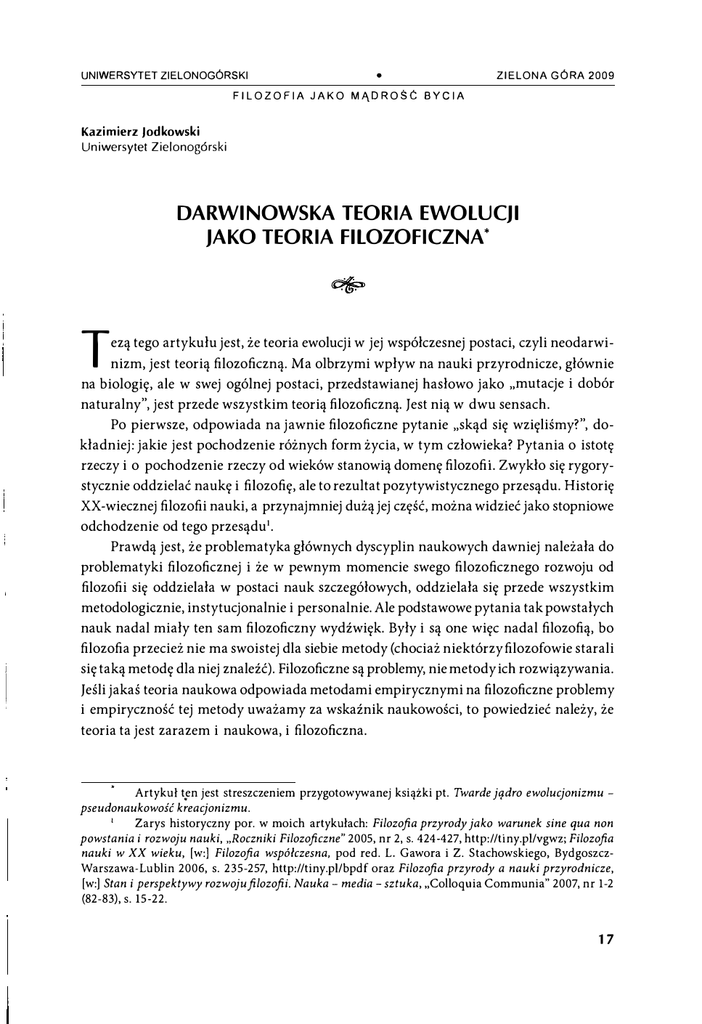 Jodkowski, Darwinowska teoria ewolucji jako teoria filozoficzna
