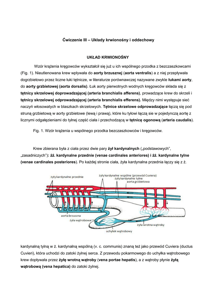 Ćwiczenie III – Układy krwionośny i oddechowy UKŁAD KRWIONOŚNY Wzór krążenia kręgowców wykształcił się już u ich wspólnego przodka z bezczaszkowcami (Fig. 1). Nieutlenowana krew wpływała do aorty brzusznej (aorta ventralis) a z niej przepływała dogrzbietowo przez liczne łuki tętnicze, w literaturze porównawczej nazywane zwykle łukami aorty, do aorty grzbietowej (aorta dorsalis). Łuk aorty pierwotnych wodnych kręgowców składa się z tętnicy skrzelowej doprowadzającej (arteria branchialis afferens), prowadzące krew do skrzeli i tętnicy skrzelowej odprowadzającej (arteria branchialis efferens). Między nimi występuje sieć naczyń włosowatych w blaszkach skrzelowych. Tętnice skrzelowe odprowadzające łączą się pod struną grzbietową w aorty grzbietowe (lewą i prawą), które ku tyłowi łączą sie w pojedynczą aortę z licznymi odgałęzieniami do tylnej część ciała i przechodzącą w tętnicę ogonową (arteria caudalis). Fig. 1. Wzór krążenia u wspólnego przodka bezczaszkowców i kręgowców. Krew zbierana była z ciała przez dwie pary żył kardynalnych („podstawowych”, „zasadniczych”): żż. kardynalne przednie (venae cardinales anteriores) i żż. kardynalne tylne (venae cardinales posteriores). Po każdej stronie ciała, żyła kardynalna przednia łączy się z ż. kardynalną tylną w ż. kardynalną wspólną (v. c. communis) znaną też jako przewód Cuviera (ductus Cuvieri), która uchodzi do zatoki żylnej serca. Z przewodu pokarmowego do uchyłka wątrobowego krew dopływała przez żyłę wrotną wątroby (vena portae hepatis), a z wątroby płynie żyłą wątrobową (vena hepatica) do zatoki żylnej. Bezszczękowce i ryby Krew kręgowców napędzana jest przez serce, które u pierwotnych kręgowców (bezszczękowców i pierwotnych szczękowców) tłoczy nieutlenowaną krew żylną do aorty brzusznej. U śluzic to serce odpowiadające sercu innych kręgowców nazywane jest sercem skrzelowym, ponieważ w ich układzie żylnym (niecałkowicie zamkniętym tzn. rozpadającym sie w głowie i ogonie na zatoki) wystepują jeszcze trze inne kurczliwe odcinki podwyższające ciśnienie i przepływ krwi żylnej: serce kardynalne w żyłach kardynalnych, serce wrotne w żyle wrotnej wątroby i serce ogonowe w żyłach ogonowych. Serce skrzelowe śluzic zbudowane jest trzech części, zatoki żylnej, przedsionka i komory, które kurczą się jedna po drugiej automatycznie, bez udziału obwodowych nerwów. Fig. 2. Serce minoga (z lewej) i promieniopłetwych (z prawej) w przekroju podłużnym (schematy) Serce pozostałych pierwotnych kręgowców (Fig. 2) jest czteroczęściowe, składa się z zatoki żylnej (sinus venosus), przedsionka (atrium), komory (ventriculus) i stożka tętniczego (conus arteriosus), i jego skurcze kontrolowane są przez obwodowy układ nerwowy. U promieniopłetwych stożek ulega redukcji a przedni rozszerzony odcinek aorty brzusznej tworzy opuszkę tętniczą (bulbus arteriosus) zbudowaną z mięśni gładkich. Bezczaszkowce mają liczne łuki aorty (śluzice 14, minogi 8), u dorosłych minogów zachowuje się tylko prawy przewód Cuviera. U szczękowców (Fig. 3) liczba łuków aorty zredukowana do 6 w rozwoju embrionalnym i zwykle mniejszej liczby u większości dorosłych z wyjątkiem niektórych chrzęstnoszkieletowych w wyniku wtórnego zwielokrotnienia występuje do 10 a nawet 12 łuków aorty. U chrzęstnoszkieletowych tętnice odprowadzające łuków aorty tworzą pętle wokół szczelin skrzelowych. U promieniopłetwych pozostają cztery pary łuków aorty (III-VI). Do głowy krew doprowadzana pierwotnie przez przedłużenia aort grzbietowych czyli tętnice szyjne wewnętrzne (l. poj. arteria carotis interna) oraz tętnice szyjne zewnętrzne, które u ryb odchodzą od tętnicy odprowadzającej łuku aorty III (czyli pierwszego zachowanego), dzięki czemu prowadzą do żuchwy krew utlenowaną, ale rozwijają się tak jak u innych kręgowców jako przedłużenia aorty brzusznej. Fig. 3. Ewolucja łuków aorty szczękowców (widzianych od strony brzusznej). U ryb każdy łuk aorty składa się z tętnicy doprowadzającej i tętnicy odprowadzającej. Linia przerywaną zaznaczone są naczynia zanikające przed osiągnięciem stadium dorosłego, a występujące w stadiach zarodkowych oraz/lub larwalnych Krew żylna (Fig. 4) z tylnej części ciała doprowadzana jest przez żyły kardynalne tylne do nerek, gdzie żyły rozgałęziają się na naczynia włosowate oplatające kanaliki nerkowe. Tylne odcinki żyły kardynalnych tylnych stają się zatem żyłami wrotnymi nerek (l. poj. vena portae renis). Z brzusznej ściany ciała krew doprowadzana jest do serca przez żyły brzuszne (l. poj. vena abdominalis). Fig. 4. Żyły żarłacza (chrzęstnoszkieletowe) jako pierwotnego szczękowca Czworonogi Serce czworonogów ma dwa przedsionki oddzielone przegrodą przedsionkową: w prawym przedsionku gromadzi się głównie (u płazów) lub wyłącznie (u owodniowców) krew odtlenowana, która dopływa przez zatokężylną, a do lewego przedsionka wpływa żyłami płucnymi krew utlenowana. U płazów mieszaniu się krwi w komorze zapobiega kilka mechanizmów: (1) prawy przedsionek kurczy się wcześniej niż lewy, (2) gąbczasta budowa ściany komory z uchyłkami utrudniającymi mieszanie się krwi, (3) wzdłużna zastawka spiralna w stożku tętniczym rozdziela krew na trzy strumienie. W rezultacie krew nieutlenowana trafia głównie do tętnic płucnych, krew mieszana do łuków aorty, a krew utlenowana do tętnic szyjnych. W sercu owodniowców zatoka żylna jest w różnym stopniu zredukowana a komora podzielona jest przynajmniej częściowo na dwie części. W serce łuskonośnych i żółwi jest mała zatoka żylna (otwierająca się do przedsionka prawego) a komora podzielona w płaszczyźnie czołowej niekompletną przegrodą na część brzuszną i grzbietową (część grzbietowa jest większa i odpo