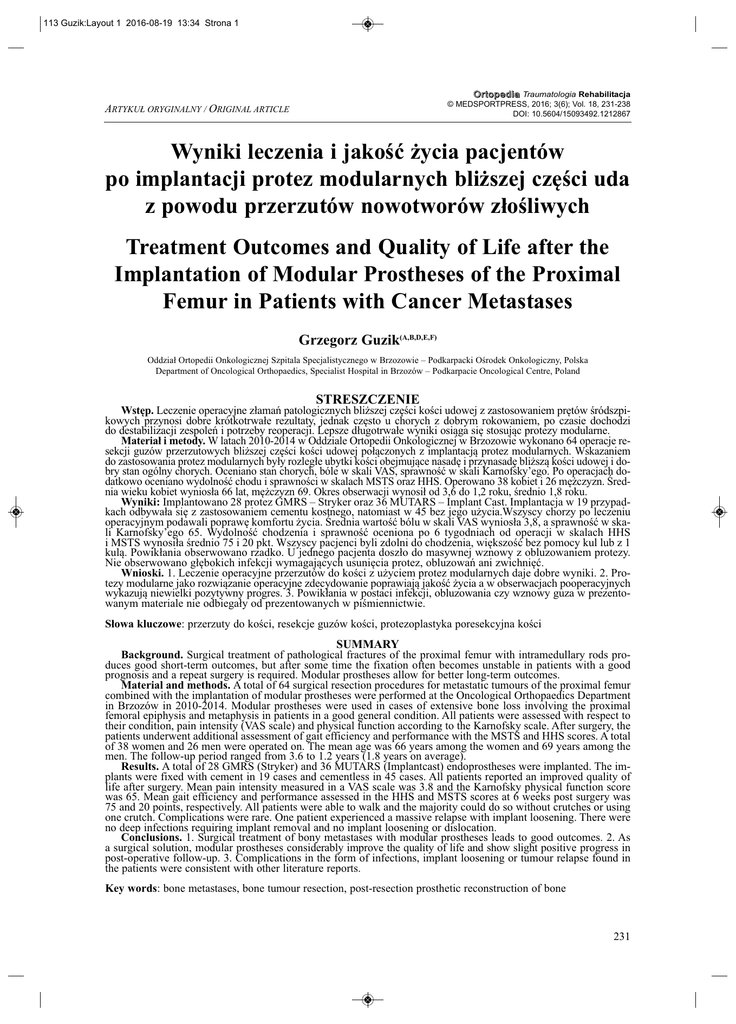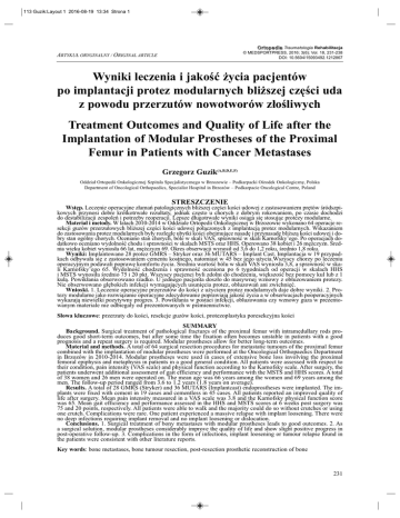 113 Guzik:Layout 1 2016-08-19 13:34 Strona 1 O r t o p e d i a Traumatologia Rehabilitacja © MEDSPORTPRESS, 2016; 3(6); Vol. 18, 231-238 DOI: 10.5604/15093492.1212867 ARTYKUŁ ORYGINALNY / ORIGINAL ARTICLE Wyniki leczenia i jakość życia pacjentów po implantacji protez modularnych bliższej części uda z powodu przerzutów nowotworów złośliwych Treatment Outcomes and Quality of Life after the Implantation of Modular Prostheses of the Proximal Femur in Patients with Cancer Metastases Grzegorz Guzik(A,B,D,E,F) Oddział Ortopedii Onkologicznej Szpitala Specjalistycznego w Brzozowie – Podkarpacki Ośrodek Onkologiczny, Polska Department of Oncological Orthopaedics, Specialist Hospital in Brzozów – Podkarpacie Oncological Centre, Poland STRESZCZENIE Wstęp. Leczenie operacyjne złamań patologicznych bliższej części kości udowej z zastosowaniem prętów śródszpikowych przynosi dobre krótkotrwałe rezultaty, jednak często u chorych z dobrym rokowaniem, po czasie dochodzi do destabilizacji zespoleń i potrzeby reoperacji. Lepsze długotrwałe wyniki osiąga się stosując protezy modularne. Materiał i metody. W latach 2010-2014 w Oddziale Ortopedii Onkologicznej w Brzozowie wykonano 64 operacje resekcji guzów przerzutowych bliższej części kości udowej połączonych z implantacją protez modularnych. Wskazaniem do zastosowania protez modularnych były rozległe ubytki kości obejmujące nasadę i przynasadę bliższą kości udowej i dobry stan ogólny chorych. Oceniano stan chorych, bóle w skali VAS, sprawność w skali Karnofsky’ego. Po operacjach dodatkowo oceniano wydolność chodu i sprawności w skalach MSTS oraz HHS. Operowano 38 kobiet i 26 mężczyzn. Średnia wieku kobiet wyniosła 66 lat, mężczyzn 69. Okres obserwacji wynosił od 3,6 do 1,2 roku, średnio 1,8 roku. Wyniki: Implantowano 28 protez GMRS – Stryker oraz 36 MUTARS – Implant Cast. Implantacja w 19 przypadkach odbywała się z zastosowaniem cementu kostnego, natomiast w 45 bez jego użycia.Wszyscy chorzy po leczeniu operacyjnym podawali poprawę komfortu życia. Średnia wartość bólu w skali VAS wyniosła 3,8, a sprawność w skali Karnofsky’ego 65. Wydolność chodzenia i sprawność oceniona po 6 tygodniach od operacji w skalach HHS i MSTS wynosiła średnio 75 i 20 pkt. Wszyscy pacjenci byli zdolni do chodzenia, większość bez pomocy kul lub z 1 kulą. Powikłania obserwowano rzadko. U jednego pacjenta doszło do masywnej wznowy z obluzowaniem protezy. Nie obserwowano głębokich infekcji wymagających usunięcia protez, obluzowań ani zwichnięć. Wnioski. 1. Leczenie operacyjne przerzutów do kości z użyciem protez modularnych daje dobre wyniki. 2. Protezy modularne jako rozwiązanie operacyjne zdecydowanie poprawiają jakość życia a w obserwacjach pooperacyjnych wykazują niewielki pozytywny progres. 3. Powikłania w postaci infekcji, obluzowania czy wznowy guza w prezentowanym materiale nie odbiegały od prezentowanych w piśmiennictwie. Słowa kluczowe: przerzuty do kości, resekcje guzów kości, protezoplastyka poresekcyjna kości SUMMARY Background. Surgical treatment of pathological fractures of the proximal femur with intramedullary rods produces good short-term outcomes, but after some time the fixation often becomes unstable in patients with a good prognosis and a repeat surgery is required. Modular prostheses allow for better long-term outcomes. Material and methods. A total of 64 surgical resection procedures for metastatic tumours of the proximal femur combined with the implantation of modular prostheses were performed at the Oncological Orthopaedics Department in Brzozów in 2010-2014. Modular prostheses were used in cases of extensive bone loss involving the proximal femoral epiphysis and metaphysis in patients in a good general condition. All patients were assessed with respect to their condition, pain intensity (VAS scale) and physical function according to the Karnofsky scale. After surgery, the patients underwent additional assessment of gait efficiency and performance with the MSTS and HHS scores. A total of 38 women and 26 men were operated on. The mean age was 66 years among the women and 69 years among the men. The follow-up period ranged from 3.6 to 1.2 years (1.8 years on average). Results. A total of 28 GMRS (Stryker) and 36 MUTARS (Implantcast) endoprostheses were implanted. The implants were fixed with cement in 19 cases and cementless in 45 cases. All patients reported an improved quality of life after surgery. Mean pain intensity measured in a VAS scale was 3.8 and the Karnofsky physical function score was 65. Mean gait efficiency and performance assessed in the HHS and MSTS scores at 6 weeks post surgery was 75 and 20 points, respectively. All patients were able to walk and the majority could do so without crutches or using one crutch. Complications were rare. One patient experienced a massive relapse with implant loosening. There were no deep infections requiring implant removal and no implant loosening or dislocation. Conclusions. 1. Surgical treatment of bony metastases with modular prostheses leads to good outcomes. 2. As a surgical solution, modular prostheses considerably improve the quality of life and show slight positive progress in post-operative follow-up. 3. Complications in the form of infections, implant loosening or tumour relapse found in the patients were consistent with other literature reports. Key words: bone metastases, bone tumour resection, post-resection prosthetic reconstruction of bone 231 113 Guzik:Layout 1 2016-08-19 13:34 Strona 2 Guzik G. Wyniki modularnej protezoplastyki bliższej części kości udowej WSTĘP BACKGROUND Dotychczas najczęściej stosowaną metodą leczenia przerzutów do kości udowej była stabilizacja prętami śródszpikowymi. W przypadkach, w których resekowano guz przerzutowy, ubytek kości uzupełniano cementem kostnym (PMMA). Wczesne wyniki leczenia były zachęcające. Często jednak, po
