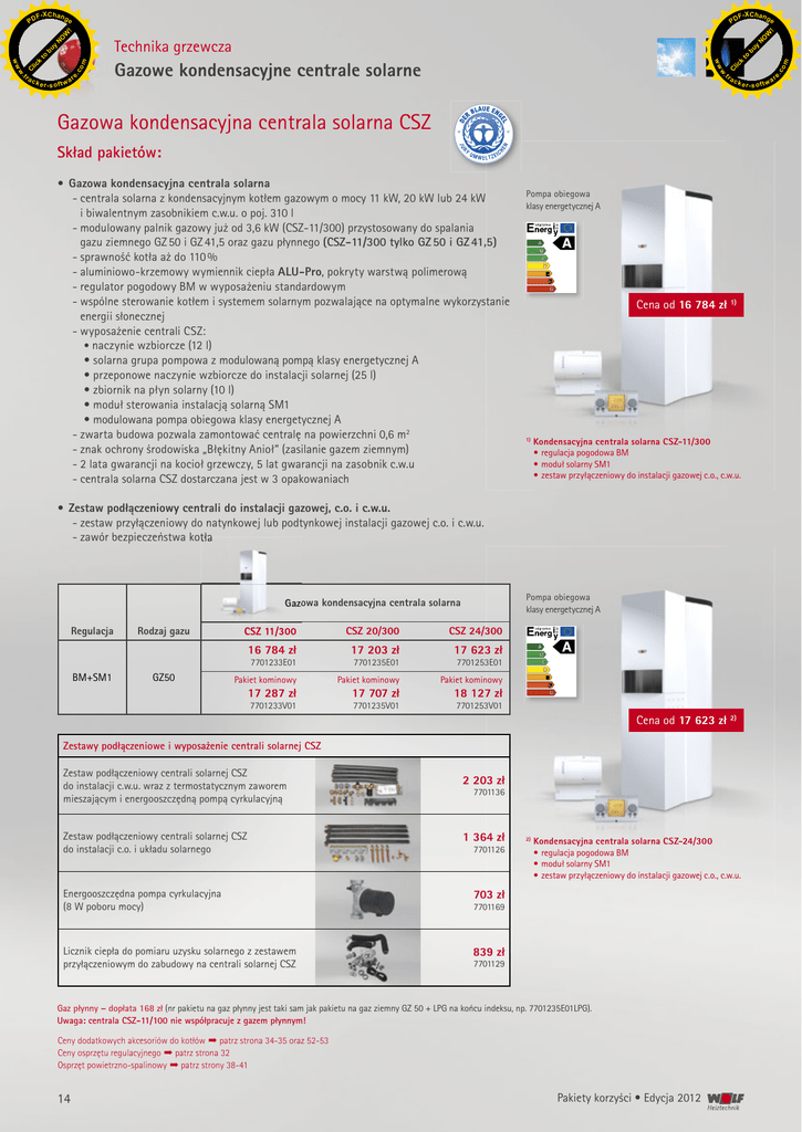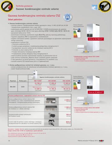 F -X C h a n ge F -X C h a n ge W y bu k lic tr ac k e r- s o ft w a Gazowa kondensacyjna centrala solarna CSZ Skład pakietów: • Gazowa kondensacyjna centrala solarna - centrala solarna z kondensacyjnym kotłem gazowym o mocy 11 kW, 20 kW lub 24 kW i biwalentnym zasobnikiem c.w.u. o poj. 310 l - modulowany palnik gazowy już od 3,6 kW (CSZ-11/300) przystosowany do spalania gazu ziemnego GZ 50 i GZ 41,5 oraz gazu płynnego (CSZ-11/300 tylko GZ 50 i GZ 41,5) - sprawność kotła aż do 110 % - aluminiowo-krzemowy wymiennik ciepła ALU-Pro, pokryty warstwą polimerową - regulator pogodowy BM w wyposażeniu standardowym - wspólne sterowanie kotłem i systemem solarnym pozwalające na optymalne wykorzystanie energii słonecznej - wyposażenie centrali CSZ: • naczynie wzbiorcze (12 l) • solarna grupa pompowa z modulowaną pompą klasy energetycznej A • przeponowe naczynie wzbiorcze do instalacji solarnej (25 l) • zbiornik na płyn solarny (10 l) • moduł sterowania instalacją solarną SM1 • modulowana pompa obiegowa klasy energetycznej A - zwarta budowa pozwala zamontować centralę na powierzchni 0,6 m2 - znak ochrony środowiska „Błękitny Anioł” (zasilanie gazem ziemnym) - 2 lata gwarancji na kocioł grzewczy, 5 lat gwarancji na zasobnik c.w.u - centrala solarna CSZ dostarczana jest w 3 opakowaniach Pompa obiegowa klasy energetycznej A Cena od 16 784 zł 1) 1) Kondensacyjna centrala solarna CSZ-11/300 • regulacja pogodowa BM • moduł solarny SM1 • zestaw przyłączeniowy do instalacji gazowej c.o., c.w.u. • Zestaw podłączeniowy centrali do instalacji gazowej, c.o. i c.w.u. - zestaw przyłączeniowy do natynkowej lub podtynkowej instalacji gazowej c.o. i c.w.u. - zawór bezpieczeństwa kotła Pompa obiegowa klasy energetycznej A Gazowa kondensacyjna centrala solarna Regulacja Rodzaj gazu CSZ 11/300 CSZ 20/300 CSZ 24/300 16 784 zł 17 203 zł 17 623 zł Pakiet kominowy Pakiet kominowy Pakiet kominowy 7701233V01 7701235V01 7701253V01 7701233E01 BM+SM1 GZ50 17 287 zł 7701235E01 17 707 zł 7701253E01 18 127 zł Cena od 17 623 zł 2) Zestawy podłączeniowe i wyposażenie centrali solarnej CSZ Zestaw podłączeniowy centrali solarnej CSZ do instalacji c.w.u. wraz z termostatycznym zaworem mieszającym i energooszczędną pompą cyrkulacyjną Zestaw podłączeniowy centrali solarnej CSZ do instalacji c.o. i układu solarnego Energooszczędna pompa cyrkulacyjna (8 W poboru mocy) Licznik ciepła do pomiaru uzysku solarnego z zestawem przyłączeniowym do zabudowy na centrali solarnej CSZ 2 203 zł 7701136 1 364 zł 7701126 2) Kondensacyjna centrala solarna CSZ-24/300 • regulacja pogodowa BM • moduł solarny SM1 • zestaw przyłączeniowy do instalacji gazowej c.o., c.w.u. 703 zł 7701169 839 zł 7701129 Gaz płynny – dopłata 168 zł (nr pakietu na gaz płynny jest taki sam jak pakietu na gaz ziemny GZ 50 + LPG na końcu indeksu, np. 7701235E01LPG). Uwaga: centrala CSZ-11/100 nie współpracuje z gazem płynnym! Ceny dodatkowych akcesoriów do kotłów ➡ patrz strona 34-35 oraz 52-53 Ceny osprzętu regulacyjnego ➡ patrz strona 32 Osprzęt powietrzno-spalinowy ➡ patrz strony 38-41 14 Pakiety korzyści • Edycja 2012 om to Gazowe kondensacyjne centrale solarne .c re C .c k e r- s o ft w a . . ac w w C lic k om to bu y Technika grzewcza ww ww tr N O N O W ! PD ! PD re F -X C h a n ge F -X C h a n ge W y bu k lic tr ac k e r- s o ft w a Solarne zestawy uzupełniające do gazowych kondensacyjnych central solarnych CSZ Zestawy 2 kolektorów słonecznych do współpracy z centralą CSZ Cena od 5 565 zł 1) 2 kolektory CFK-1 Centrala CSZ Typ montażu 5 565 zł Na dachówkach CSZ-11/300 Na blachodachówce CSZ-20/300 CSZ-24 / 300 Powierzchnia płaska 7700778N33 6 005 zł 7700778N33blacha 6 551 zł 7700778P33 6 661 zł W połaci dachu 7700778W33 2 kolektory TopSon F3-1 2 kolektory CRK-12 7 023 zł 12 903 zł 7 348 zł 12 483 zł 7 999 zł 12 378 zł 8 429 zł nie dotyczy 7700971N33 7700971N33blacha 7700971P33 7700971W33 2483563N39 1) 2483563B39 Cena od 7 023 zł 2) 2) Centrala CSZ Typ montażu Na dachówkach CSZ-11/300 Na blachodachówce CSZ-20/300 CSZ-24 / 300 Powierzchnia płaska 3 kolektory CFK-1 3 kolektory TopSon F3-1 3 kolektory CRK-12 7 967 zł 10 264 zł 19 092 zł 7700778N34 7700971N34blacha 10 590 zł 17 833 zł 9 604 zł 11 455 zł 18 043 zł 11 995 zł nie dotyczy 7700778P34 9 388 zł 7700778W34 7700971P34 7700971W34 2 płaskie kolektory słoneczne TopSon F3-1 • 2 kolektory słoneczne TopSon F3-1 • pakiet akcesoriów solarnych do gazowej kondensacyjnej centrali solarnej CSZ-11/300, CSZ-20/300 oraz CSZ-24/300 2483563N40 7700778N34blacha W połaci dachu 8 402 zł 7700971N34 2 płaskie kolektory słoneczne CFK-1 • 2 kolektory słoneczne CFK-1 • pakiet akcesoriów solarnych do gazowej kondensacyjnej centrali solarnej CSZ-11/300, CSZ-20/300 oraz CSZ-24/300 2483563P39 Zestawy 3 kolektorów słonecznych do współpracy z centralą CSZ 2483563B40 2483563P40 Cena od 12 903 zł 3) 3) Pakiety korzyści • Edycja 2012 om to Gazowe kondensacyjne centrale solarne .c re C .c k e r- s o ft w a . . ac w w C lic k om to bu y Technika grzewcza ww ww tr N O N O W ! PD ! PD 2 próżniowe kolektory słoneczne CRK-12 • 2 kolektory słoneczne CRK-12 • pakiet akcesoriów solarnych do gazowej kondensacyjnej centrali solarnej CSZ-11/300, CSZ-20/300 oraz CSZ-24/300 15 re