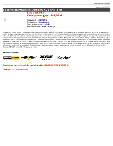 Informacje o produkcie Utworzono 02-03-2017 Spodnie bramkarskie JADBERG XGE PANTS III Cena : 499,00 zł Cena promocyjna : 349,00 zł Producent : JADBERG Dostępność : Dostępny Stan magazynowy : niski Średnia ocena : brak recenzji Innowacyjny model spodni z najwyższej półki. Bezkompromisowe spodnie bramkarskie do unihokeaj łączą wszystkie dostępne systemy. Są wykonane z bardzo silnego, oddychającego materiału z anatomicznie ukształtowanymi ochroniaczami wykonanej z bardzo gęstej pianki poliuretanowej, wzmocnione na kolanach. Ochrona kolan przed przetarciem, gwarantuje prawdziwy kevlar. Krocze, wewnętrzna i tylna części nogawki poniżej kolan jest elastyczna, funkcjonalna o lepszych właściwościach, co zapewnia maksymalną swobodę ruchów. Nowy krój jest teraz jeszcze lepszy i idealnie dopasowuje się do charakteru gracza, co czyni go bardziej zwinnym i zwrotnym niż wcześniej. Od wewnątrznej strony nogawki umieszczone są suwaki,a by ułatwić zakładanie ochraniaczy na kolana. Zupełnie nową funkcją jest regulowany ochraniacz krocza, który jest częścią spodni i to od gracza zależy czy ma on mieć zastosowanie, czy nie. W wewnętrznej częsci przy kolanach umiejscowione są kieszenie, które można wykorzystać do wprowadzania dodatkowych ochronnych podkładek (w zestawie). Wnętrze ma przyjemne miękkie czesane podszycie, a spody nogawek przed ścieraniem chroni Kevlar . Materiał: FGK-50% poliamid, 50% bawełna, kevlar. Materiały i Systemy: Dostępne opcje Spodnie bramkarskie JADBERG XGE PANTS III Wersja: XL - biało/niebieskie.