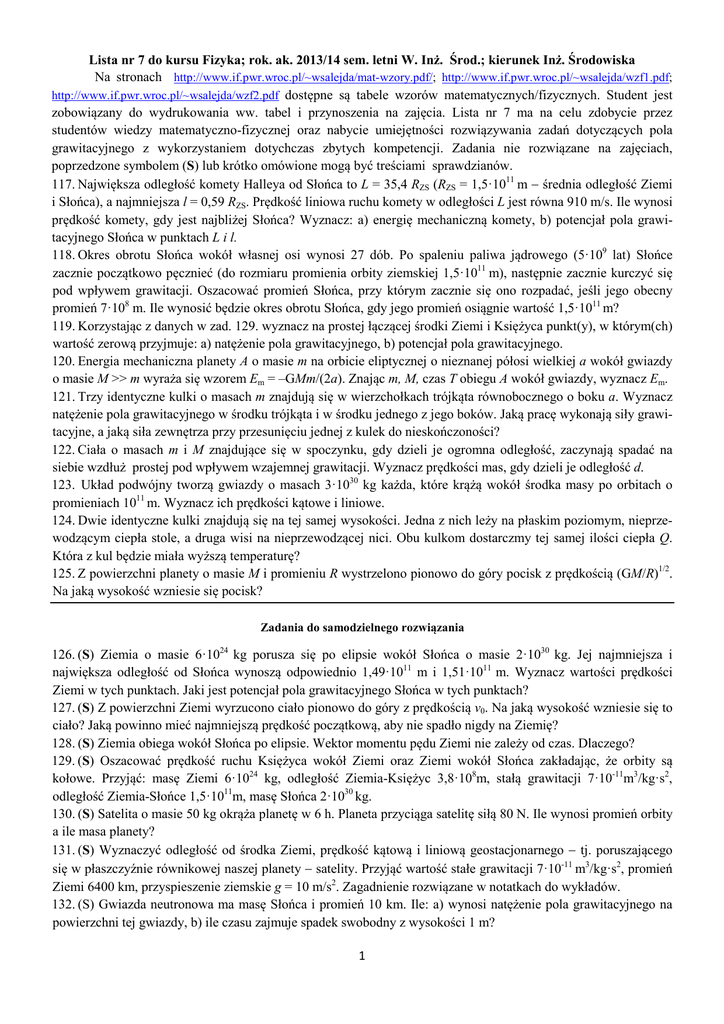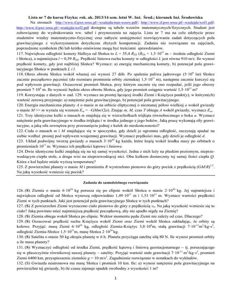 Lista nr 7 do kursu Fizyka; rok. ak. 2013/14 sem. letni W. Inż. Środ.; kierunek Inż. Środowiska Na stronach http://www.if.pwr.wroc.pl/~wsalejda/mat-wzory.pdf/; http://www.if.pwr.wroc.pl/~wsalejda/wzf1.pdf; http://www.if.pwr.wroc.pl/~wsalejda/wzf2.pdf dostępne są tabele wzorów matematycznych/fizycznych. Student jest zobowiązany do wydrukowania ww. tabel i przynoszenia na zajęcia. Lista nr 7 ma na celu zdobycie przez studentów wiedzy matematyczno-fizycznej oraz nabycie umiejętności rozwiązywania zadań dotyczących pola grawitacyjnego z wykorzystaniem dotychczas zbytych kompetencji. Zadania nie rozwiązane na zajęciach, poprzedzone symbolem (S) lub krótko omówione mogą być treściami sprawdzianów. 117. Największa odległość komety Halleya od Słońca to L = 35,4 RZS (RZS = 1,5·1011 m − średnia odległość Ziemi i Słońca), a najmniejsza l = 0,59 RZS. Prędkość liniowa ruchu komety w odległości L jest równa 910 m/s. Ile wynosi prędkość komety, gdy jest najbliżej Słońca? Wyznacz: a) energię mechaniczną komety, b) potencjał pola grawitacyjnego Słońca w punktach L i l. 118. Okres obrotu Słońca wokół własnej osi wynosi 27 dób. Po spaleniu paliwa jądrowego (5·109 lat) Słońce zacznie początkowo pęcznieć (do rozmiaru promienia orbity ziemskiej 1,5·1011 m), następnie zacznie kurczyć się pod wpływem grawitacji. Oszacować promień Słońca, przy którym zacznie się ono rozpadać, jeśli jego obecny promień 7·108 m. Ile wynosić będzie okres obrotu Słońca, gdy jego promień osiągnie wartość 1,5·1011 m? 119. Korzystając z danych w zad. 129. wyznacz na prostej łączącej środki Ziemi i Księżyca punkt(y), w którym(ch) wartość zerową przyjmuje: a) natężenie pola grawitacyjnego, b) potencjał pola grawitacyjnego. 120. Energia mechaniczna planety A o masie m na orbicie eliptycznej o nieznanej półosi wielkiej a wokół gwiazdy o masie M >> m wyraża się wzorem Em = –GMm/(2a). Znając m, M, czas T obiegu A wokół gwiazdy, wyznacz Em. 121. Trzy identyczne kulki o masach m znajdują się w wierzchołkach trójkąta równobocznego o boku a. Wyznacz natężenie pola grawitacyjnego w środku trójkąta i w środku jednego z jego boków. Jaką pracę wykonają siły grawitacyjne, a jaką siła zewnętrza przy przesunięciu jednej z kulek do nieskończoności? 122. Ciała o masach m i M znajdujące się w spoczynku, gdy dzieli je ogromna odległość, zaczynają spadać na siebie wzdłuż prostej pod wpływem wzajemnej grawitacji. Wyznacz prędkości mas, gdy dzieli je odległość d. 123. Układ podwójny tworzą gwiazdy o masach 3·1030 kg każda, które krążą wokół środka masy po orbitach o promieniach 1011 m. Wyznacz ich prędkości kątowe i liniowe. 124. Dwie identyczne kulki znajdują się na tej samej wysokości. Jedna z nich leży na płaskim poziomym, nieprzewodzącym ciepła stole, a druga wisi na nieprzewodzącej nici. Obu kulkom dostarczmy tej samej ilości ciepła Q. Która z kul będzie miała wyższą temperaturę? 125. Z powierzchni planety o masie M i promieniu R wystrzelono pionowo do góry pocisk z prędkością (GM/R)1/2. Na jaką wysokość wzniesie się pocisk? Zadania do samodzielnego rozwiązania 126. (S) Ziemia o masie 6·1024 kg porusza się po elipsie wokół Słońca o masie 2·1030 kg. Jej najmniejsza i największa odległość od Słońca wynoszą odpowiednio 1,49·1011 m i 1,51·1011 m. Wyznacz wartości prędkości Ziemi w tych punktach. Jaki jest potencjał pola grawitacyjnego Słońca w tych punktach? 127. (S) Z powierzchni Ziemi wyrzucono ciało pionowo do góry z prędkością v0. Na jaką wysokość wzniesie się to ciało? Jaką powinno mieć najmniejszą prędkość początkową, aby nie spadło nigdy na Ziemię? 128. (S) Ziemia obiega wokół Słońca po elipsie. Wektor momentu pędu Ziemi nie zależy od czas. Dlaczego? 129. (S) Oszacować prędkość ruchu Księżyca wokół Ziemi oraz Ziemi wokół Słońca zakładając, że orbity są kołowe. Przyjąć: masę Ziemi 6·1024 kg, odległość Ziemia-Księżyc 3,8·108m, stałą grawitacji 7·10-11m3/kg·s2, odległość Ziemia-Słońce 1,5·1011m, masę Słońca 2·1030 kg. 130. (S) Satelita o masie 50 kg okrąża planetę w 6 h. Planeta przyciąga satelitę siłą 80 N. Ile wynosi promień orbity a ile masa planety? 131. (S) Wyznaczyć odległość od środka Ziemi, prędkość kątową i liniową geostacjonarnego − tj. poruszającego się w płaszczyźnie równikowej naszej planety − satelity. Przyjąć wartość stałe grawitacji 7·10-11 m3/kg·s2, promień Ziemi 6400 km, przyspieszenie ziemskie g = 10 m/s2. Zagadnienie rozwiązane w notatkach do wykładów. 132. (S) Gwiazda neutronowa ma masę Słońca i promień 10 km. Ile: a) wynosi natężenie pola grawitacyjnego na powierzchni tej gwiazdy, b) ile czasu zajmuje spadek swobodny z wysokości 1 m? 1 133. (S) SOHO, to kosmiczna obserwatorium monitorujące non-stop Słońce (patrz Solar and Heliosferic Observatory Homepage http://sohowww.nascom.nasa.gov/) umieszczone w punkcie, gdzie równoważą się siły grawitacji Słońca i Ziemi. W jakiej odległości od Słońca orbituje SOHO? 134. (S) Oszacować promienie RCz.D Ziemi, Słońca i kuli o masie 55 kg, przy których stałyby się czarnymi dziurami? Ile ważyłoby ciało znajdujące się w odległości 2·RCz.D od takich obiektów? 135. (S) Wyznacz prędkości ucieczki dla: a) Słońca, b) białego karła (jedna z gwiazd układu potrójnego Syriusza) o masie Słońca i promieniu 107 m, c) gwiazdy neutronowej o masie Słońca i promieniu 104 m. 136. Obliczyć i porównać ze sobą siły oddziaływań grawitacyjnych: a) Ziemi i Księżyca; b) Słońca i Księżyca; c) Ziemi i Słońca. Masy: MZ = 6·1024 kg, MK = 7,4·1022 kg, MS = 2·1030 kg; odległości: d Z−K = 3,8·108m, d Z−S = 1,5·1011m; stała grawitacji G = 6,67 · 10−11=m3/(s2kg). 137. Ziemia o masie MZ = 6 · 1024 kg, porusza po elipsie się wokół Sło