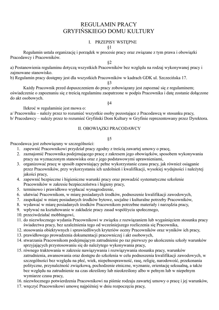 REGULAMIN PRACY GRYFIŃSKIEGO DOMU KULTURY I. PRZEPISY WSTĘPNE §1 Regulamin ustala organizację i porządek w procesie pracy oraz związane z tym prawa i obowiązki Pracodawcy i Pracowników. §2 a) Postanowienia regulaminu dotyczą wszystkich Pracowników bez względu na rodzaj wykonywanej pracy i zajmowane stanowisko. b) Regulamin pracy dostępny jest dla wszystkich Pracowników w kadrach GDK ul. Szczecińska 17. §3 Każdy Pracownik przed dopuszczeniem do pracy zobowiązany jest zapoznać się z regulaminem; oświadczenie o zapoznaniu się z treścią regulaminu zaopatrzone w podpis Pracownika i datę zostanie dołączone do akt osobowych. §4 Ilekroć w regulaminie jest mowa o: a/ Pracowniku – należy przez to rozumieć wszystkie osoby pozostające z Pracodawcą w stosunku pracy, b/ Pracodawcy – należy przez to rozumieć Gryfiński Dom Kultury w Gryfinie reprezentowany przez Dyrektora. II. OBOWIĄZKI PRACODAWCY §5 Pracodawca jest zobowiązany w szczególności: 1. zapewnić Pracownikowi przydział pracy zgodny z treścią zawartej umowy o pracę, 2. zaznajomić Pracownika podejmującego pracę z zakresem jego obowiązków, sposobem wykonywania pracy na wyznaczonym stanowisku oraz z jego podstawowymi uprawnieniami, 3. organizować pracę w sposób zapewniający pełne wykorzystanie czasu pracy, jak również osiąganie przez Pracowników, przy wykorzystaniu ich uzdolnień i kwalifikacji, wysokiej wydajności i należytej jakości pracy, 4. zapewnić bezpieczne i higieniczne warunki pracy oraz prowadzić systematyczne szkolenie Pracowników w zakresie bezpieczeństwa i higieny pracy, 5. terminowo i prawidłowo wypłacać wynagrodzenie, 6. ułatwiać Pracownikom, w miarę posiadanych środków, podnoszenie kwalifikacji zawodowych, 7. zaspokajać w miarę posiadanych środków bytowe, socjalne i kulturalne potrzeby Pracowników, 8. wydawać w miarę posiadanych środków Pracownikom potrzebne materiały i narzędzia pracy, 9. wpływać na kształtowanie w zakładzie pracy zasad współżycia społecznego, 10. przeciwdziałać mobbingowi, 11. do niezwłocznego wydania Pracownikowi w związku z rozwiązaniem lub wygaśnięciem stosunku pracy świadectwa pracy, bez uzależnienia tego od wcześniejszego rozliczenia się Pracownika, 12. stosowania obiektywnych i sprawiedliwych kryteriów oceny Pracowników oraz wyników ich pracy, 13. prawidłowego prowadzenia dokumentacji pracowniczej i akt osobowych, 14. stwarzania Pracownikom podejmującym zatrudnienie po raz pierwszy po ukończeniu szkoły warunków sprzyjających przystosowaniu się do należytego wykonywania pracy, 15. równego traktowania w zakresie nawiązywania i rozwiązywania stosunku pracy, warunków zatrudnienia, awansowania oraz dostępu do szkolenia w celu podnoszenia kwalifikacji zawodowych, w szczególności bez względu na płeć, wiek, niepełnosprawność, rasę, religię, narodowość, przekonania polityczne, przynależność związkową, pochodzenie etniczne, wyznanie, orientację seksualną, a także bez względu na zatrudnienie na czas określony lub nieokreślony albo w pełnym lub w niepełnym wymiarze czasu pracy, 16. niezwłocznego potwierdzenia Pracownikowi na piśmie rodzaju zawartej umowy o pracę i jej warunków, 17. wręczyć Pracownikowi umowę najpóźniej w dniu rozpoczęcia pracy, 18. poinformować każdego Pracownika nie później niż 7 dni od dnia zawarcia umowy o pracę o: - częstotliwości wypłaty wynagrodzenia za pracę, - systemie, rozkładzie i okresie rozliczeniowym czasu pracy, którymi objęty jest pracownik, - wymiarze i prawie do urlopu wypoczynkowego, do którego uprawniony jest pracownik, - długości okresu wypowiedzenia umowy o pracę. §6 Pracodawca ma prawo: – korzystania z wyników wykonywanej przez Pracowników pracy, – wydawania Pracownikom wiążących poleceń służbowych dotyczących pracy, które nie mogą być sprzeczne z przepisami prawa lub umową o pracę, – określania zakresu czynności Pracowników oraz ich egzekwowania. II. OBOWIĄZKI PRACOWNIKÓW §7 Podstawowym obowiązkiem Pracownika jest: 1/ rzetelnie i efektywnie wykonywać pracę, 2/ stosować się do poleceń przełożonych, które dotyczą pracy, jeżeli nie są one sprzeczne z przepisami prawa lub umową o pracę, 3/ przestrzegać czasu pracy ustalonego w GDK, 4/ przestrzegać regulaminu pracy i ustalonego w zakładzie porządku, 5/ przestrzegać przepisów i zasad bezpieczeństwa i higieny pracy oraz przepisów przeciwpożarowych, 6/ podnosić kwalifikacje zawodowe oraz doskonalić umiejętności pracy, 7/ dbać o dobro zakładu pracy i jego mienie, 8/ zachować w tajemnicy informacje, których ujawnienie mogłoby narazić pracodawcę na szkodę, 9/ przestrzegać tajemnicy określonej w odrębnych przepisach, 10/ przestrzegać w zakładzie zasad współżycia społecznego, 11/ dbać o czystość i porządek wokół swego stanowiska pracy, 12/ należycie zabezpieczyć po zakończeniu pracy sprzęt, narzędzia, urządzenia i pomieszczenia pracy, 13/ niezwłocznego zawiadamiania działu kadr o zmianach swoich danych osobowych oraz informacji znajdujących się w jego kwestionariuszu osobowym, a w szczególności o zmianach dotyczących: nazwiska, miejsca zamieszkania, stanu cywilnego, stanu rodzinnego warunkującego nabycie lub utratę prawa do pobierania świadczeń pracowniczych, posiadanego wykształcenia, stosunku do powszechnego obowiązku obrony, 14/ używanie środków pracy zgodnie z ich przeznaczeniem, wyłącznie do wykonywania zadań wynikających ze stosunku pracy. §8 Wnoszenie i spożywanie w siedzibie Pracodawcy i w miejscu świadczenia pracy napojów alkoholowych i innych środków odurzających, przystępowania do pracy po ich spożyciu i przebywania w pracy po ich spożyciu jest zabronione. §9 Zabrania się Pracownikom: 1/ opuszczania stanowiska pracy w czasie pracy bez wyraźnej zgody przełożonego, 2/ operowania sprzętem, maszynami i urządzeniami, jeśli prace nie są związa