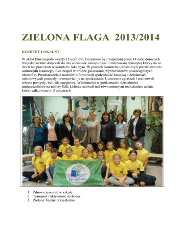 ZIELONA FLAGA 2013/2014 KOMITET LOKALNY W skład Eko-zespołu weszło 15 uczniów. Uczniowie byli wspierani przez 14 osób dorosłych. Niejednokrotnie dołączali do nas uczniowie zainspirowani realizowaną tematyką którzy na co dzień nie pracowali w komitecie lokalnym. W pracach Komitetu uczestniczyli przedstawiciele samorządu lokalnego. Eko-zespół w drodze glosowania wybrał liderów poszczególnych obszarów. Przedstawiciele uczniów informowali społeczność klasową o działaniach, odnotowywali pomysły, przestawiali je na spotkaniach. Uczniowie zgłaszali i realizowali własne pomysły, byli siłą napędową. Wiadomości o spotkaniach i działalności umieszczaliśmy na tablicy SdE, Liderzy czuwali nad równomiernym rozłożeniem zadań, które realizowano w 3 obszarach 1. Zdrowa żywność w szkole 2. Transport i aktywność ruchowa. 3. Zielone Tereny przyszkolne OPIS DZIAŁAŃ ZDROWA ŻYWNOŚĆ W SZKOLE W zakresie zdrowego żywienia uczniowie klas 1-3 uczestniczyli w ogólnopolskiej akcji Szklanka mleka oraz Owoce i warzywa w szkole. W listopadzie 2013 r. , dzieci z oddziałów przedszkolnych przyłączyły się do ogólnopolskiej akcji Śniadanie daje moc, która miała na celu zwiększenie świadomości dzieci w zakresie spożywania śniadania przed wyjściem do szkoły. Uczniowie klas: 2, 3 , 4 i 5 uczestniczyli w ogólnopolskiej akcji Mam kota na punkcie mleka. W szkole powstały mleczne drużyny, które wzięły udział w kampanii na rzecz spożywania produktów mlecznych. Pozyskane od organizatora ulotki promocyjne wykorzystano podczas zajęć, jak również do akcji informacyjnej w środowisku domowym dzieci. Klasa II c realizowała roczny autorski projekt Dzieciaki do rondla, w ramach którego dzieci zgłębiały tajniki sztuki kulinarnej w zakresie pieczenia ciast, ciasteczek i zapiekanek. W październiku zaprezentowały swoje umiejętności podczas Regionalnego Święta Miodu w Ełckim Centrum Kultury. Od marca do czerwca uczniowie wzięli udział w szkolnym projekcie Soki z warzyw i owoców, przygotowując samodzielnie na stołówce szkolnej soki. Na wniosek uczniów zmieniono desery w stołówce szkolnej, słodycze zamieniono na soki i owoce. REGIONALNA KONFERENCJA Chemia na stole i Siedem kroków do Zielonej Flagi. W lutym, zorganizowaliśmy regionalną konferencji, której uczestniczyli nauczyciele liderzy zajmujący się tematyką zdrowego żywienia z sześciu powiatów: ełckiego, oleckiego, piskiego, giżyckiego, gołdapskiego, węgorzewskiego. W konferencji uczestniczyli również przedstawiciele uczniów. W trakcie praktycznych działań uczestnicy identyfikowali zdrową żywność, wykrywali związki chemiczne w składnikach pokarmowych. ZIELONY TYDZIEŃ W trakcie Zielonego Tygodnia dzieci z klas 0-III zajmowały się zagadnieniami zdrowej żywności i zdrowego stylu życia. Uczniowie mieli okazję przygotowywania drugiego śniadania w szkole, poznawali zasady kulturalnego spożywania posiłków. Z inicjatywy zespołu zarządzającego zadaniami Zielonej Flagi w sklepiku szkolny zaczęła się sprzedaż owoców i zapiekanek, zmienia się świadomość w zakresie spożywania słodyczy. SZKOLNE KONKURSY Od marca do czerwca zostały zorganizowane dwa szkolne konkursy. Pierwszy konkurs dotyczył prezentacji zdrowych posiłków, pomysły na ich przygotowanie zostały zaczerpnięte z tradycji świąt Wielkanocnych lub książki Weroniki Smaki dzieciństwa. Drugi miał na celu organizowanie Zielonych ogródków na parapetach szkolnych klasopracowni. Wyhodowane warzywa wykorzystywano do przygotowywania posiłków w szkole. Powyższe działania sprzyjały uczniowskiej kreatywności, mobilizowały klasowe zespoły do współpracy z rodzicami, a co najważniejsze zachęcały społeczność szkolną do podejmowania ciekawych niekonwencjonalnych inicjatyw w zakresie zdrowego żywienia. TRANSPORT I AKTYWNOŚĆ RUCHOWA Działania związane z transportem i aktywnością ruchową przebiegały pod znakiem Szkoły w ruchu-ogólnopolskiego programu MEN i wpisywały się w realizację programu Zielonej Flagi. I tak, w Europejskim Tygodniu Mobilności w ramach Mazurskiej Eko Ligi nasi uczniowie zgłębiali wiedzę na temat poruszania się rowerem realizując projekt Czyste powietrze – to twój ruch, zajmując drugie miejsce. Zaznaczyliśmy swoją obecność podczas miejskiego biegu Niepodległości. Zorganizowaliśmy eliminacje piłki nożnej o Puchar Premiera. Uczniowski Klub Sportowy uczestniczył po raz czwartych w rozgrywkach piłki siatkowej podczas międzynarodowych rozgrywek Polski, Bośni, Hercegowiny, Portugalii i Litwy. Z inicjatywy Eko-zespołu wszyscy uczniowie mieli możliwość spędzać długie przerwy na świeżym powietrzu, ustalony harmonogram umożliwiał wszystkim uczniom dostęp do obiektów sportowych. Współpraca z ełckimi wioślarzami zaowocowała zajęciami, które umożliwiły uczniom posiąść wiedzę w zakresie tego sportu, jak również rozpocząć systematyczne treningi w Międzyszkolnym Ośrodku Sportowym. Chętni rodzice i uczniowie Szkolnego Koła rowerowego w sezonie jesiennym i wiosennym wytyczali mapę wycieczek zwiedzając ościenne okolice miasta. Uczniowie uczestniczyli w mistrzostwach szkół podstawowych w pływaniu plasując się we wszystkich kategoriach na czołowych miejscach, zajmując 4 miejsce w Mistrzostwach Województwa. W ciągu całego roku uczniowie klas 5-6 uczestniczyli w towarzyskich turniejach piłki siatkowej i nożnej. Uczniom klasy 3 stworzono możliwości nauki gry w piłkę siatkową w ramach projektu edukacyjnego Nasze pasje. ESC...po raz 13 zorganizowaliśmy w grudniu kampanię przemocy stop nie zamykaj oczu w tym roku pod hasłem spędzania wolnego czasu jako alternatywy dla komputera. Podczas ferii zimowych 37 uczniów, uczestniczyło w grach , zabawach sportowych na hali sportowej i świeżym powietrzu. Wychowawczyni klasy 6 c zorganizowała swoim uczniom zajęcia na miejskim lodowisku. Uwieńczeniem nas