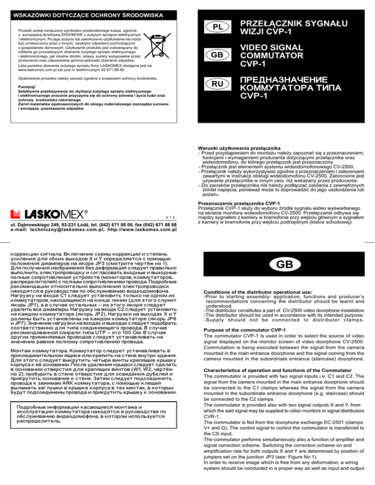WSKAZÓWKI DOTYCZ¥CE OCHRONY RODOWISKA Produkt zosta³ oznaczony symbolem przekrelonego kosza, zgodnie z europejsk¹ dyrektyw¹ 2002/96/WE o zu¿ytym sprzêcie elektrycznym i elektronicznym. Po jego zu¿yciu lub zakoñczeniu u¿ytkowania nie mo¿e byæ umieszczony wraz z innymi, zwyk³ymi odpadami pochodz¹cymi z gospodarstw domowych. U¿ytkownik produktu jest zobowi¹zany do oddania go prowadz¹cym zbieranie zu¿ytego sprzêtu elektrycznego i elektronicznego, jak lokalne zbiórki, sklepy, punkty wytypowane przez producenta oraz odpowiednie gminne jednostki zbierania odpadów. Lista punktów zbierania zu¿ytego sprzêtu firmy LASKOMEX dostêpna jest na www.laskomex.com.pl lub pod nr telefonicznym 42 671 88 68. Opakowanie produktu nale¿y usuwaæ zgodnie z przepisami ochrony rodowiska. Pamiêtaj! Selektywne przekazywanie do utylizacji zu¿ytego sprzêtu elektrycznego i elektronicznego znacznie przyczynia siê do ochrony zdrowia i ¿ycia ludzi oraz ochrony rodowiska naturalnego. Zwrot materia³ów opakowaniowych do obiegu materia³owego oszczêdza surowce i zmniejsza powstawanie odpadów. PL PRZE£¥CZNIK SYGNA£U WIZJI CVP-1 GB VIDEO SIGNAL COMMUTATOR CVP-1 RU ÏÐÅÄÍÀÇÍÀ×ÅÍÈÅ ÊÎÌÌÓÒÀÒÎÐÀ ÒÈÏÀ CVP-1 Warunki u¿ytkowania prze³¹cznika - Przed przyst¹pieniem do monta¿u nale¿y zapoznaæ siê z przeznaczeniem, funkcjami i wymaganiami producenta dotycz¹cymi prze³¹cznika oraz wideodomofonu, do którego prze³¹cznik jest przeznaczony. - Prze³¹cznik jest elementem systemu wideodomofonowego CV-2500. - Prze³¹cznik nale¿y wykorzystywaæ zgodnie z przeznaczeniem i zaleceniami zawartymi w instrukcji obs³ugi wideodomofonu CV-2500. Zabronione jest u¿ywanie prze³¹cznika w innym celu, ni¿ wskazany przez producenta. - Do zacisków prze³¹cznika nie nale¿y pod³¹czaæ zasilania z zewnêtrznych róde³ napiêcia, poniewa¿ mo¿e to doprowadziæ do jego uszkodzenia lub po¿aru. V 1.3 ul. D¹browskiego 249, 93-231 £ód, tel. (042) 671 88 00, fax (042) 671 88 88 e-mail: [email protected], http://www.laskomex.com.pl êîððåêöèè ñèãíàëà. Âêëþ÷åíèå ñõåìû êîððåêöèè è ñòåïåíü óñèëåíèÿ äëÿ îáîèõ âûõîäîâ X è Y îïðåäåëÿåòñÿ ñ ïîìîùüþ ïîëîæåíèÿ äæàìïåðîâ íà ÿêîðå JP3 (ñìîòðèòå ÷åðò¸æ íî 1). Äëÿ ïîëó÷åíèÿ èçîáðàæåíèÿ áåç äåôîðìàöèé ñëåäóåò ïðàâèëüíî âûïîëíèòü ýëåêòðîïðîâîäêó è ñîãëàñîâàòü âõîäíûå è âûõîäíûå ïîëíûå ñîïðîòèâëåíèÿ óñòðîéñòâ (ìîíèòîðîâ, êîììóòàòîðîâ, ðàñïðåäåëèòåëåé) ñ ïîëíûì ñîïðîòèâëåíèåì ïðîâîäà. Ïîäðîáíûå ðåêîìåíäàöèè îòíîñèòåëüíî âûïîëíåíèÿ ýëåêòðîïðîâîäêè íàõîäÿòñÿ â ðóêîâîäñòâå ïî îáñëóæèâàíèþ âèäåîäîìîôîíà. Íàãðóçêó íà âõîäå Ñ1 ñëåäóåò óñòàíîâèòü òîëüêî íà îäíîì èç êîììóòàòîðîâ, íàõîäÿùåìñÿ íà êîíöå ëèíèè (äëÿ ýòîãî ñëóæèò ÿêîðü JP1), à â ñëó÷àå îñòàëüíûõ èç ýòîãî ÿêîðÿ ñëåäóåò óäàëèòü âñå äæàìïåðû. Íàãðóçêó íà âõîäå Ñ2 ñëåäóåò óñòàíîâèòü íà êàæäîì êîììóòàòîðå (ÿêîðü JP2). Íàãðóçêè íà âûõîäàõ X è Y äîëæíû áûòü óñòàíîâëåíû íà êàæäîì êîììóòàòîðå (ÿêîðü JP6 è JP7). Çíà÷åíèå íàãðóçêè íà âõîäàõ è âûõîäàõ ñëåäóåò ïîäîáðàòü ñîîòâåòñòâåííî äëÿ òèïà ñîåäèíÿþùåãî ïðîâîäà.  ñëó÷àå ðåêîìåíäîâàííîé ñïèðàëè òèïà UTP ýòî 100 Îì.  ñëó÷àå äðóãèõ ïðèìåíÿåìûõ ïðîâîäîâ ñëåäóåò óñòàíàâëèâàòü íà çíà÷åíèå ðàâíîå ïîëíîìó ñîïðîòèâëåíèþ ïðîâîäà. Ìîíòàæ êîììóòàòîðà. Êîììóòàòîð ñëåäóåò óñòàíàâëèâàòü â ïðèñîåäèíèòåëüíîì ÿùèêå èëè êðåïèòü íà ñòåíå âíóòðè çäàíèÿ. Äëÿ ýòîãî ñëåäóåò âûêðóòèòü ÷åòûðå âèíòû êðåïÿùèå êðûøêó êîðïóñà ê å¸ îñíîâàíèè. Ïîñëå óäàëåíèÿ êðûøêè ñëåäóåò ñäåëàòü â îñíîâàíèè îòâåðñòèÿ äëÿ êðåïÿùèõ âèíòîâ (W1, W2, ÷åðò¸æ íî 2), ïðîáóðèòü â ñòåíå îòâåðñòèÿ äëÿ îñàæäåíèÿ äóáåëåé è ïðèêðóòèòü îñíîâàíèå ê ñòåíå. Çàòåì ñëåäóåò ïîäñîåäèíèòü ïðîâîäà ê çàæèìàì ARK êîììóòàòîðà, ñ ïîìîùüþ êëåùåé âûëàìàòü çàãëóøêè â êðûøêå êîðïóñà â òåõ ìåñòàõ, â êîòîðûõ áóäóò ïîäñîåäèíåíû ïðîâîäà è ïðèêðóòèòü êðûøêó ê îñíîâàíèè. Ïîäðîáíûå èíôîðìàöèè êàñàþùèåñÿ ìîíòàæà è ýêñïëóàòàöèè êîììóòàòîðà íàõîäÿòñÿ â ðóêîâîäñòâå ïî îáñëóæèâàíèþ âèäåîäîìîôîíà, â êîòîðîì èñïîëüçóåòñÿ ðàñïðåäåëèòåëü. Przeznaczenie prze³¹cznika CVP-1 Prze³¹cznik CVP-1 s³u¿y do wyboru ród³a sygna³u wideo wywietlanego na ekranie monitora wideodomofonu CV-2500. Prze³¹czanie odbywa siê miêdzy sygna³em z kamery w bramofonie przy wejciu g³ównym a sygna³em z kamery w bramofonie przy wejciu podrzêdnym (klatce schodowej). GB Conditions of the distributor operational use: -Prior to starting assembly- application, functions and producers recommendations concerning the distributor should be learnt an