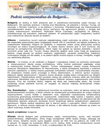 Bułgaria ze stolicą w Sofii położona jest w południowo-wschodniej części Europy, na Bałkanach. Od zachodu graniczy z Serbią oraz Macedonią, od południa z Grecją i Turcją, od wschodu z Morzem Czarnym, a od północy z Rumunią. Charakteryzuje się zróżnicowanym ukształtowaniem terenu. Z jednej strony zachwyca nas ogromnymi górami, z drugiej zaś urzeka malowniczymi równinami. Wybrzeże Morza Czarnego, szczególnie na północy, charakteryzuje się szerokimi, pięknymi plażami. W południowej części znajdziemy wydmy oraz malownicze zatoczki skryte za skałami. Albena – malowniczy kurort zajmuje najpiękniejszą część wybrzeża na północ od Warny. Na wspaniałej piaszczystej plaży osiągającej nawet 100 m szerokości nie będzie problemu ze znalezieniem idealnego miejsca do opalania, a wspaniały widok umilą piaszczyste wydmy chroniące od wiatru wypoczywających. W czasie sezonu tłoczno jest w tym kurorcie, ale sprzyja to sympatycznej atmosferze, która nigdy nie gaśnie za sprawą dyskotek i tawern czynnych przez całą noc. Turyści chcący aktywnie spędzić swój urlop mają do dyspozycji baseny, mogą pływać na nartach wodnych, żaglówkach, uprawiać windsurfing, miłośnicy nurkowania znajdą coś dla siebie, a na stałym lądzie można pograć w tenisa, minigolfa, kręgle czy siatkówkę plażową. Warna – to trzecie, co do wielkości w Bułgarii i największe miasto na wybrzeżu zachowało w nienaruszonym stanie swoją architekturę, którą można podziwiać spędzając urlop w malowniczej krainie Złotych Piasków. Turyści odwiedzający miasto muszą koniecznie zobaczyć Mauzoleum Władysława III Warneńczyka, a także przepiękną starówkę z wieloma cennymi zabytkami, w której można podziwiać ormiańskie cerkwie i muzułmańskie meczety. Po zwiedzeniu miasta warto przysiąść w Parku Nadmorskim, w którym oprócz muzeów, pięknych alejek spacerowych i kawiarni liczne atrakcje znajdą dzieci wymęczone po długich wędrówkach. Popularnością wśród turystów cieszą się cykliczne imprezy takie jak chociażby czerwcowe Wareńskie Lato czy Międzynarodowy Festiwal Jazzowy organizowany pod koniec sierpnia. Przy tej morskiej stolicy ciągnie się długi pas piaszczystej plaży, ale turyści wybierają raczej pobliskie kurorty ze względu na jeszcze większą atrakcyjność miejsc kąpielowych. Św. Konstantyn – jeden z najstarszych kurortów na wybrzeżu, który od dawna cieszył się zainteresowaniem turystów, a teraz uchodzi za rewelacyjnie przystosowane do urlopu miejsce wypoczynkowe. Liczne hotele z basenami oraz wspaniale rozbudowaną infrastrukturą turystyczną gwarantują komfortowy wypoczynek. Zadowoleni będą rodzice z dziećmi, gdyż piaszczyste plaże idealnie nadają się do rodzinnego wypoczynku, atrakcji nie zabraknie też dla miłośników sportów wodnych, ponieważ kurort dysponuje dobrze zaopatrzonym zapleczem sportowym. Piękna okolica zatopiona jest w starym parku z cyprysami, liliami i drzewkami figowymi, w którym można odpocząć od słońca, a dla odbycia kurażu zalecane są znane na całym wybrzeżu źródła mineralne. Język urzędowy: bułgarski Klimat: Klimat Bułgarii jest umiarkowany ciepły, kontynentalny, suchy, nad morzem podzwrotnikowy, wilgotniejszy. Zimą mogą występować obfite opady śniegu, zdarzają się silne mrozy. Średnia roczna suma opadów wynosi od 450 mm na północy do 1200 mm w górach. W leżącej na wysokości 550m n.p.m. stolicy, Sofii, średnia temperatura roczna wynosi ok. 11, 4 0C, minimalna -7, 8 0C, a maksymalna 39, 8 0C. Waluta: Obowiązującą walutą używaną w Bułgarii jest lew, (1 BGN = 100 stotinek). Kurs lewa w stosunku do euro jest stały i wynosi 1 EUR =1, 9558 BGN. Wymieniając walutę w kantorach, należy zachować szczególną ostrożność, gdyż częste są przypadki wypłacania kwot niższych, niż to wynika z podanego przed kantorami kursu (najlepiej uprzednio zapytać, jaką sumę otrzyma się za określoną kwotę w walucie). Niektóre kantory i banki w dużych miastach wymieniają również złotówki. Za wymianę walut kantory pobierają niekiedy prowizję. Na terenie Bułgarii działa kilkaset punktów Western Union, MoneyGram, za których pośrednictwem możliwe jest błyskawiczne przekazanie pieniędzy z Polski. Funkcjonują bankomaty dla posiadaczy kart Visa, Maestro, MasterCard itp. Religia: Większość mieszkańców Bułgarii (82 proc.) samookreśla się, jako wyznawcy prawosławia. Pozostali to: muzułmanie (ok. 12 proc. – gł. Turcy i Pomacy), katolicy ·(0, 6 proc.) i protestanci(0, 5 proc.). Kuchnia: Bułgarska kuchnia ma swoje tradycje zakorzenione w starożytności i można w niej zauważyć podobieństwa z kuchnią grecką, macedońską czy turecką, stąd tak wiele wspaniałych potraw na bułgarskich stołach. Smaku dodaje fakt, że Bułgarzy czerpiąc z tatarskich tradycji posługują się w przyrządzaniu jedzenia glinianymi naczyniami, które powoli ogrzewają potrawy nadając im niezwykłego smaku i aromatu. Dania mączne nie występują zbyt często, gotowanie ciasta nie należy też do tradycji, a główne potrawy nie mają słodkiego smaku. Prawie do wszystkich dań podawany jest chleb, do tradycji należy łamanie go i układanie na serwetce, a nie trzymanie w ręku. Kelnerzy mają w zwyczaju pytać o ilość chleba czy bułek podawanych do obiadu, ale płaci się za nie osobno. Czas: W Bułgarii obowiązuje czas wschodnioeuropejski, czyli w stosunku do czasu Greenwich i godzinę późniejszy niż w Polsce. 2 godziny późniejszy Kilka praktycznych informacji: Przepisy wjazdowe: Obywatele polscy korzystają z prawa do swobodnego przepływu osób w ramach Unii Europejskiej/Europejskiego Obszaru Gospodarczego. Od 1 stycznia 2007 r. obywatele polscy mogą wjeżdżać i przebywać na terytorium Republiki Bułgarii przez 90 dni w ciągu 6 miesięcy, licząc od dnia pierwszego wjazdu, oraz przejeżdżać tranzytem przez terytor