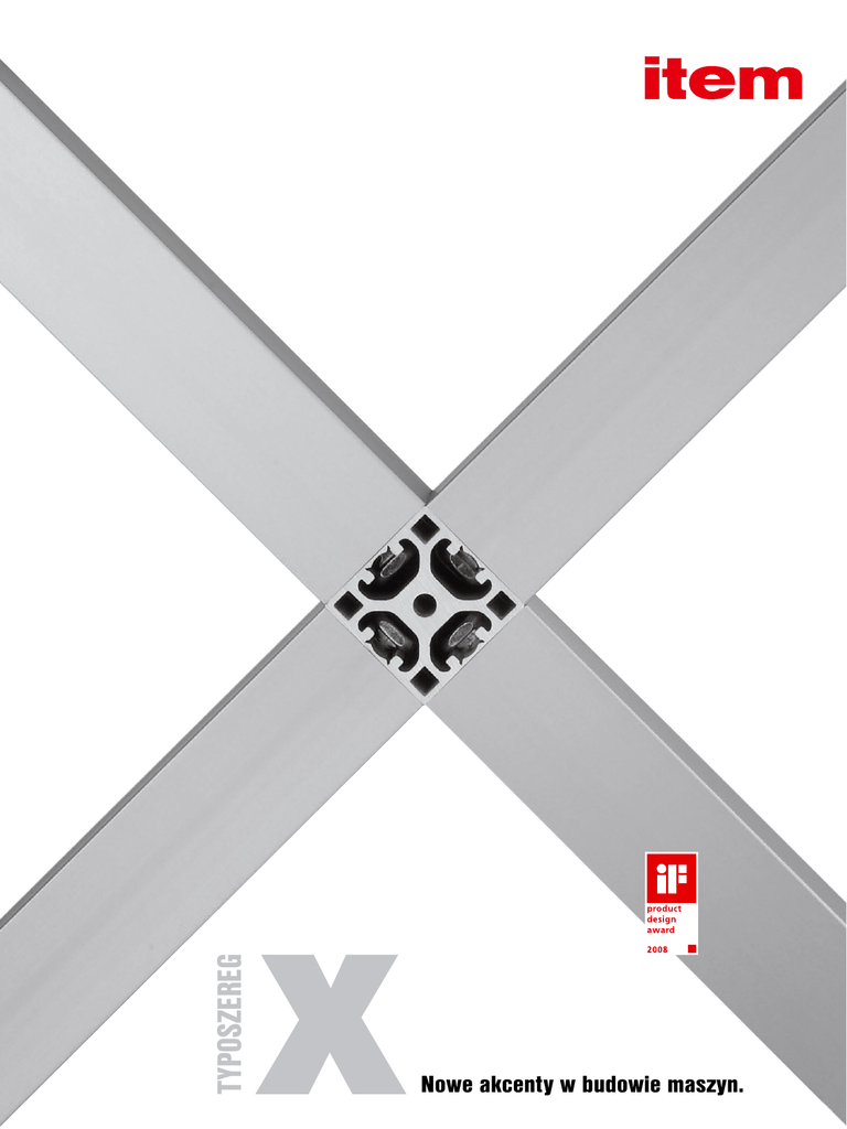 Typoszereg X Nowe akcenty w budowie maszyn. Typoszereg X Nowy design. Maksymalna funkcjonalność. Nowoczesna forma. Forma i funkcja. Nowy typoszereg X – trochę inny system profili. Nowy design charakteryzuje profile zamknięte o idealnie płaskich powierzchniach bocznych. Najmniejszy z możliwych promień krawędzi umożliwia gładkie połączenie profili bez widocznych przejść: maksymalna funkcjonalność i precyzyjnie wykonane kontury, brak wystających krawędzi. Nowy a jednak sprawdzony – uniwersalny rowek profilu 8 we wszystkich profilach X 8 gwarantuje pełną kompatybilność z systemem modułowym MB. Wszystkie wielkości przekroju poprzecznego profili typoszeregu X są dostępne również w wersji z zakrytymi rowkami. W razie potrzeby zaślepienie rowka może zostać usunięte: dzięki temu w dowolnym miejscu powstaje możliwość uniwersalnego połączenia. Na pozostałym odcinku profila pozostaje aksamitny połysk anodowanej powierzchni aluminiowej. 2 X wyznacza kierunki. Nowe akcenty w nowoczesnym sposobie budowy maszyn – kontur X profili i komponentów systemu modułowego item MB. X wyznacza linię stylistyczną, będącą uzupełnieniem dotychczasowych wersji. W koncepcji typoszeregu X mocniej niż kiedykolwiek wcześniej został położony nacisk na nadanie jednolitego kształtu wszystkim elementom konstrukcyjnym. 3 Typoszereg X Konsekwentna rzeczowość. Wyraźne prowadzenie linii. Wzorcowy wygląd. eXtra od item. Elementy konstrukcyjne X – konsekwentna rzeczowość i wyraźne prowadzenie linii. Koncentracja na najistotniejszym elemencie – procesie. W większym stopniu zostaje uwydatniony indywidualny sposób wykonania konstrukcji, a zarazem podkreślona wysoka jakość maszyny. Dyskretne szare elementy dodatkowe idealnie dostosowują się do wytyczonego kierunku. Kształty o wyraźnych, zdecydowanych liniach znajdują odzwierciedlenie w detalach tworząc konstrukcję harmonijnej całości. Praktyczna zaleta wyraźnie poprowadzonej lini: Praktyczna zaleta wyraźnie poprowadzonej lini: konstrukcje profilowe systemu modułowego X znajdują szczególne zastosowanie w rozwiązaniach przemysłowych o wysokich wymaganiach dotyczących utrzymania czystości np. pomieszczenia czyste. Korzyść stosowania zamkniętej formy: brud nie ma żadnych szans, aby wedrzeć się do szczeliny. Zamknięte rowki zapobiegają odkładaniu się cząsteczek. ∙ budowa maszyn i urządzeń ∙ konstrukcje ochronne ∙ produkty stosowane w pomieszczeniach czystych ∙ ściany działowe Konsekwentnie systematyczny. System modułowy X przekonuje funkcjonalną jakością. Modułowy system o określonej podziałce umożliwia szybką i elastyczną budowę nośnych, a zarazem zamkniętych struktur. 4 Innowacyjny system modułowy nadaje każdej konstrukcji wzorcowy wygląd – dopracowana technika połączona została z wyrafinowanym kształtem. 5 Nowości 04/2007 1 Elementy podstawowe X Profile Akcesoria profili Technika połączeń Elementy podstawowe Nowości 04/2007 Profile X 8 lekkie Elementy podstawowe Profile typoszeregu X 8 są lekkimi profilami o przekroju poprzecznym od 40x40 do 80x80 mm. Rowki profili 8 są otwarte lub ukryte pod licującą, gładką powierzchnią boczną. W przypadku konieczności użycia elementów łączących lub też mocowania dodatkowych elementów konstrukcyjnych możliwe jest łatwe otworzenie i usunięcie zaślepienia rowka. Ostre krawędzie zewnętrzne profilu prowadzą do szczególnie gładkiego przejścia połączeń profili. Usunięcie zaślepienia rowka: Zaleca się ustalenie początkowej i końcowej pozycji odcinka otwartego poprzez wykonanie otworu o średnicy 9,2 mm. Następnie zaślepienie może zostać usunięte poprzez lekkie podważenie śrubokrętem. Krawędzie po usunięciu zaślepienia powinny zostać ogradowane. Otwór umożliwia osadzenie wpustów przesuwnych oraz innych elementów mocujących w rowku profilu (patrz katalog główny systemu modułowego MB Rozdz. 3). Mocowanie elementu konstrukcyjnego powoduje zakrycie otwartego wcześniej odcinka rowka. Profil X 8 40x40 lekki Al, anodowany A= 6,61cm2 Ix = 9,47cm4 Iy = It = 1,12 cm4 m= 1,78kg/m Wx= 4,73cm3 Wy= kolor naturalny, przycięcie max. 6000 mm 9,47cm4 4,73cm3 Profil X 8 40x40 4N lekki Al, anodowany możliwe usunięcie zaślepienia rowka A= 6,90cm2 Ix = 10,03cm4 Iy = 10,03cm4 It = 1,12 cm4 m= 1,86kg/m Wx= 5,01cm3 Wy= 5,01cm3 kolor naturalny, przycięcie max. 6000 mm 0.0.492.91 0.0.492.88 7 Nowości 04/2007 8 Elementy podstawowe Profil X 8 80x40 lekki Al, anodowany A= 11,46cm2 Ix = 17,18 cm4 Iy = 71,65cm4 It = 10,05cm4 m= 3,09kg/m Wx= 8,59cm3 Wy= 17,91cm3 kolor naturalny, przycięcie max. 6000 mm 0.0.492.94 Profil X 8 80x40 6N lekki Al, anodowany możliwe usunięcie zaślepienia rowka A= 11,89cm2 Ix = 18,30cm4 Iy = 75,12 cm4 It = 10,05cm4 m= 3,21kg/m Wx= 9,15 cm3 Wy= 18,78cm3 kolor naturalny, przycięcie max. 6000 mm 0.0.493.01 Profil X 8 80x80 lekki Al, anodowany A= 19,37cm2 Ix = 132,82cm4 Iy = 132,82cm4 It = 82,91cm4 m= 5,23kg/m Wx= 33,20cm3 Wy= 33,20cm3 kolor naturalny, przycięcie max. 6000 mm 0.0.492.97 Profil X 8 80x80 8N lekki Al, anodowany możliwe usunięcie zaślepienia rowka A= 19,96cm2 Ix = 138,57cm4 Iy = 138,57cm4 It = 82,91cm4 m= 5,39kg/m Wx= 34,64cm3 Wy= 34,64cm3 kolor naturalny, przycięcie max. 6000 mm 0.0.493.04 Nowości 04/2007 Zaślepki Profile X 8 Elementy podstawowe Zaślepki zamykają powierzchnię czołową profili X 8. Mocowanie następuje poprzez wcisk w centralny otwór profilu. Nie jest wymagane gradowanie powierzchni przycinanej. Płaskie zaślepki w stonowanym, szarym kolorze uzupełniają – harmonizując z konturem profilu– nowy kształt profilu X. Profile maskujące Zaślepka X 8 40x40 PA-GF m = 5,0 g kolor szary zbliż. do RAL 7042, 1 sztuka 0.0.489.60 Zaślepka X 8 80x40 PA-GF m = 8,0 g kolor szary zbliż. do RAL 7042, 1 sztuka 0.0.489.61 Zaślepka X 8 80x80 PA-GF m = 16,0 g kolor szary zbliż. do RAL 7042, 1 sztuka 0.0.489.98 Profile X 8 dostępne