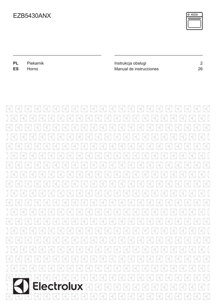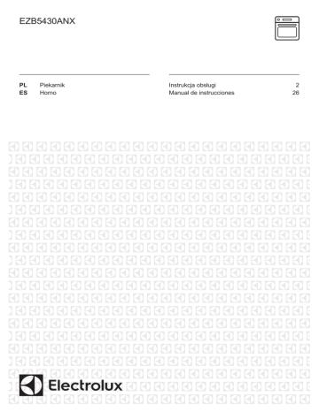 EZB5430ANX PL ES Piekarnik Horno Instrukcja obsługi Manual de instrucciones 2 26 2 www.electrolux.com SPIS TREŚCI 1. INFORMACJE DOTYCZĄCE BEZPIECZEŃSTWA........................................... 3 2. WSKAZÓWKI DOTYCZĄCE BEZPIECZEŃSTWA............................................ 4 3. OPIS URZĄDZENIA........................................................................................... 7 4. PRZED PIERWSZYM UŻYCIEM........................................................................7 5. CODZIENNA EKSPLOATACJA......................................................................... 8 6. FUNKCJE ZEGARA......................................................................................... 10 7. KORZYSTANIE Z AKCESORIÓW................................................................... 11 8. DODATKOWE FUNKCJE.................................................................................12 9. WSKAZÓWKI I PORADY................................................................................. 13 10. KONSERWACJA I CZYSZCZENIE................................................................ 18 11. ROZWIĄZYWANIE PROBLEMÓW................................................................ 22 12. INSTALACJA.................................................................................................. 23 13. EFEKTYWNOŚĆ ENERGETYCZNA............................................................. 24 Z MYŚLĄ O TOBIE Dziękujemy za zakup urządzenia Electrolux. Jest ono owocem dziesięcioleci doświadczeń i innowacji. To pomysłowe i stylowe urządzenie zostało zaprojektowane z myślą o Tobie. Użytkując je, możesz mieć zawsze pewność uzyskania wspaniałych efektów. Witamy w świecie marki Electrolux! Zapraszamy na naszą witrynę internetową, aby: Otrzymać wskazówki dotyczące użytkowania, broszury, pomoc w rozwiązywaniu problemów oraz informacje dotyczące serwisu: www.electrolux.com/webselfservice Zarejestrować swój produkt i uprościć jego obsługę serwisową: www.registerelectrolux.com Nabyć akcesoria, materiały eksploatacyjne i oryginalne części zamienne do swojego urządzenia: www.electrolux.com/shop OBSŁUGA KLIENTA Zalecamy stosowanie oryginalnych części zamiennych. Kontaktując się z autoryzowanym centrum serwisowym, należy przygotować poniższe dane: model, numer produktu, numer seryjny. Stosowne informacje można znaleźć na tabliczce znamionowej. Ostrzeżenie / Przestroga – Informacje dotyczące bezpieczeństwa Ogólne informacje i wskazówki Informacje dotyczące środowiska naturalnego Producent zastrzega sobie możliwość wprowadzenia zmian bez wcześniejszego powiadomienia. POLSKI 1. 3 INFORMACJE DOTYCZĄCE BEZPIECZEŃSTWA Przed przystąpieniem do instalacji i rozpoczęciem eksploatacji urządzenia należy uważnie zapoznać się z załączoną instrukcją obsługi. Producent nie odpowiada za obrażenia ciała ani szkody spowodowane nieprawidłową instalacją lub eksploatacją urządzenia. Należy zachować instrukcję obsługi w bezpiecznym i łatwo dostępnym miejscu do wykorzystania w przyszłości. 1.1 Bezpieczeństwo dzieci i osób o ograniczonych zdolnościach ruchowych, sensorycznych lub umysłowych • • • • • • • Urządzenie mogą obsługiwać dzieci po ukończeniu ósmego roku życia oraz osoby niepełnosprawne, jeśli będą one nadzorowane lub zostaną poinstruowane w zakresie bezpiecznego korzystania z urządzenia i będą świadome związanych z tym zagrożeń. Nie należy pozwalać, aby dzieci bawiły się urządzeniem. Przechowywać opakowanie w miejscu niedostępnym dla dzieci lub pozbyć się go w odpowiedni sposób. Dzieci i zwierzęta nie powinny zbliżać się do pracującego lub stygnącego urządzenia. Łatwo dostępne elementy urządzenia mocno się nagrzewają. Jeśli urządzenie jest wyposażone w blokadę uruchomienia, zaleca się jej włączenie. Dzieci nie powinny zajmować się czyszczeniem ani konserwacją urządzenia bez odpowiedniego nadzoru. Dzieci w wieku do 3 lat nie powinny zbliżać się do urządzenia podczas jego pracy. 1.2 Ogólne zasady bezpieczeństwa • Instalacji urządzenia i wymiany jego przewodu zasilającego może dokonać wyłącznie osoba o odpowiednich kwalifikacjach. 4 www.electrolux.com • • • • • • • • OSTRZEŻENIE: Urządzenie oraz jego nieosłonięte elementy nagrzewają się podczas pracy do wysokiej temperatury. Należy zachować ostrożność, aby uniknąć kontaktu z elementami grzejnymi. Dzieci poniżej 8 roku życia nie powinny znajdować się w pobliżu urządzenia, jeśli nie są pod stałym nadzorem. Podczas wyjmowania i wkładania akcesoriów lub naczyń należy zawsze używać rękawic kuchennych. Przed przystąpieniem do konserwacji urządzenia należy odłączyć je od zasilania. Aby uniknąć porażenia prądem, przed przystąpieniem do wymiany żarówki należy upewnić się, że urządzenie jest wyłączone. Nie czyścić urządzenia za pomocą myjek parowych. Do czyszczenia szyb w drzwiach nie należy używać ściernych środków czyszczących ani ostrych, metalowych myjek, ponieważ mogą one porysować powierzchnię, co może skutkować pęknięciem szkła. Jeśli przewód zasilający jest uszkodzony, musi wymienić go producent, autoryzowane centrum serwisowe lub inna wykwalifikowana osoba, aby zapobiec zagrożeniu porażeniem prądem. Aby wymontować prowadnice blach, należy odciągnąć najpierw ich przednią, a następnie tylną część od bocznych ścianek. Zamontować prowadnice blach w odwrotnej kolejności. 2. WSKAZÓWKI DOTYCZĄCE BEZPIECZEŃSTWA 2.1 Instalacja OSTRZEŻENIE! Urządzenie może zainstalować wyłącznie wykwalifikowana osoba. • • • Usunąć wszystkie elementy opakowania. Nie instalować ani nie używać uszkodzonego urządzenia. Należy postępować zgodnie z instrukcją instalacji dołączoną do urządzenia. • • • • Zachować ostrożność podczas przenoszenia urządzenia, ponieważ jest 