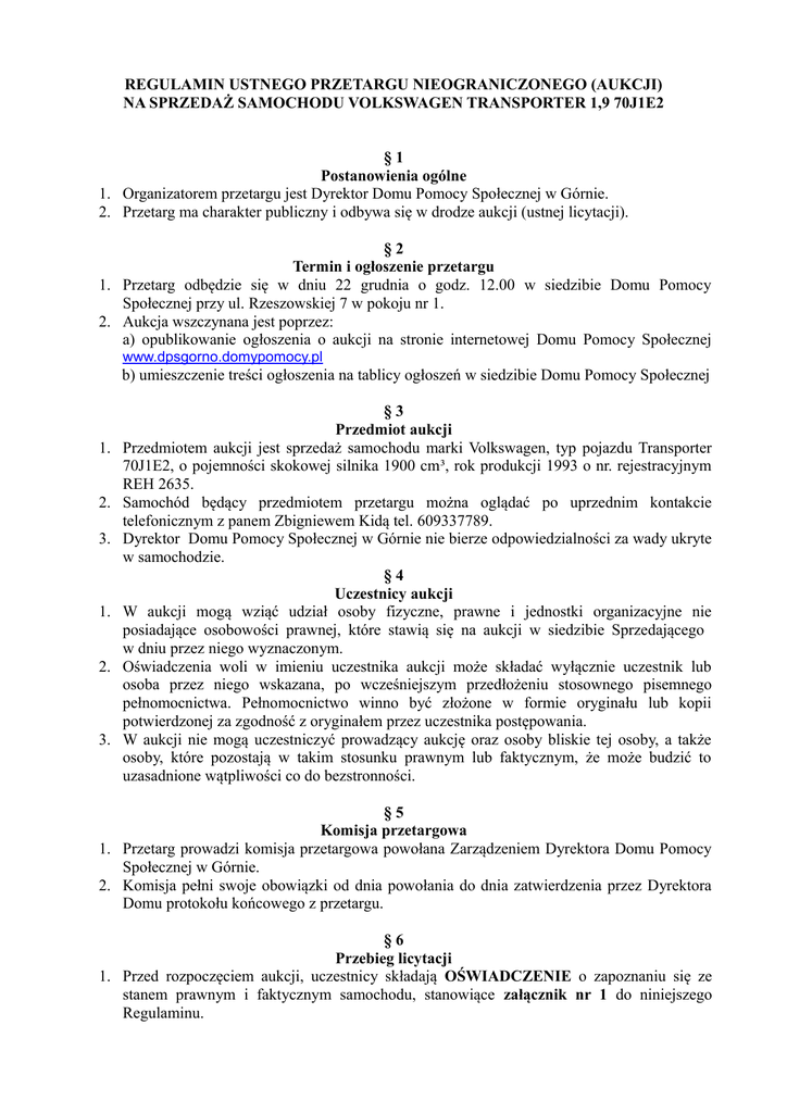 REGULAMIN USTNEGO PRZETARGU NIEOGRANICZONEGO (AUKCJI) NA SPRZEDAŻ SAMOCHODU VOLKSWAGEN TRANSPORTER 1,9 70J1E2 §1 Postanowienia ogólne 1. Organizatorem przetargu jest Dyrektor Domu Pomocy Społecznej w Górnie. 2. Przetarg ma charakter publiczny i odbywa się w drodze aukcji (ustnej licytacji). §2 Termin i ogłoszenie przetargu 1. Przetarg odbędzie się w dniu 22 grudnia o godz. 12.00 w siedzibie Domu Pomocy Społecznej przy ul. Rzeszowskiej 7 w pokoju nr 1. 2. Aukcja wszczynana jest poprzez: a) opublikowanie ogłoszenia o aukcji na stronie internetowej Domu Pomocy Społecznej www.dpsgorno.domypomocy.pl b) umieszczenie treści ogłoszenia na tablicy ogłoszeń w siedzibie Domu Pomocy Społecznej 1. 2. 3. 1. 2. 3. §3 Przedmiot aukcji Przedmiotem aukcji jest sprzedaż samochodu marki Volkswagen, typ pojazdu Transporter 70J1E2, o pojemności skokowej silnika 1900 cm³, rok produkcji 1993 o nr. rejestracyjnym REH 2635. Samochód będący przedmiotem przetargu można oglądać po uprzednim kontakcie telefonicznym z panem Zbigniewem Kidą tel. 609337789. Dyrektor Domu Pomocy Społecznej w Górnie nie bierze odpowiedzialności za wady ukryte w samochodzie. §4 Uczestnicy aukcji W aukcji mogą wziąć udział osoby fizyczne, prawne i jednostki organizacyjne nie posiadające osobowości prawnej, które stawią się na aukcji w siedzibie Sprzedającego w dniu przez niego wyznaczonym. Oświadczenia woli w imieniu uczestnika aukcji może składać wyłącznie uczestnik lub osoba przez niego wskazana, po wcześniejszym przedłożeniu stosownego pisemnego pełnomocnictwa. Pełnomocnictwo winno być złożone w formie oryginału lub kopii potwierdzonej za zgodność z oryginałem przez uczestnika postępowania. W aukcji nie mogą uczestniczyć prowadzący aukcję oraz osoby bliskie tej osoby, a także osoby, które pozostają w takim stosunku prawnym lub faktycznym, że może budzić to uzasadnione wątpliwości co do bezstronności. §5 Komisja przetargowa 1. Przetarg prowadzi komisja przetargowa powołana Zarządzeniem Dyrektora Domu Pomocy Społecznej w Górnie. 2. Komisja pełni swoje obowiązki od dnia powołania do dnia zatwierdzenia przez Dyrektora Domu protokołu końcowego z przetargu. §6 Przebieg licytacji 1. Przed rozpoczęciem aukcji, uczestnicy składają OŚWIADCZENIE o zapoznaniu się ze stanem prawnym i faktycznym samochodu, stanowiące załącznik nr 1 do niniejszego Regulaminu. 2. Przed rozpoczęciem aukcji członkowie komisji przetargowej zbierają informacje o danych osobowych uczestników przetargu. Spisują numery dokumentów tożsamości, zbierają pełnomocnictwa (jeśli będą potrzebne) oraz w przypadku osób prawnych i innych jednostek organizacyjnych nie posiadających osobowości prawnej – aktualne wypisy z właściwych rejestrów. Komisja sprawdza również prawidłowość złożonego oświadczenia. 3. Aukcję prowadzi przewodniczący komisji przetargowej. 4. Po otwarciu licytacji prowadzący aukcję podaje licytantom do wiadomości: a) przedmiot aukcji, b) cenę wywoławczą, c) warunki dotyczące wysokości postąpienia, d) termin podpisania umowy i uiszczenia ceny nabycia, e) nazwy lub imiona i nazwiska licytantów, którzy zostali dopuszczeni do aukcji, 5. Stawienie się jednego uczestnika pozwala na przeprowadzenie aukcji. 6. Licytacja rozpoczyna się od podania ceny wywoławczej. 7. Ustala się minimalną wysokość postąpienia w wysokości 50 zł. Zaoferowana cena przestaje wiązać, gdy inny licytant zaoferował cenę wyższą. 8. Po ustaniu postąpień prowadzący aukcję uprzedzając licytantów, po trzecim ogłoszeniu zamyka aukcję i udziela przybicia licytantowi, który zaoferował najwyższą cenę. Z chwilą przybicia następuje zawarcie umowy sprzedaży przedmiotu aukcji. 9. Nabywca ponosi wszystkie koszty dotyczące pokrycia zobowiązań związanych z przeniesieniem prawa własności przedmiotu przetargu. 10. Nabywca jest zobowiązany zapłacić cenę nabycia niezwłocznie po udzieleniu mu przybicia, po uprzednim zawarciu umowy sprzedaży. 11. Przekazanie przedmiotu aukcji nabywcy nastąpi niezwłocznie po zapłaceniu ceny nabycia. 12. Jeśli pierwszy przetarg nie zostanie zakończony zawarciem umowy sprzedaży, ogłasza się drugi przetarg. §7 Protokół 1. Po zakończeniu aukcji komisja sporządza i podpisuje protokół z przeprowadzonego postępowania. Data jego podpisania jest datą zakończenia przetargu. Protokół z przebiegu aukcji powinien zawierać: a) datę i miejsce aukcji, b) imiona i nazwiska oraz podpisy członków komisji przetargowej, c) wysokość ceny wywoławczej, d) wysokość najwyższej wylicytowanej kwoty za przedmiot aukcji, e) imię i nazwisko (firmę) i miejsce zamieszkania nabywcy lub jego siedzibę, f) wysokość ceny nabycia i oznaczenie kwoty, jaką nabywca uiścił na poczet ceny, g) wnioski i oświadczenia członków komisji przetargowej. 2. Protokół zatwierdza Dyrektor Domu Pomocy Społecznej w Górnie. 3. Organizator przetargu może go unieważnić lub odwołać bez podania przyczyn. §8 Warunki odbioru samochodu 1. Wydanie przedmiotu sprzedaży nabywcy następuje niezwłocznie po podpisaniu umowy kupna - sprzedaży i zapłaceniu ceny nabycia. Załączniki do Regulaminu: 1. załącznik nr 1 – formularz oświadczenia 2. załącznik nr 2 – wzór umowy Załącznik nr 1 do Regulaminu ustnego przetargu nieograniczonego (aukcji) na sprzedaż samochodu OŚWIADCZENIE ….......................................................................................................................................................... Nabywca (imię i nazwisko lub nazwa firmy) ….......................................................................................................................................................... NIP, Regon (jeśli dotyczy) lub nr dowodu osobistego w przypadku osób fizycznych ….................................................................................................................